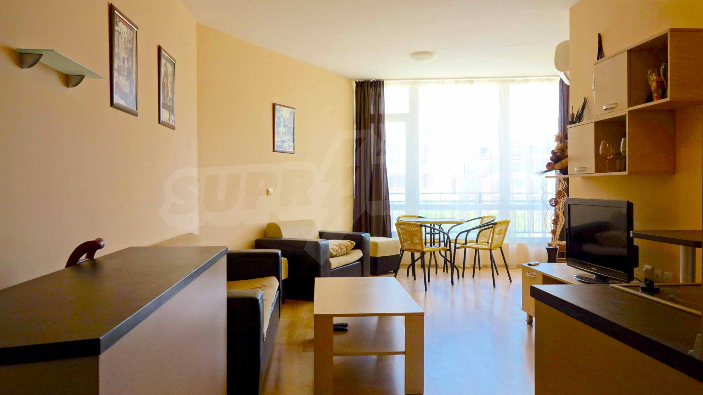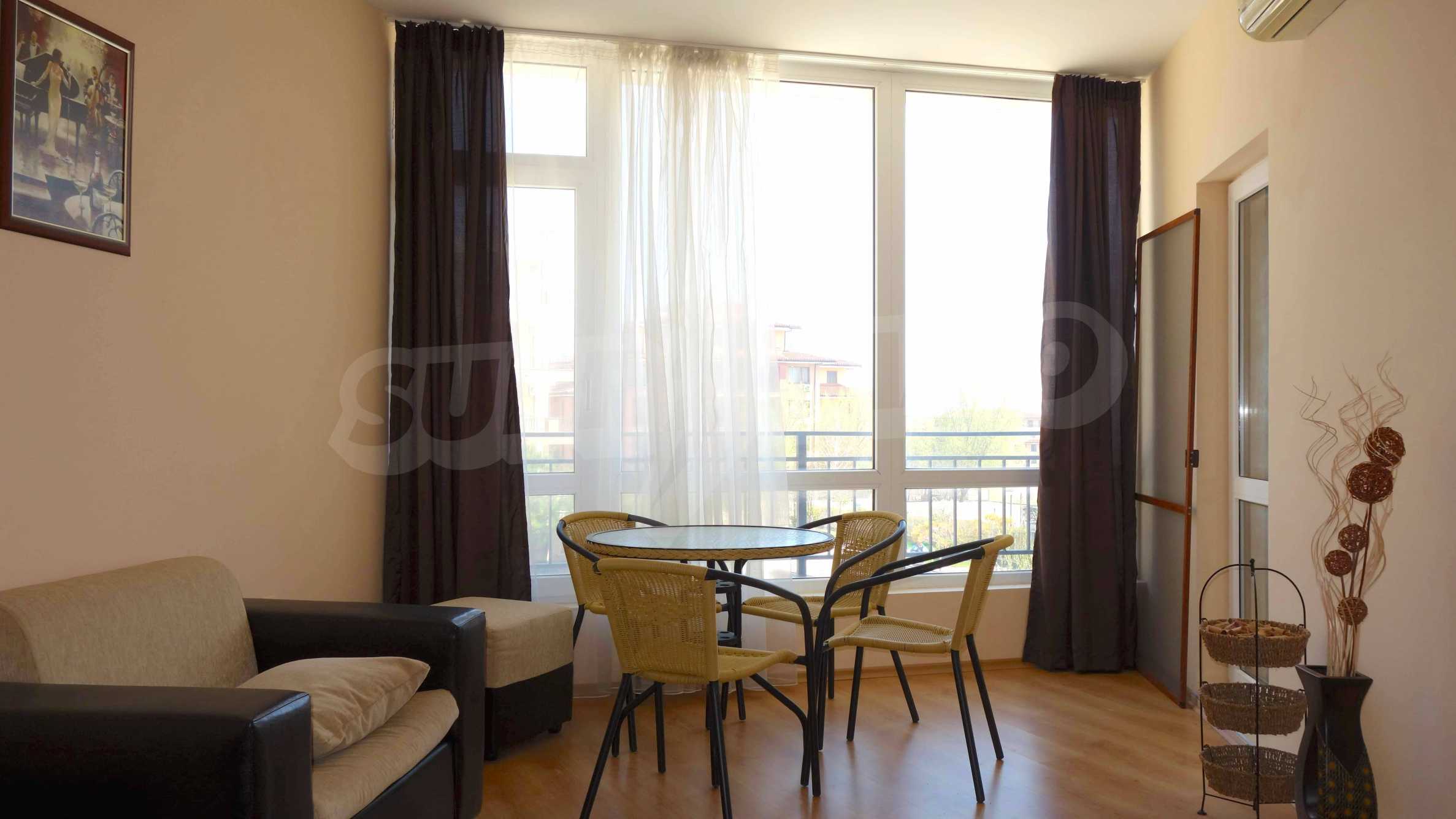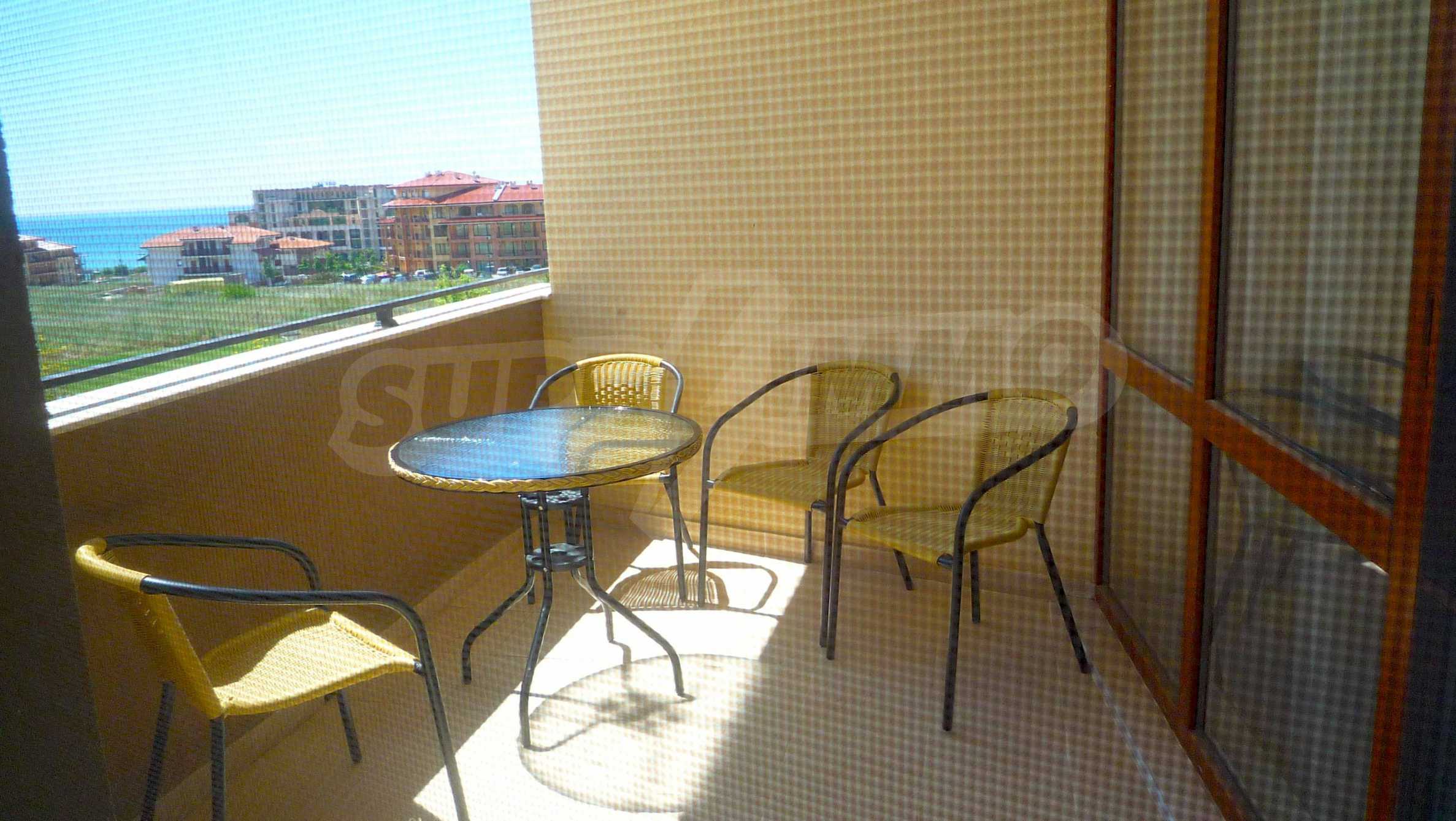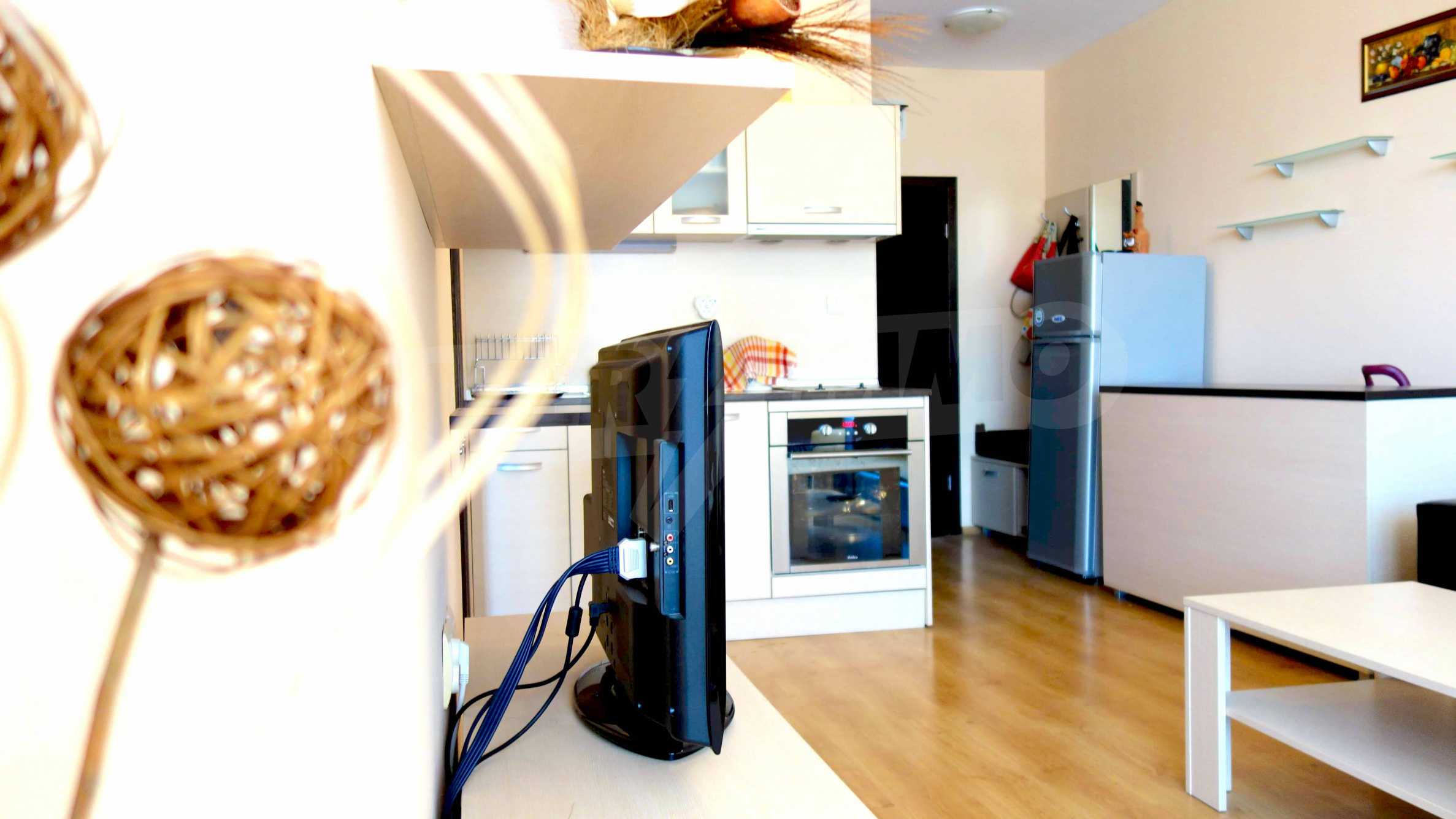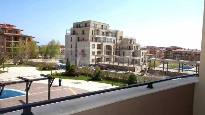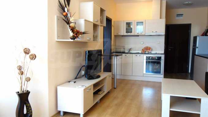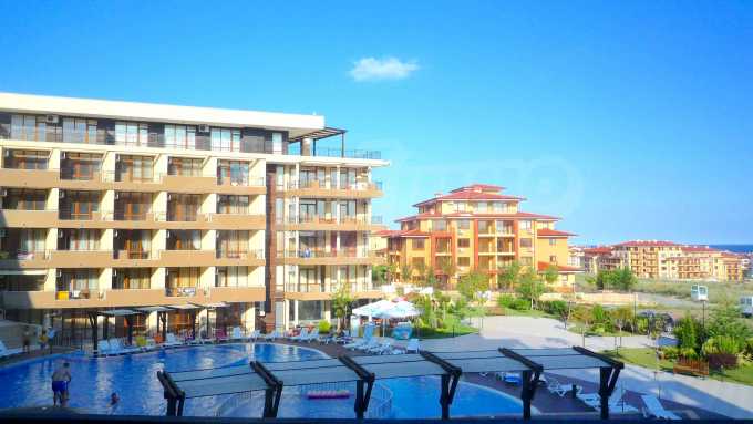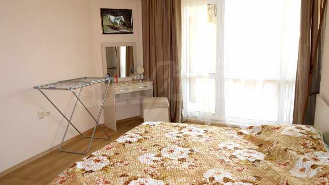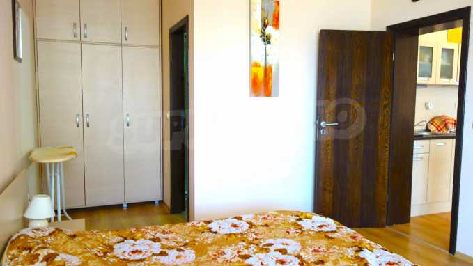 Описваното жилището заема обща площ от 78.33 кв.м., от които чистата площ е 65.36 кв.м. и общи части 12.97 кв.м. Състои се от просторна дневна с кухненски бокс и една спалня, баня с тоалетна и душ кабина и балкон с гледка към вътрешния двор и басейна на комплекса и частична гледка към морския бряг. Кухнята е оборудвана с хладилник, фурна, електрически котлони, аспиратор, маса, столове; всекидневната - диван, фотьойл, телевизор и маса; спалнята - легло, гардероб, тоалетка, нощни шкафчета. Апартаментът е удобен и уютен, изцяло оборудван и мебелиран. Продава се напълно обзаведен, с климатик и окабеляване за интернет и кабелна телевизия. Имотът е подходящ за краткосрочно и дългосрочно отдаване под наем.