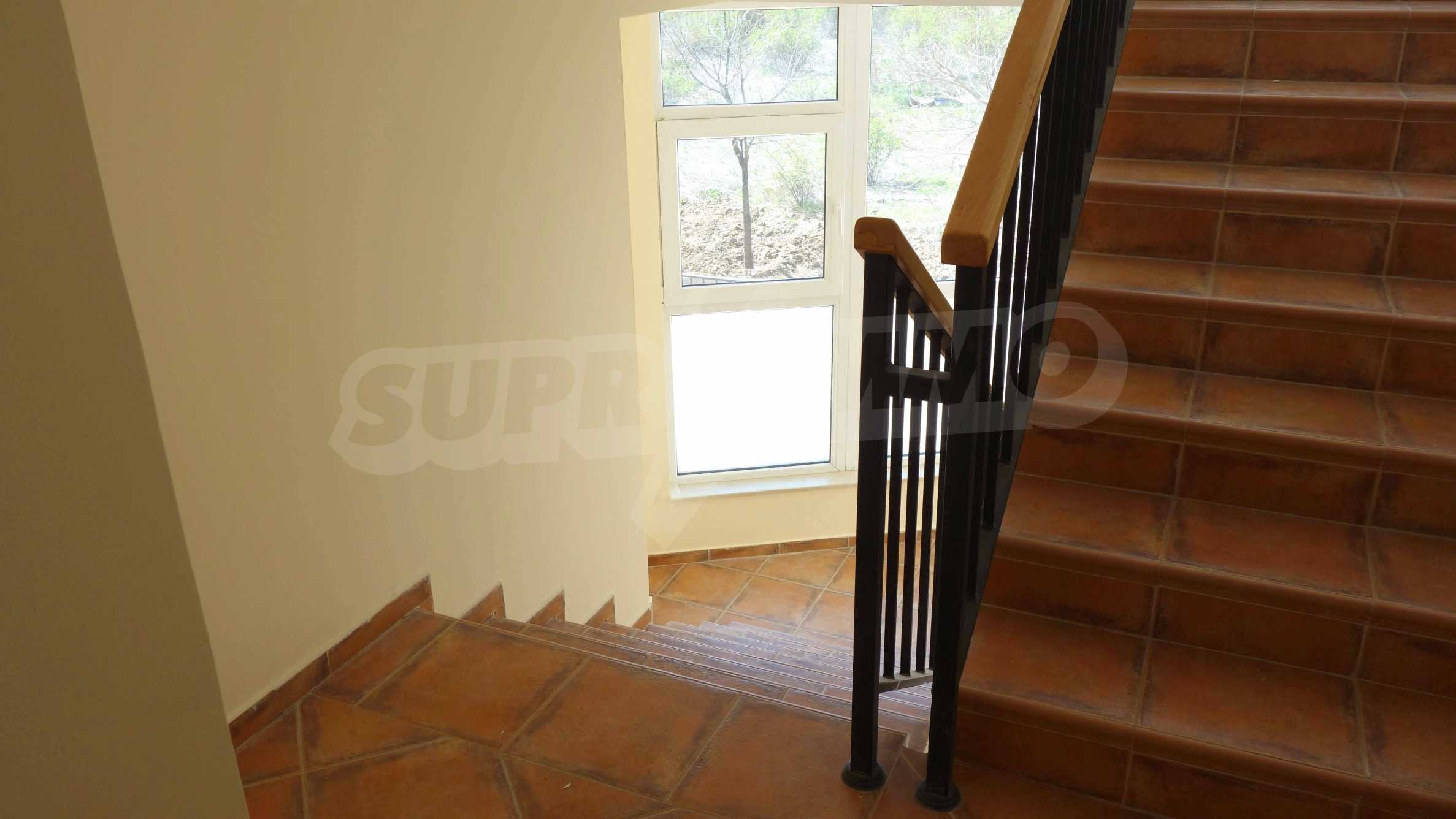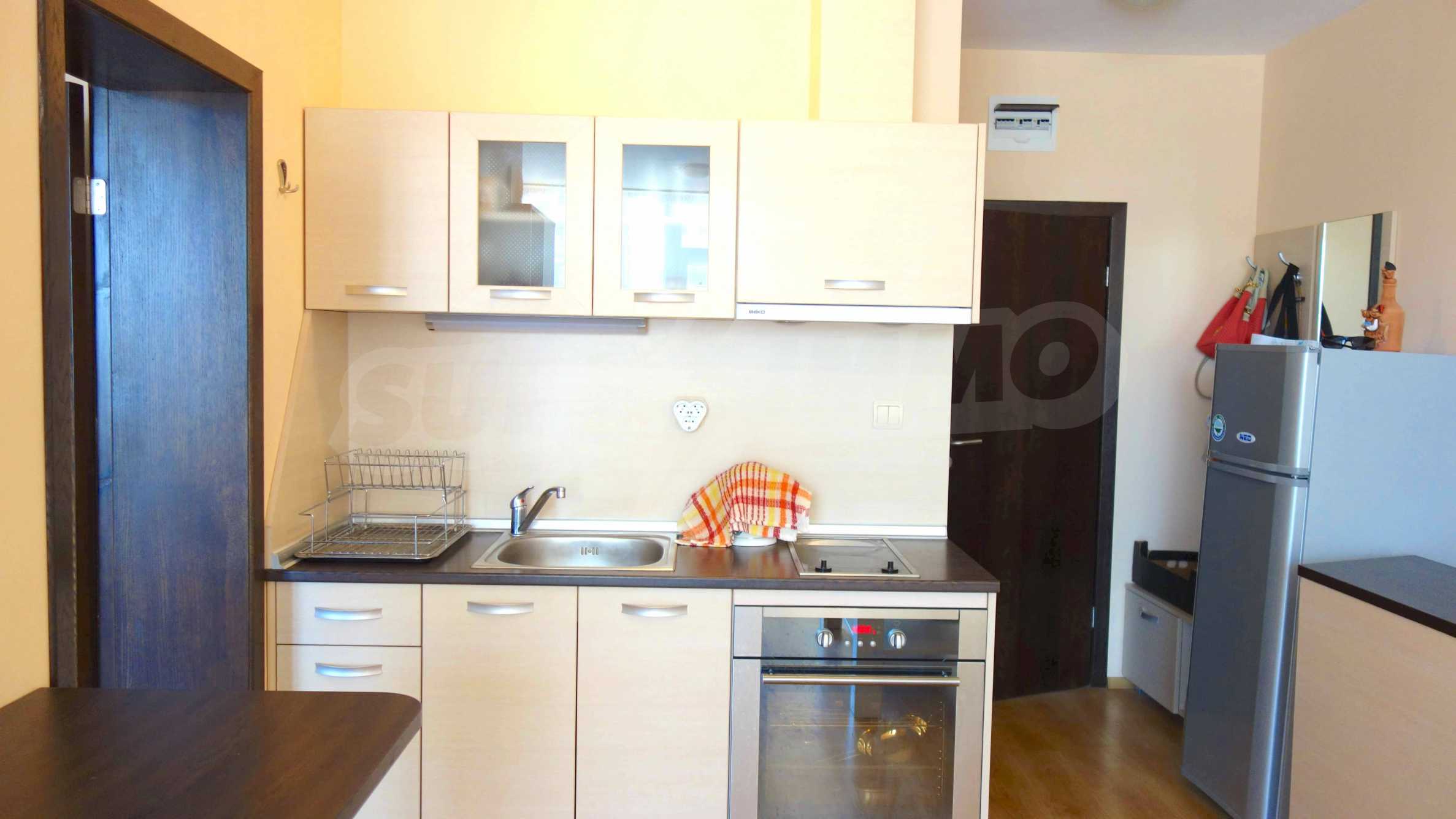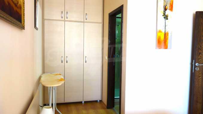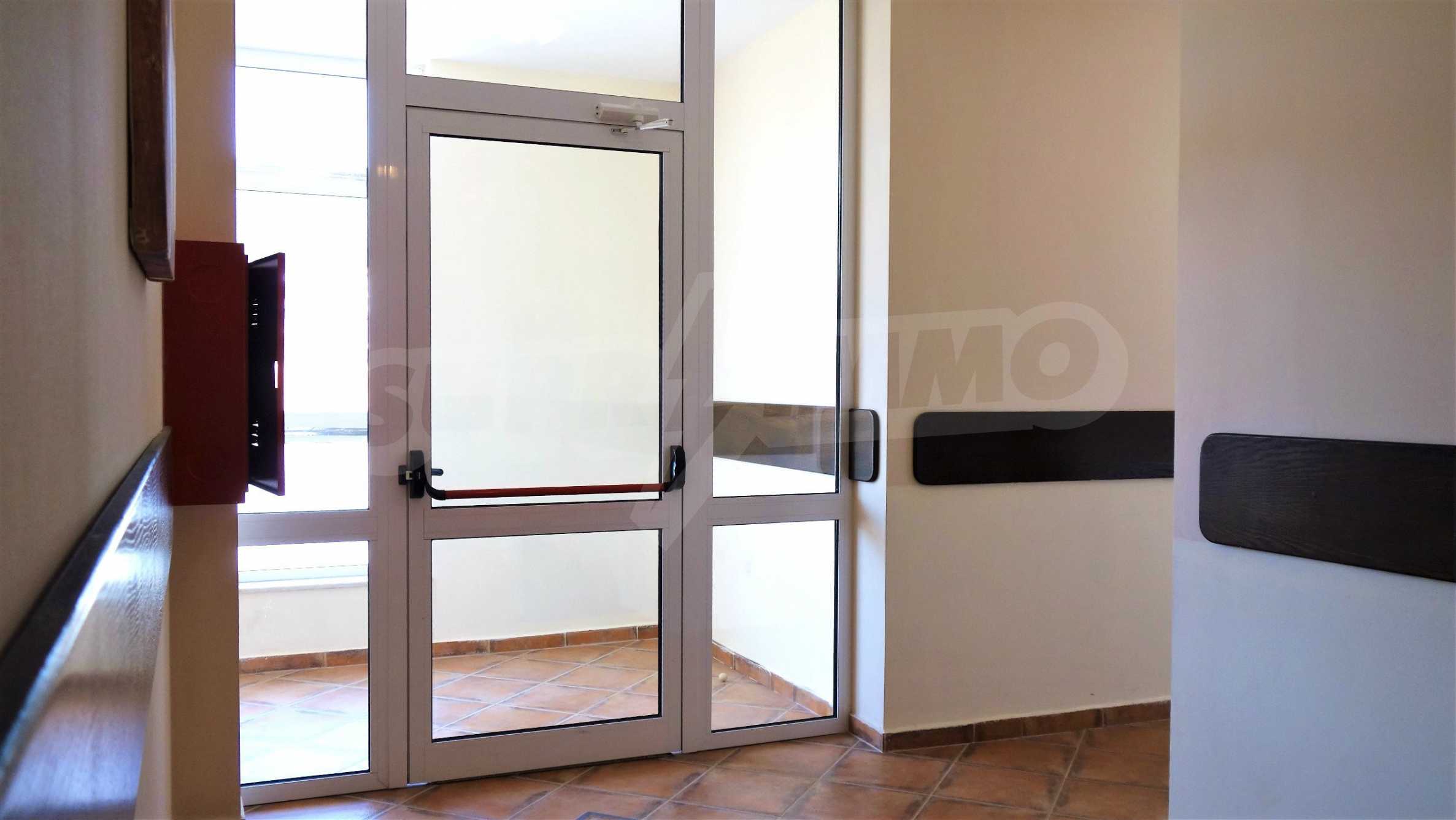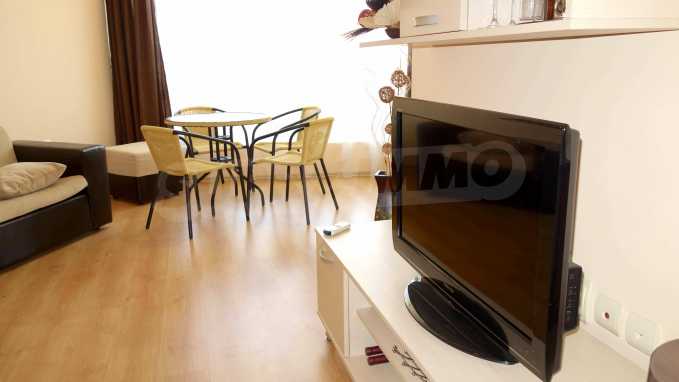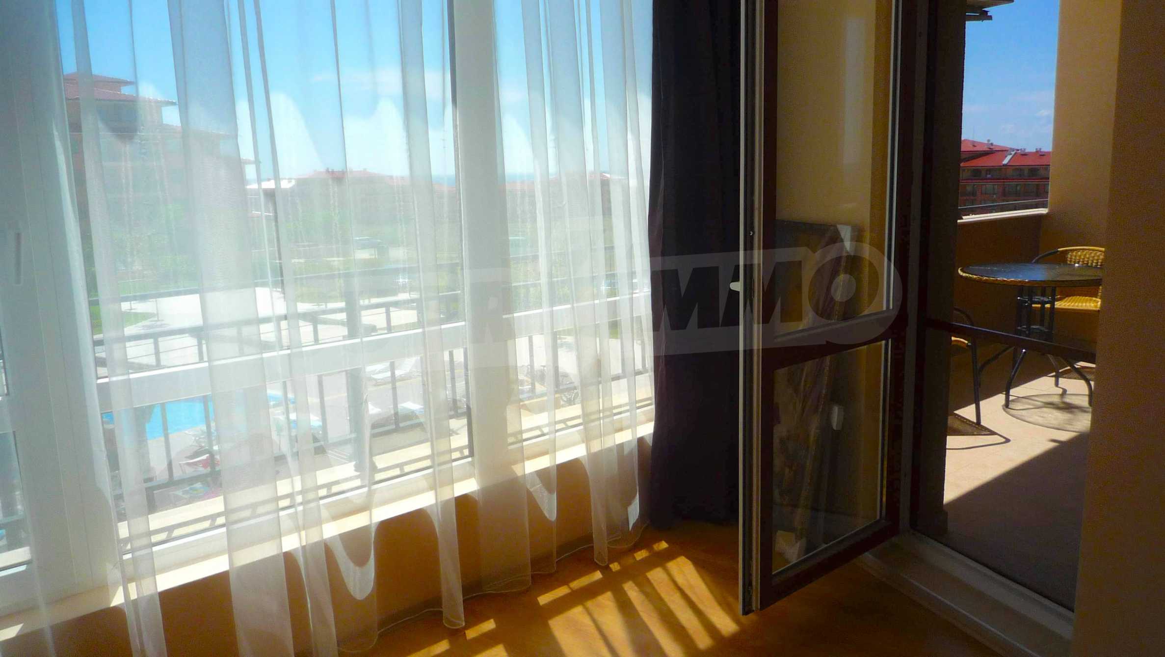 Описваното жилището заема обща площ от 78.33 кв.м., от които чистата площ е 65.36 кв.м. и общи части 12.97 кв.м. Състои се от просторна дневна с кухненски бокс и една спалня, баня с тоалетна и душ кабина и балкон с гледка към вътрешния двор и басейна на комплекса и частична гледка към морския бряг. Кухнята е оборудвана с хладилник, фурна, електрически котлони, аспиратор, маса, столове; всекидневната - диван, фотьойл, телевизор и маса; спалнята - легло, гардероб, тоалетка, нощни шкафчета. Апартаментът е удобен и уютен, изцяло оборудван и мебелиран. Продава се напълно обзаведен, с климатик и окабеляване за интернет и кабелна телевизия. Имотът е подходящ за краткосрочно и дългосрочно отдаване под наем.