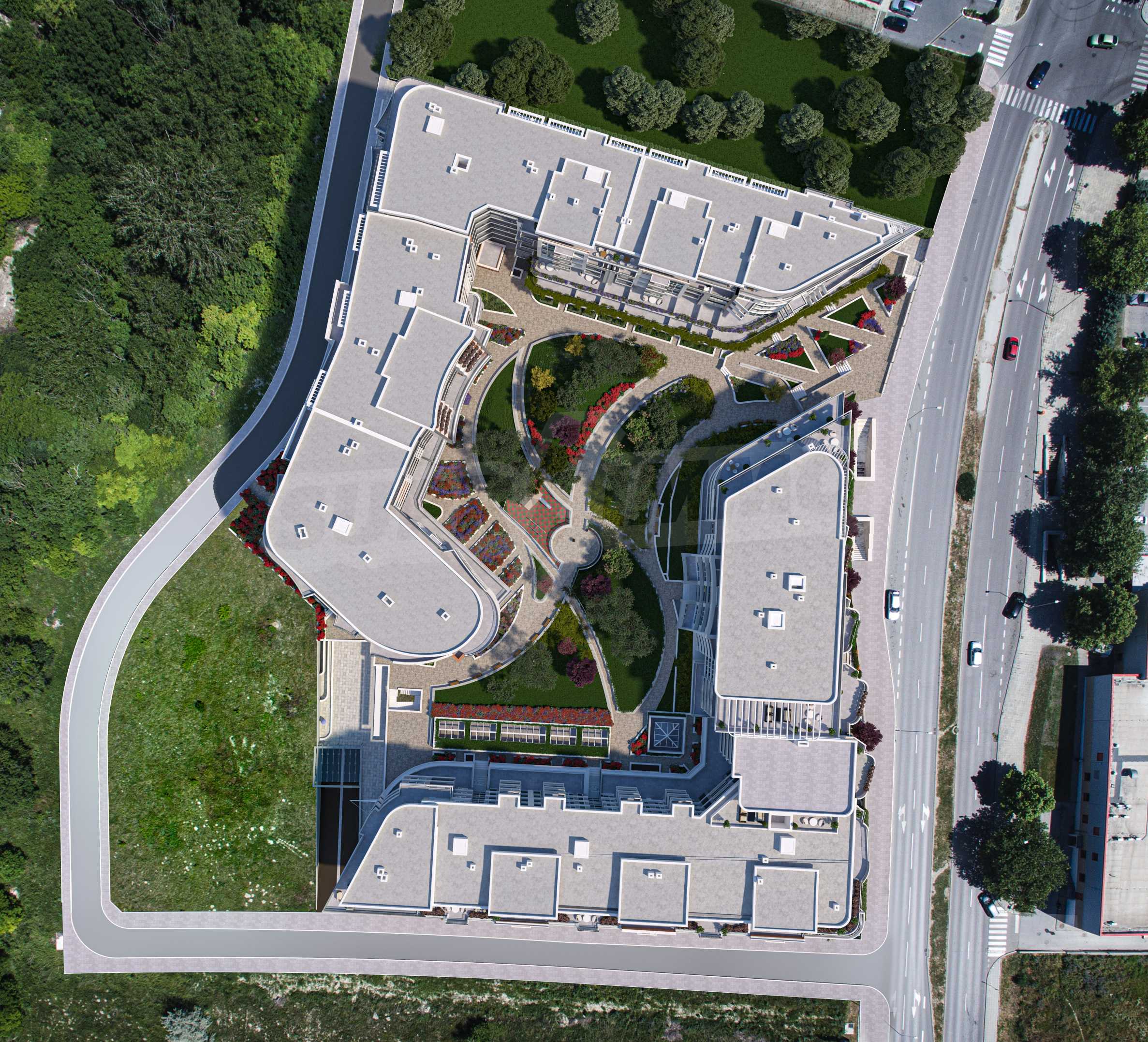 Концепцията на проекта е защитена, комфортна и озеленена жилищна среда.