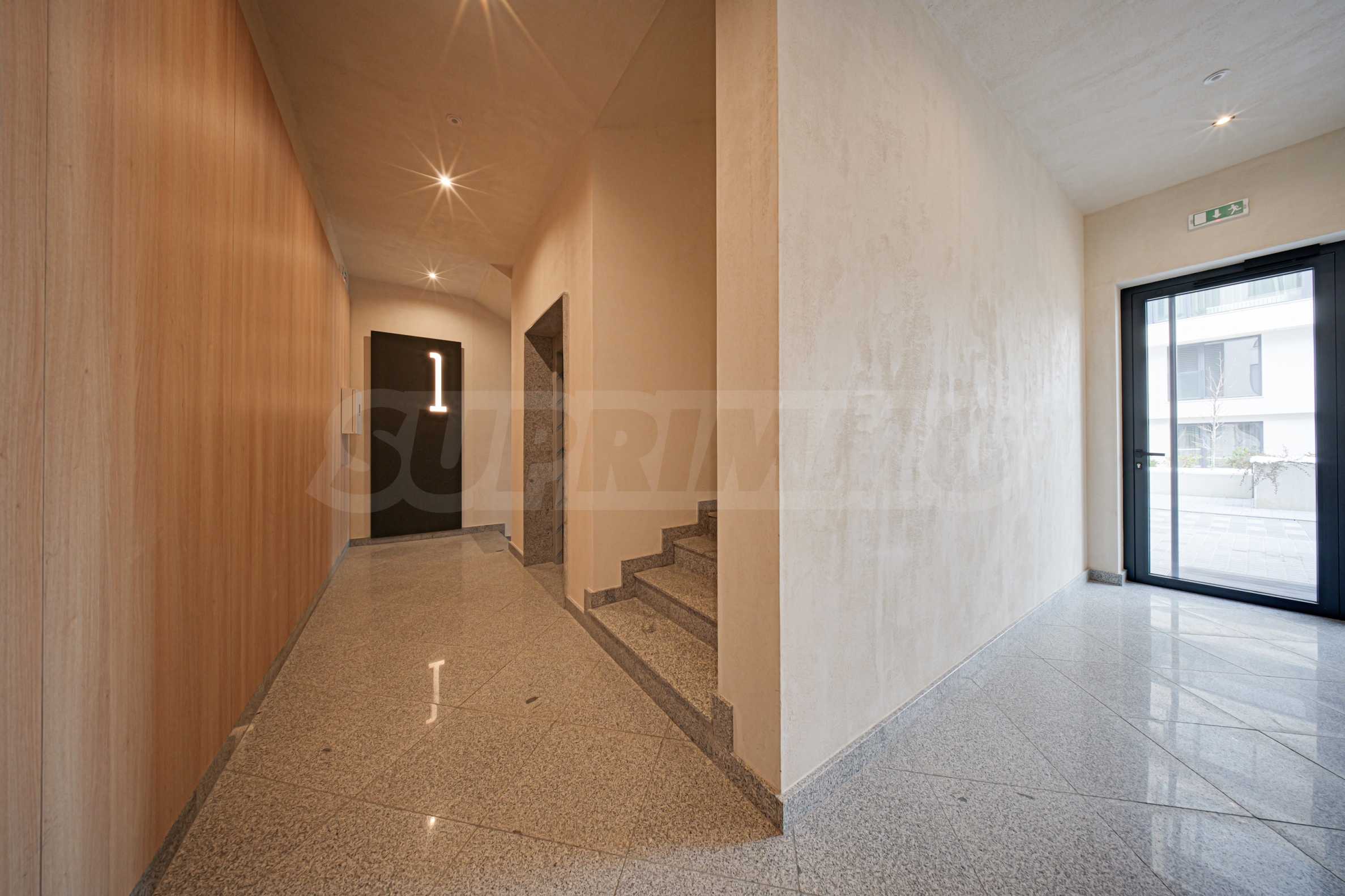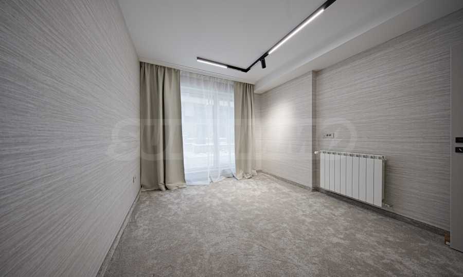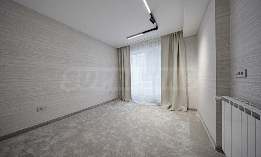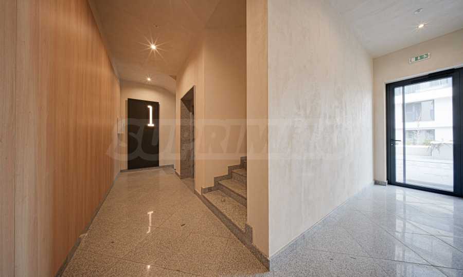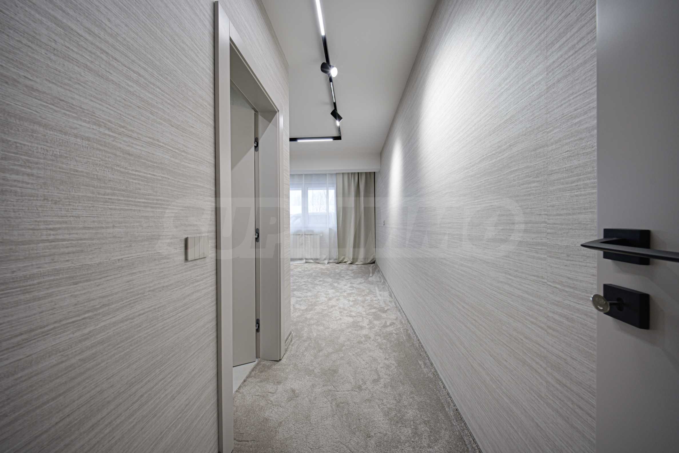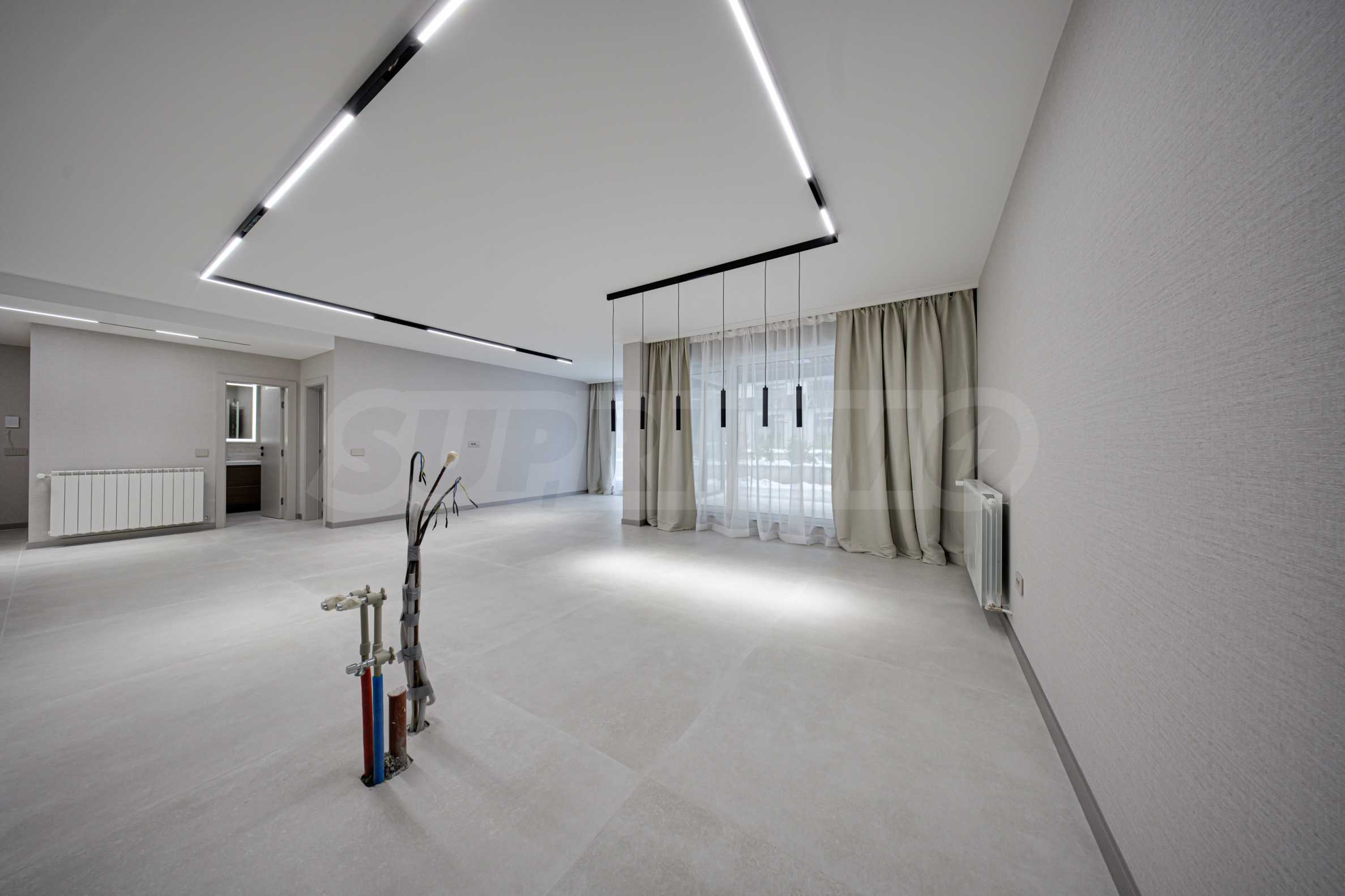 Апартаментът се предлага завършен с висок клас довършителни работи и заема партерен етаж от общо 10 етажа. Подовите настилки са от гранитогрес и мокет с дълъг косъм в спалните, а стените са покрити с висококачествени тапети. Интериорни врати МДФ със скрити панти и магнитно затваряне. Отоплителната система е изградена с газов котел Bosch и монтирани радиатори, мултисплит климатична система с вградени климатици Mitsubishi Heavy Industries и допълнителен бойлер за топла вода. Напълно завършени санитарни помещения със смесители Grohe.