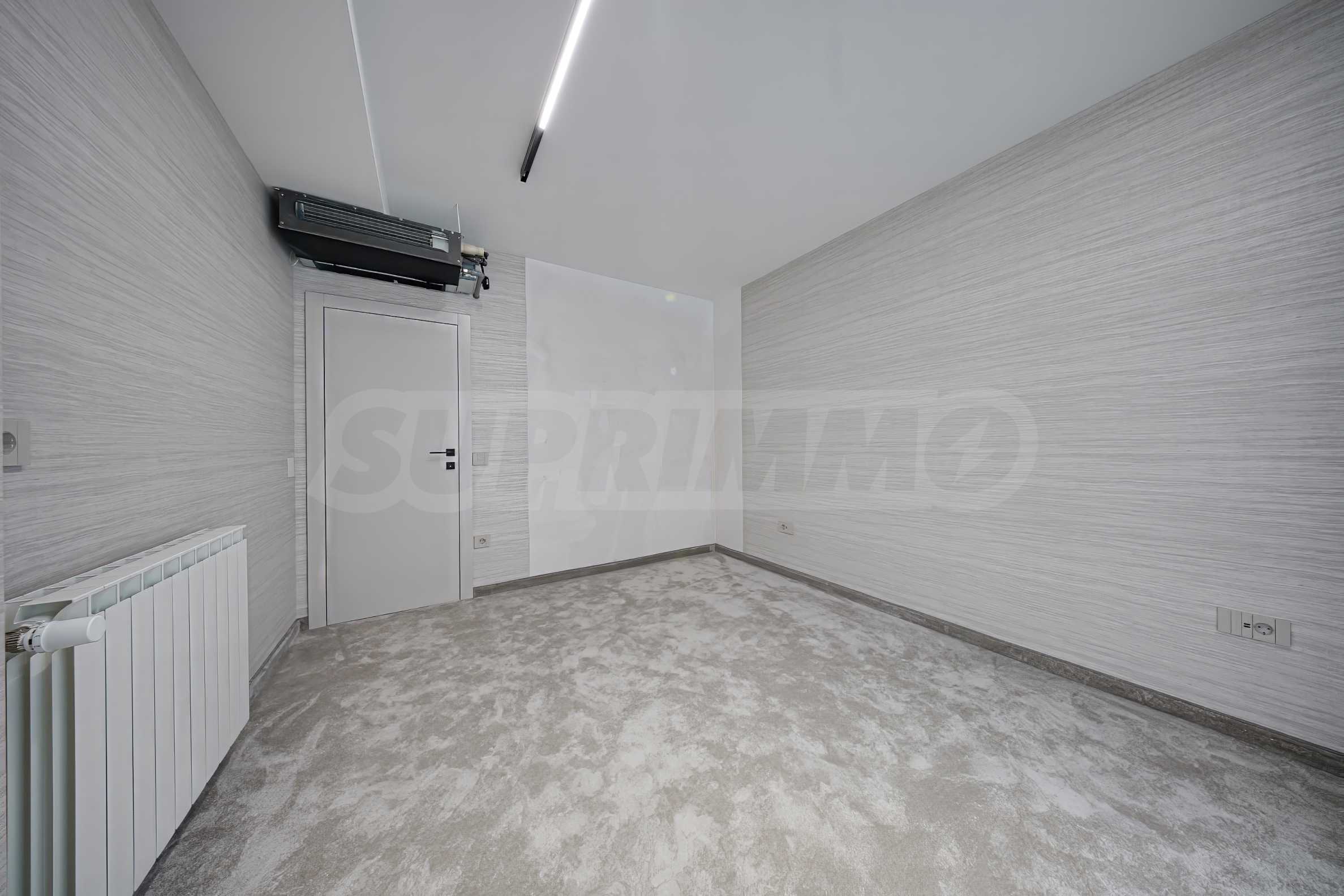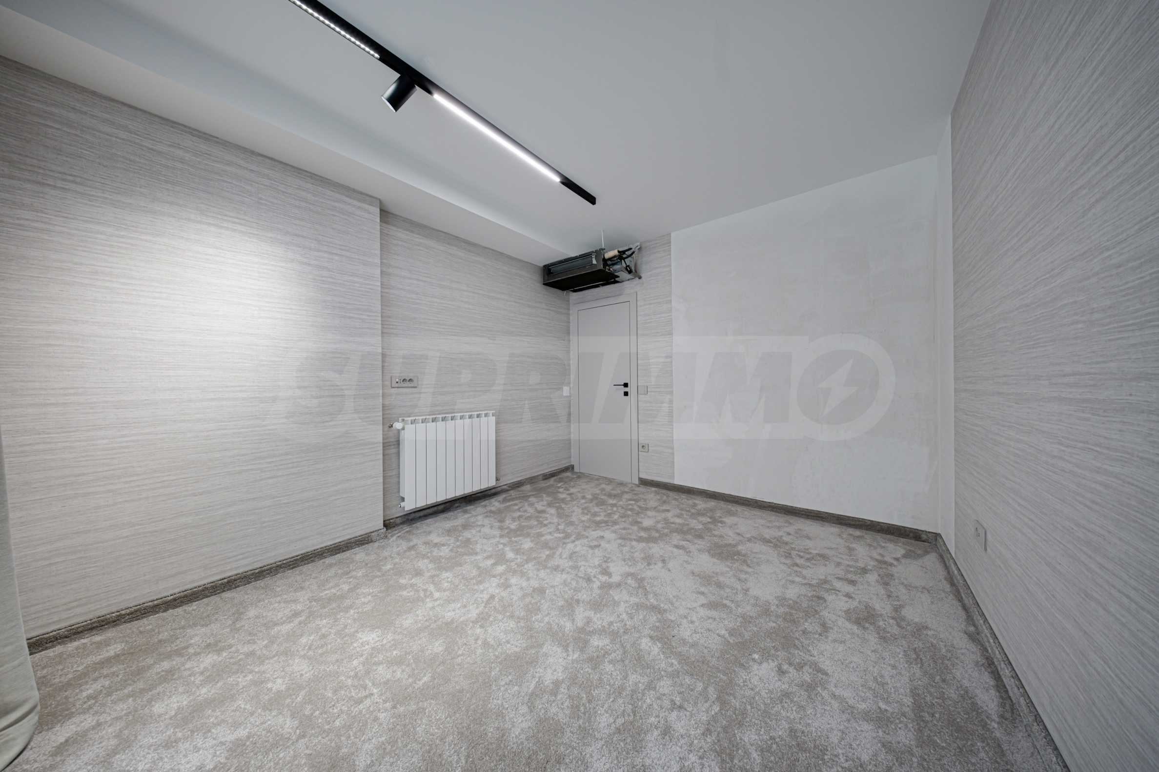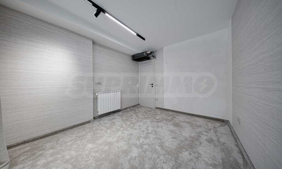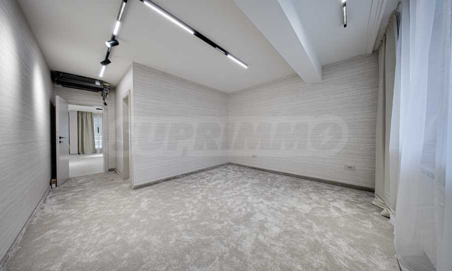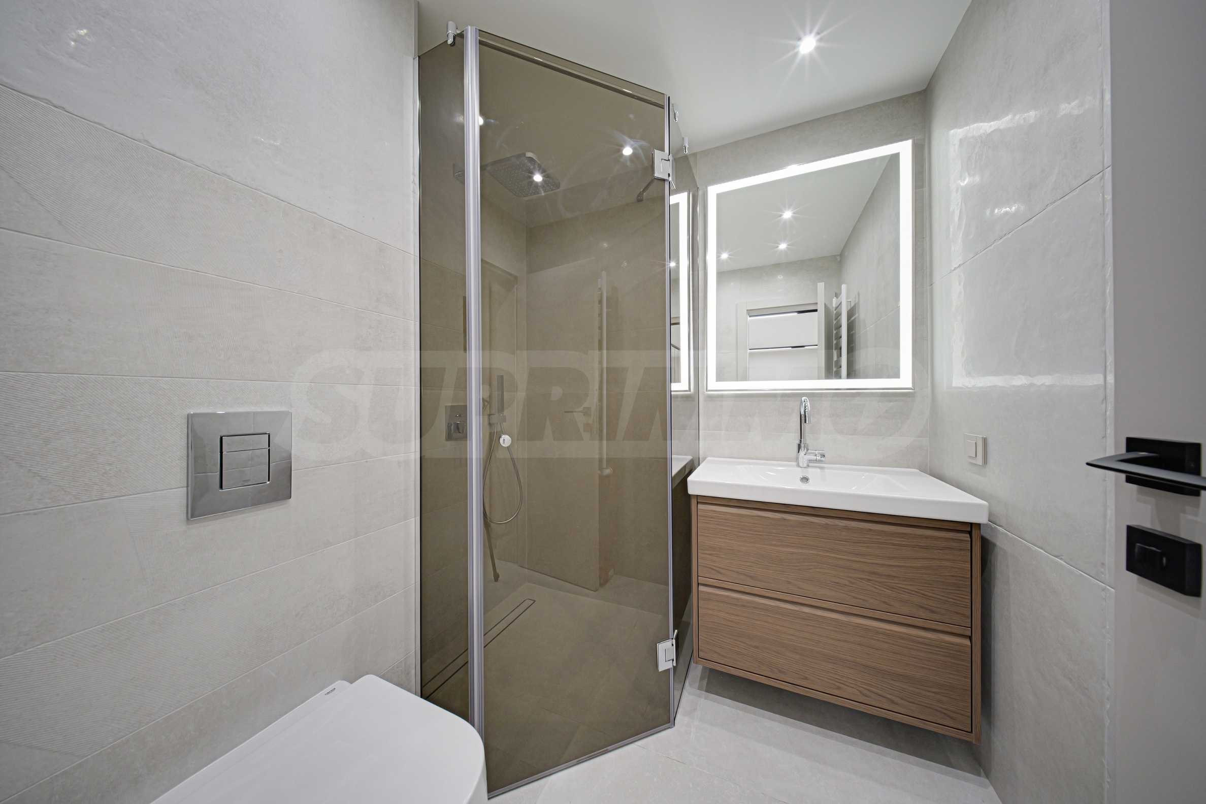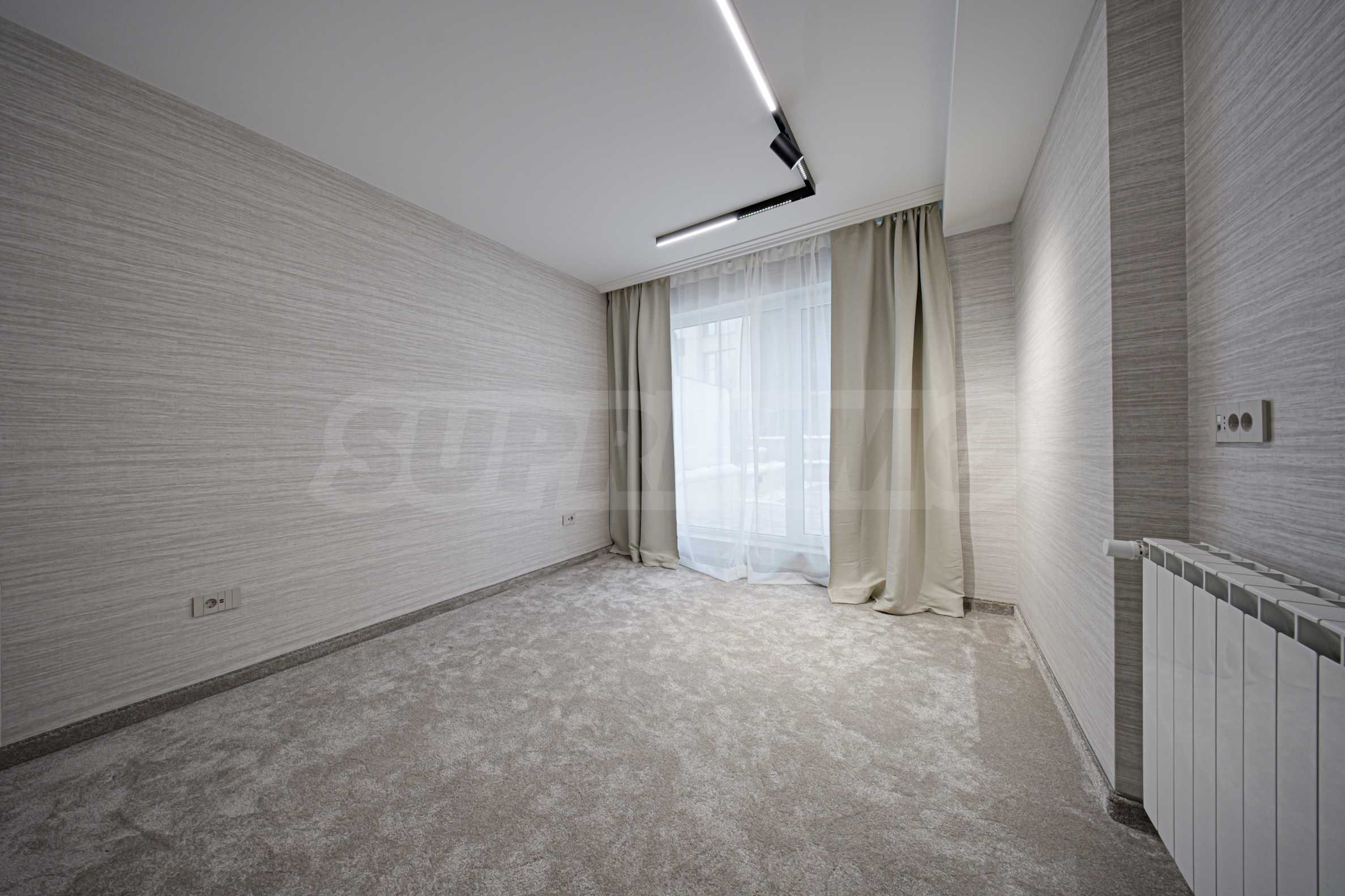 Апартаментът се предлага завършен с висок клас довършителни работи и заема партерен етаж от общо 10 етажа. Подовите настилки са от гранитогрес и мокет с дълъг косъм в спалните, а стените са покрити с висококачествени тапети. Интериорни врати МДФ със скрити панти и магнитно затваряне. Отоплителната система е изградена с газов котел Bosch и монтирани радиатори, мултисплит климатична система с вградени климатици Mitsubishi Heavy Industries и допълнителен бойлер за топла вода. Напълно завършени санитарни помещения със смесители Grohe.