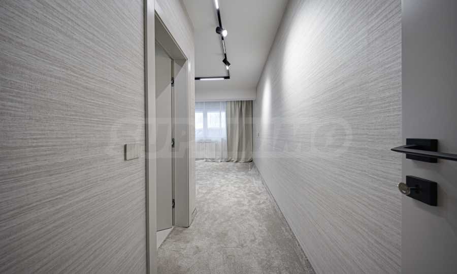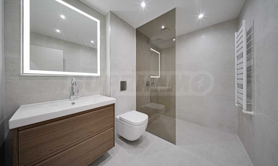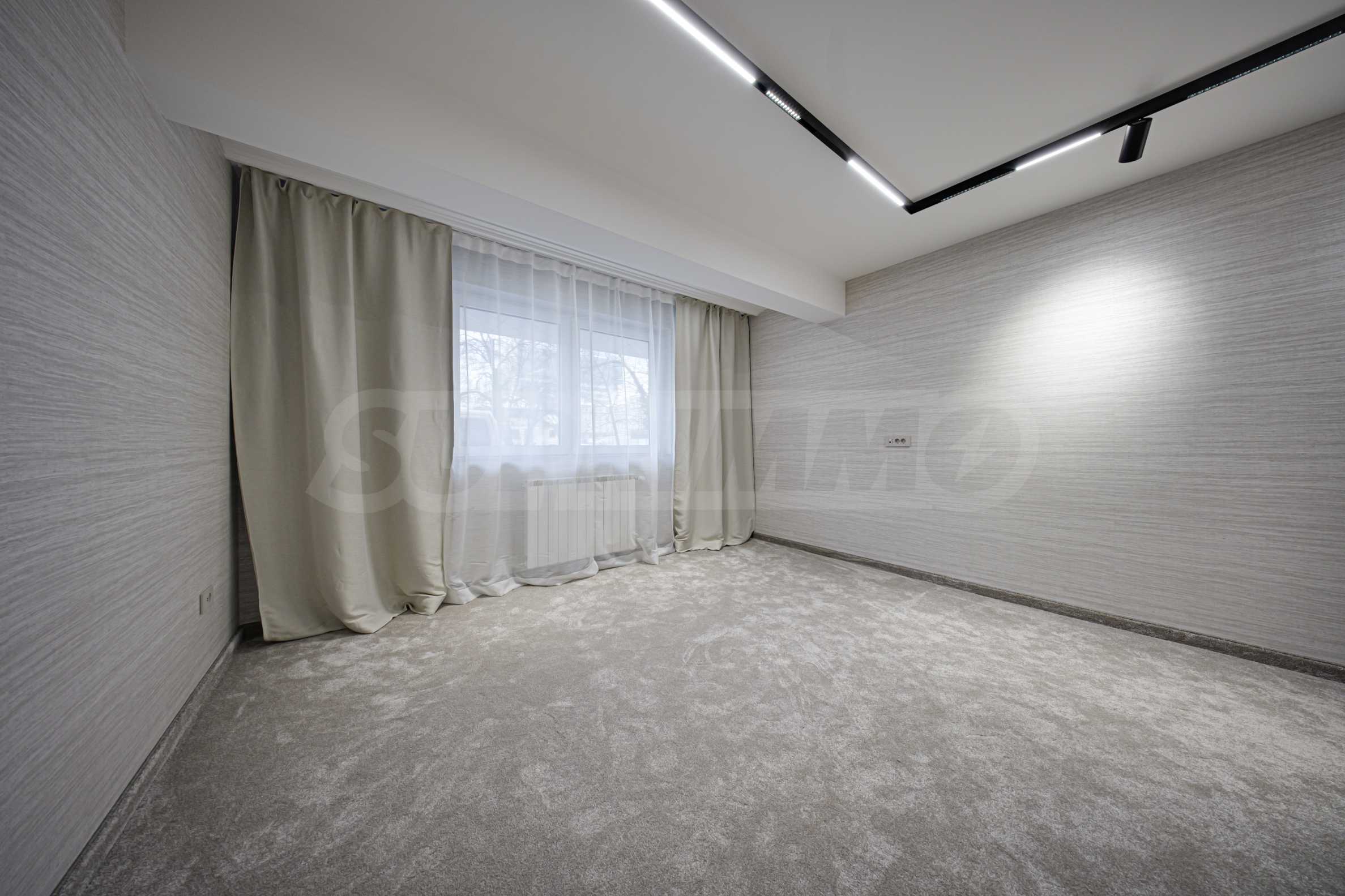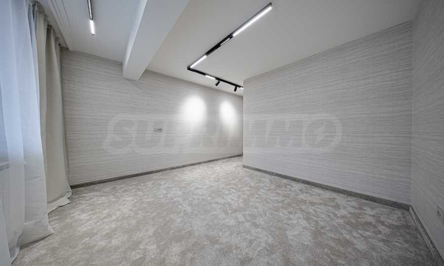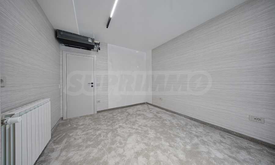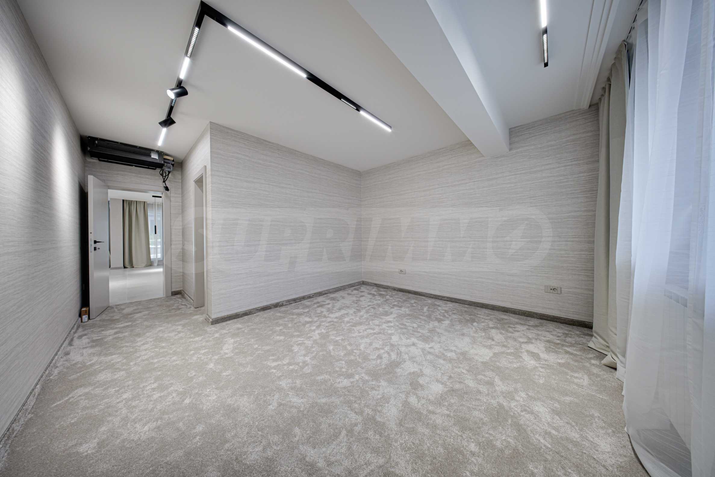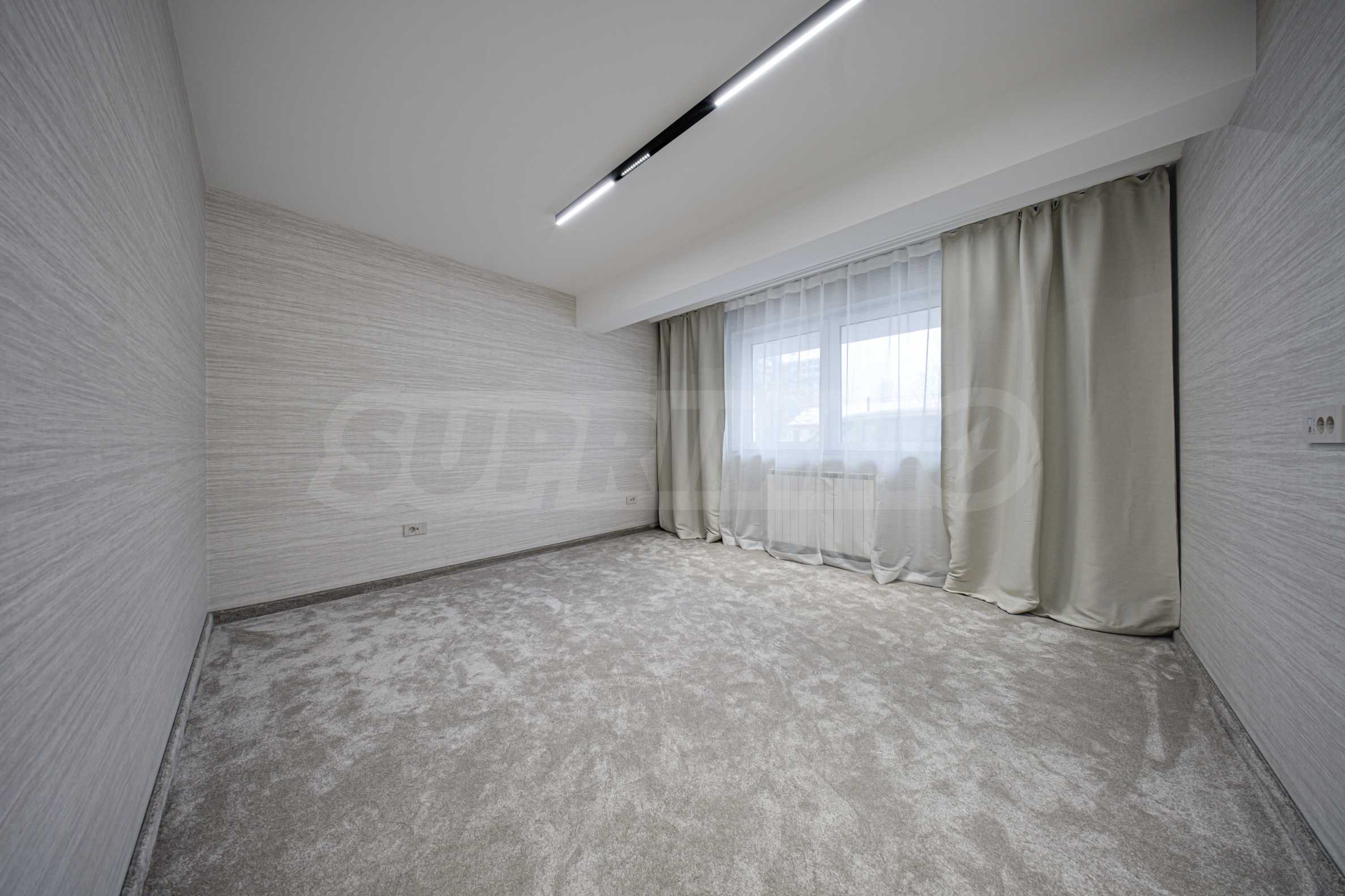 Апартаментът се предлага завършен с висок клас довършителни работи и заема партерен етаж от общо 10 етажа. Подовите настилки са от гранитогрес и мокет с дълъг косъм в спалните, а стените са покрити с висококачествени тапети. Интериорни врати МДФ със скрити панти и магнитно затваряне. Отоплителната система е изградена с газов котел Bosch и монтирани радиатори, мултисплит климатична система с вградени климатици Mitsubishi Heavy Industries и допълнителен бойлер за топла вода. Напълно завършени санитарни помещения със смесители Grohe.