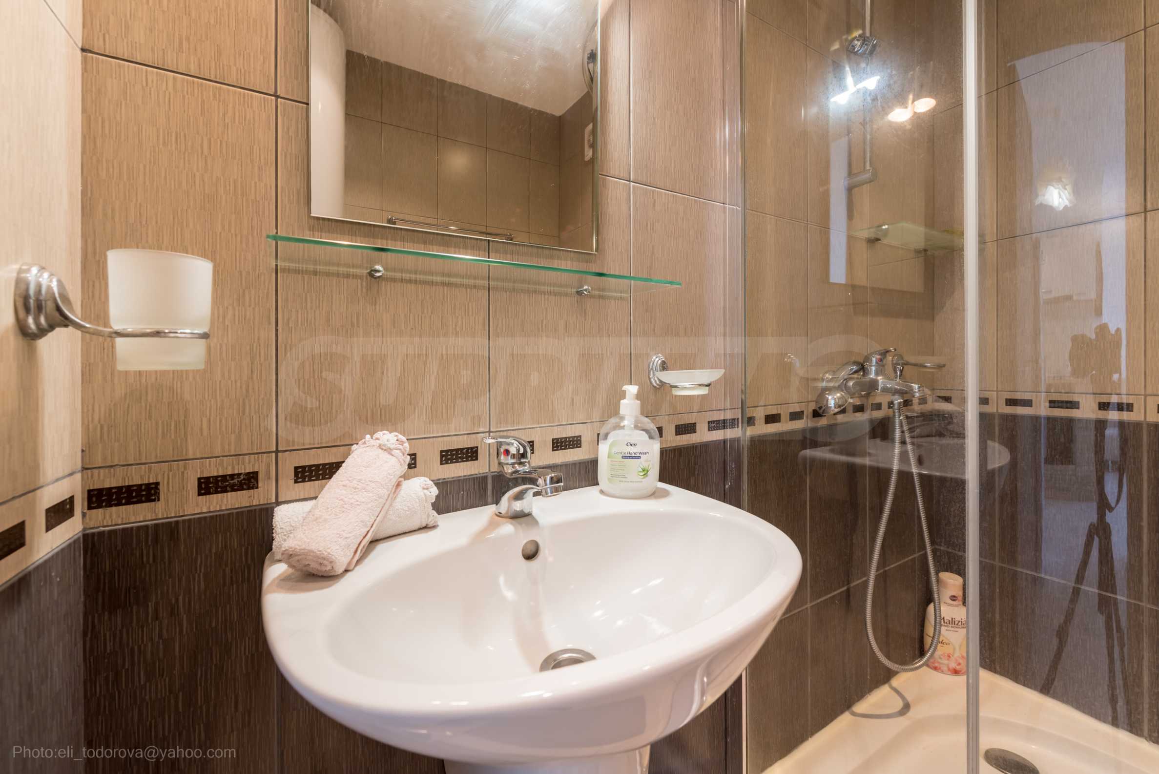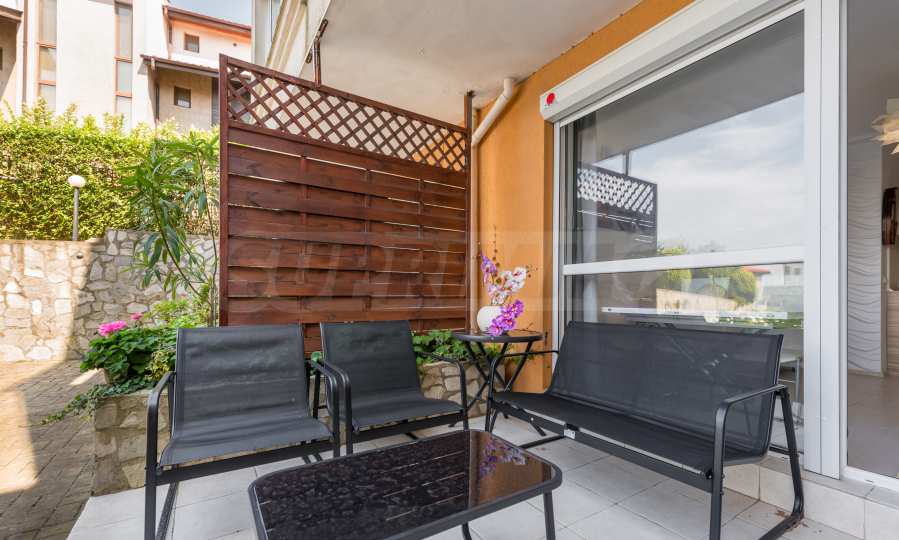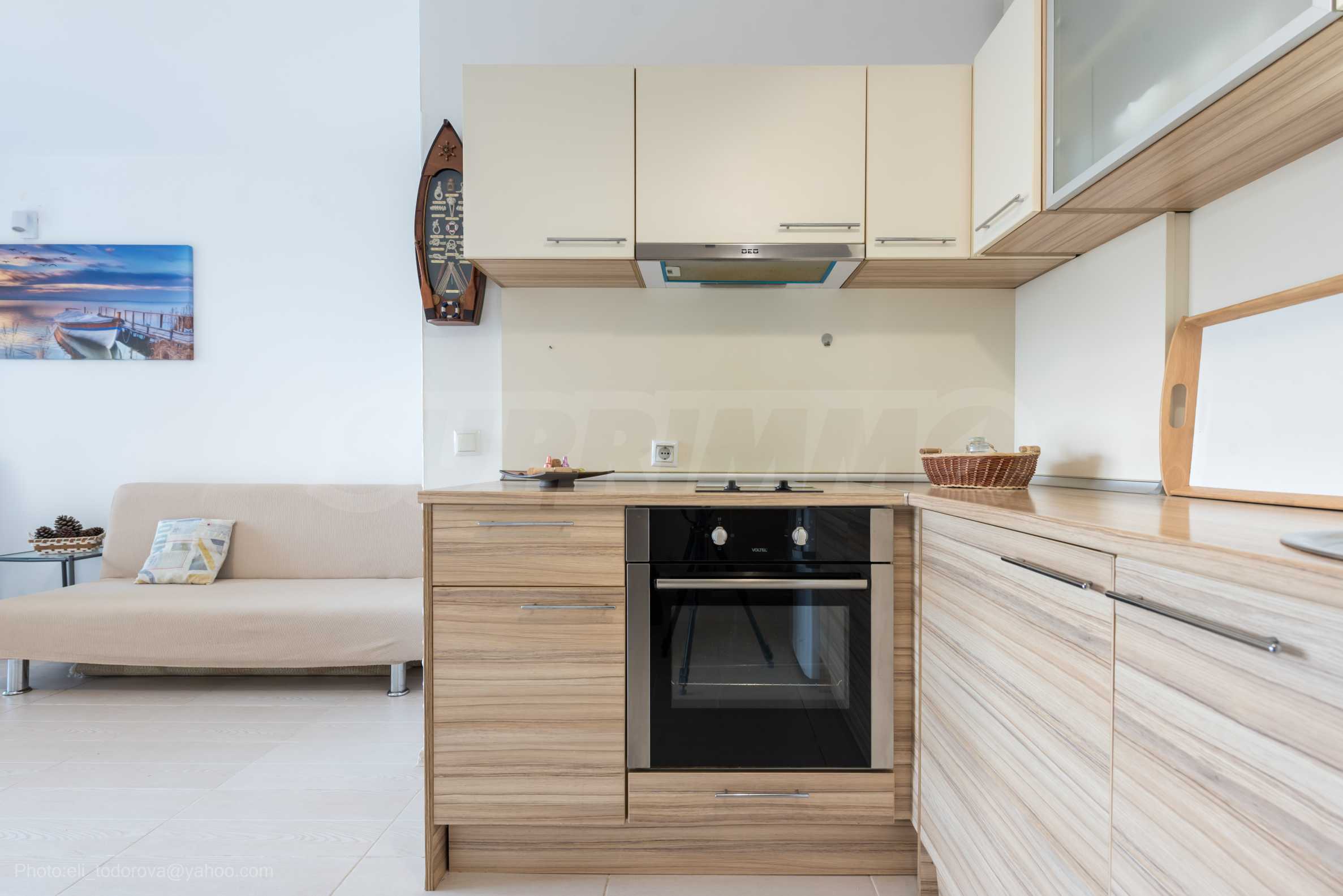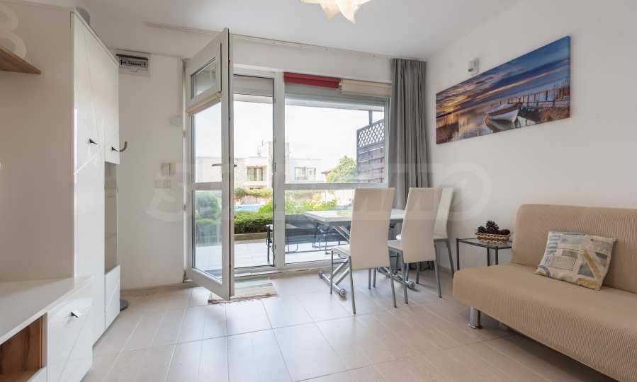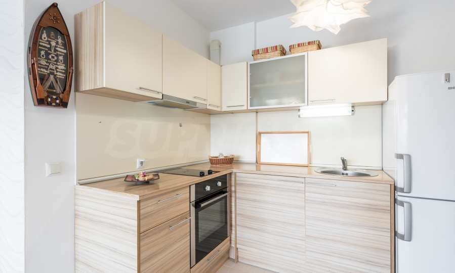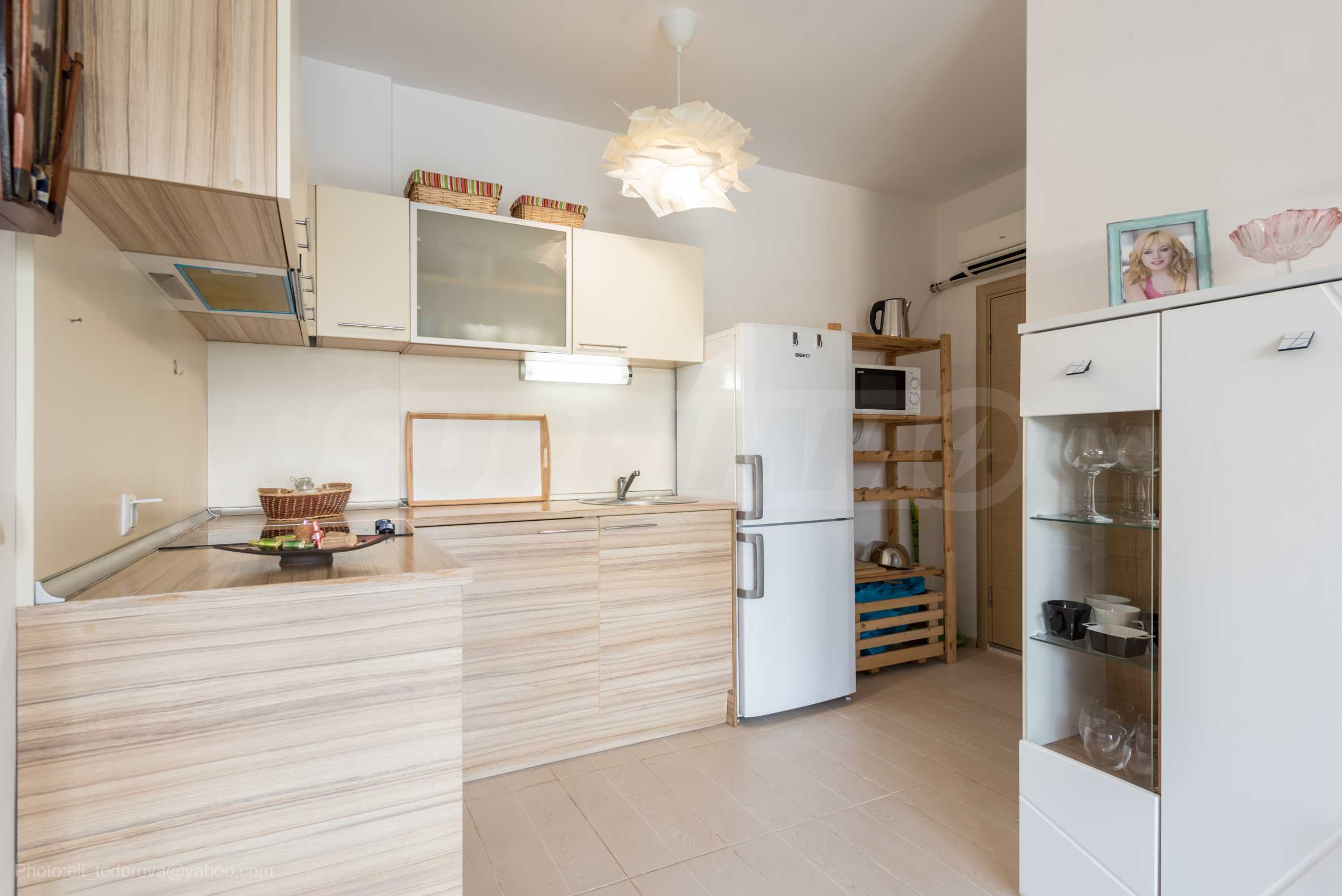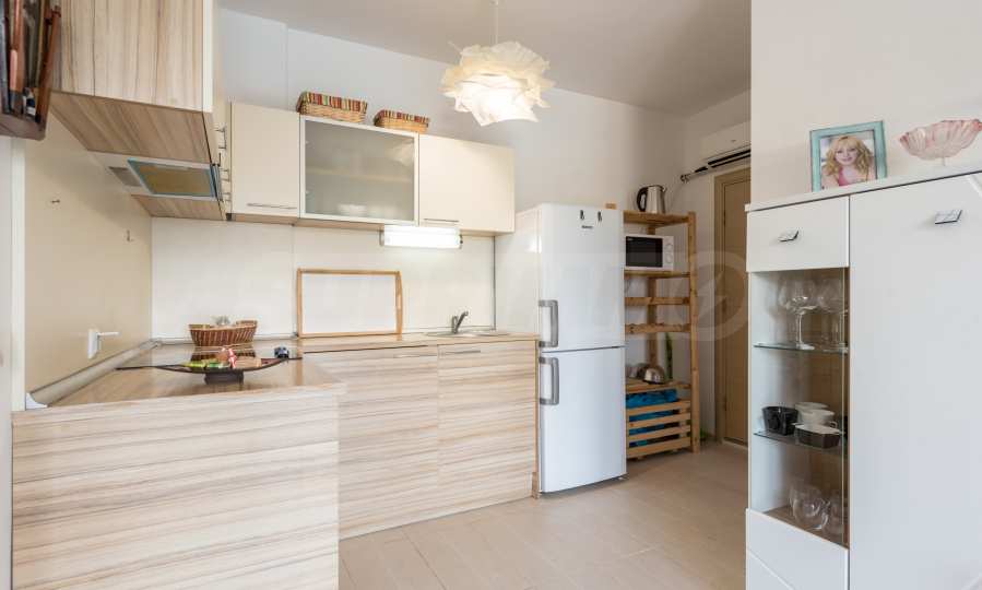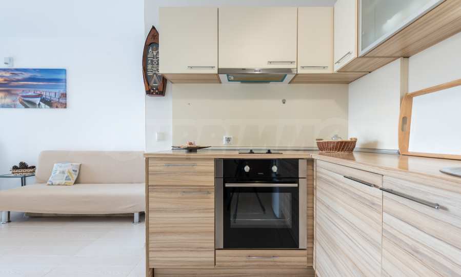 Апартаментът се намира на партерен етаж и се състои от просторен и светъл хол със съвременен кухненски кът, спалня, баня с тоалет, слънчева веранда с изглед към басейна и частична гледка море. Предлага се без обзавеждане, само с кухня.