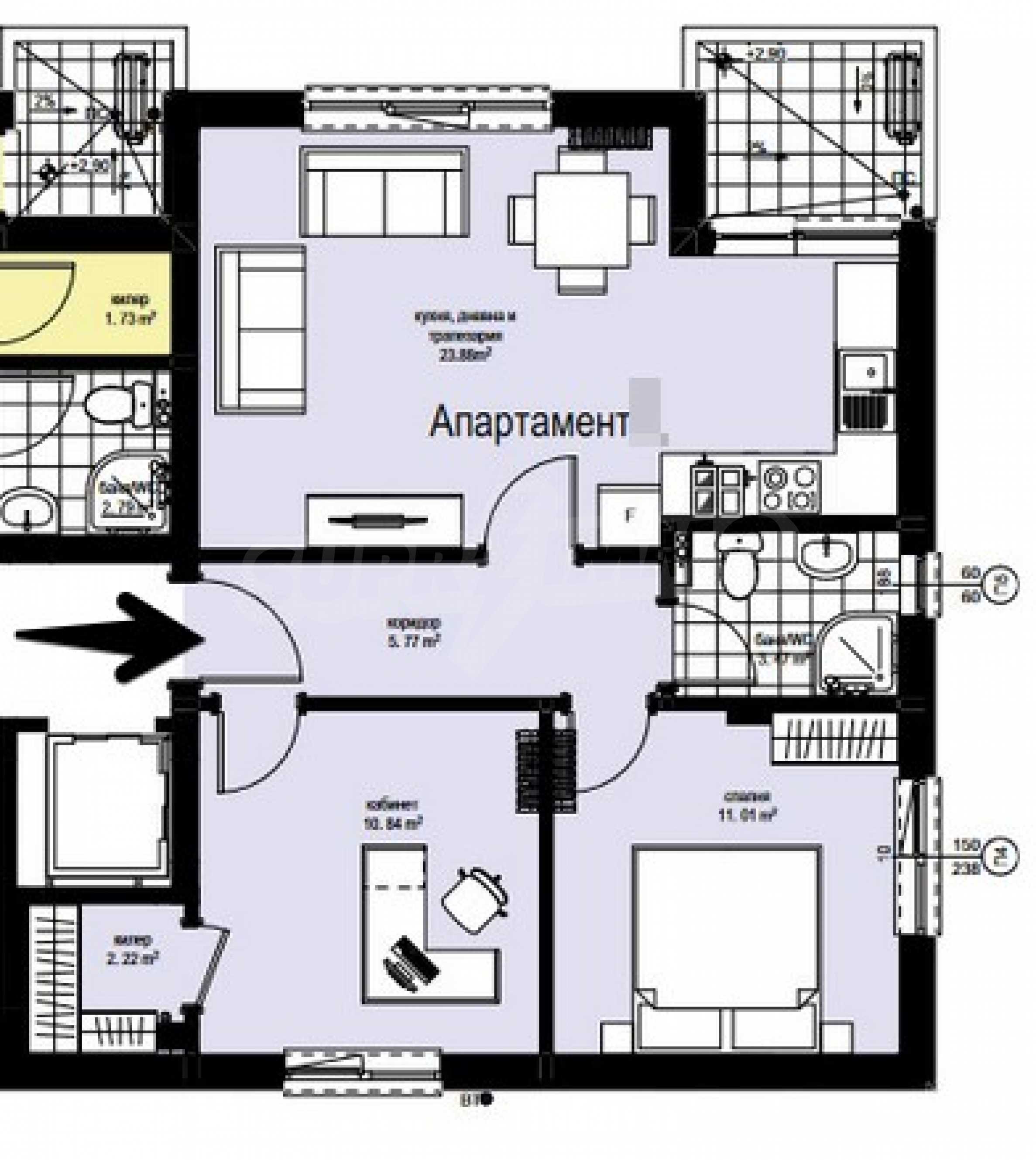 Апартаментът е разположен на 2-ри етаж, с площ от 70.70 кв.м: спалня, дневна с кухня и тераса, коридор, кабинет/спалня с килер, предлага се качествено завършен по Български Държавен Стандарт.