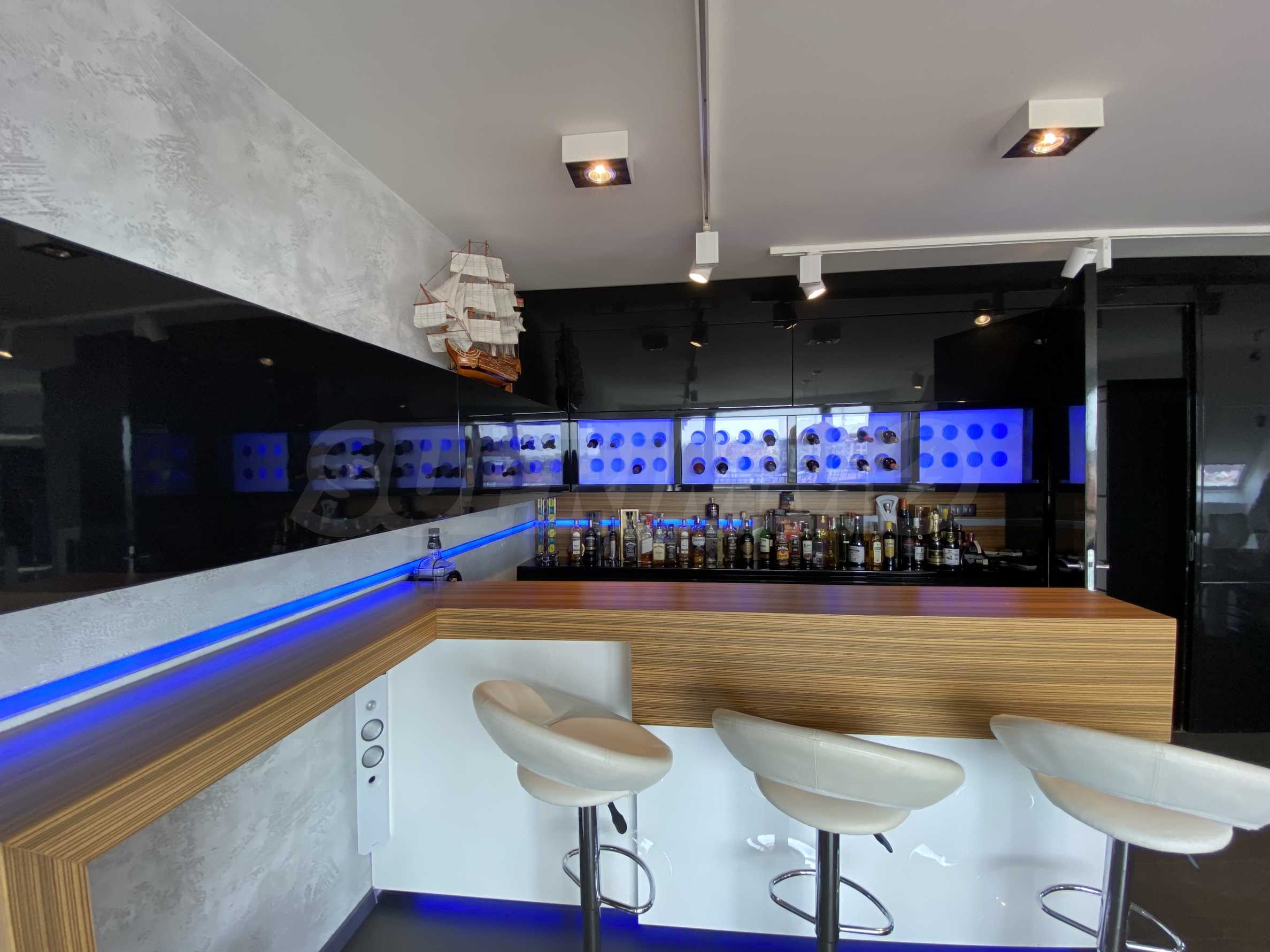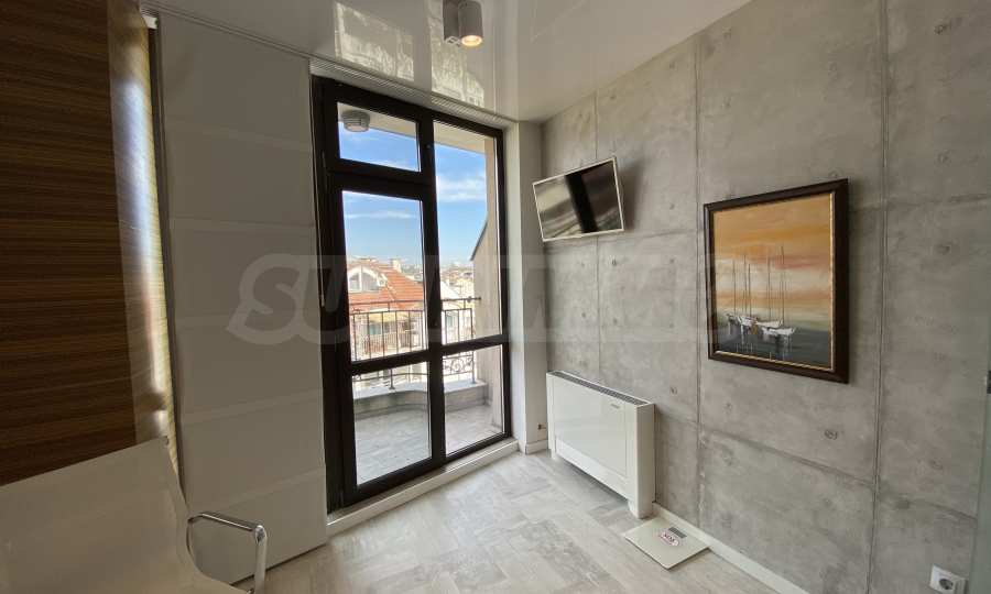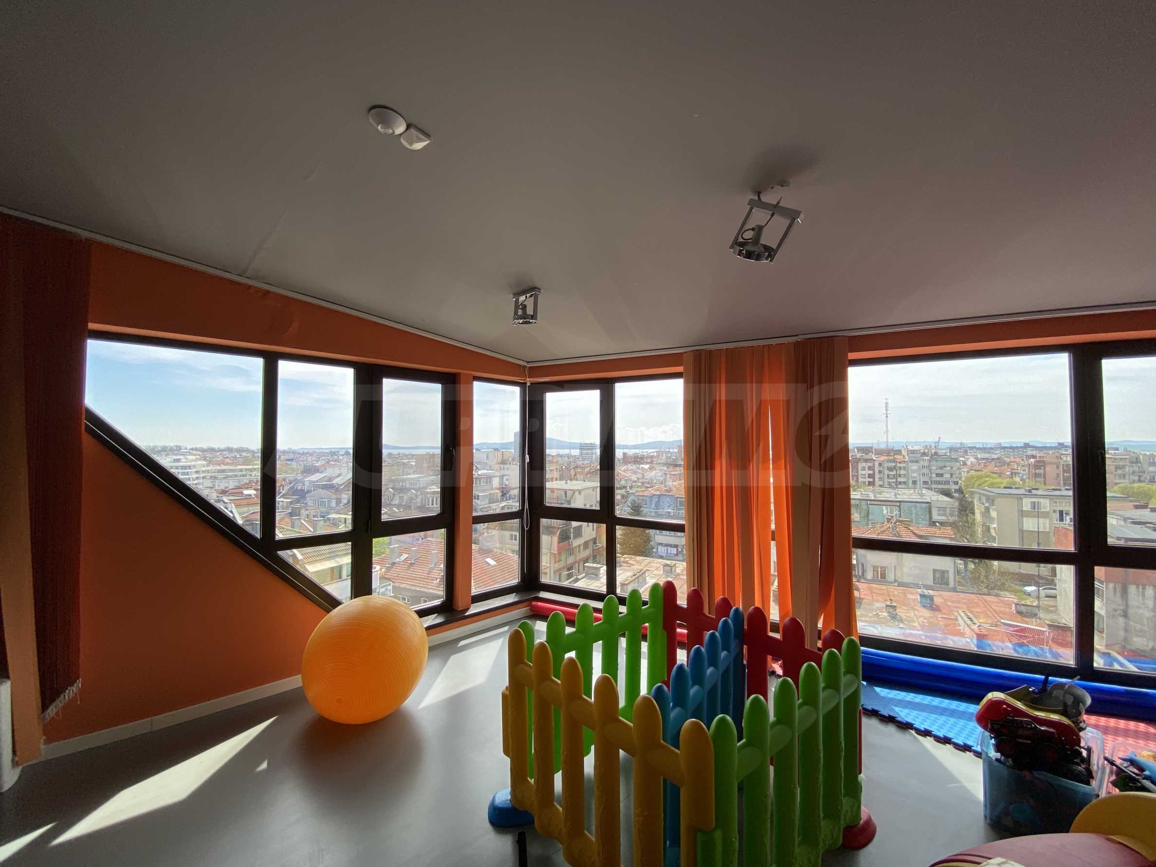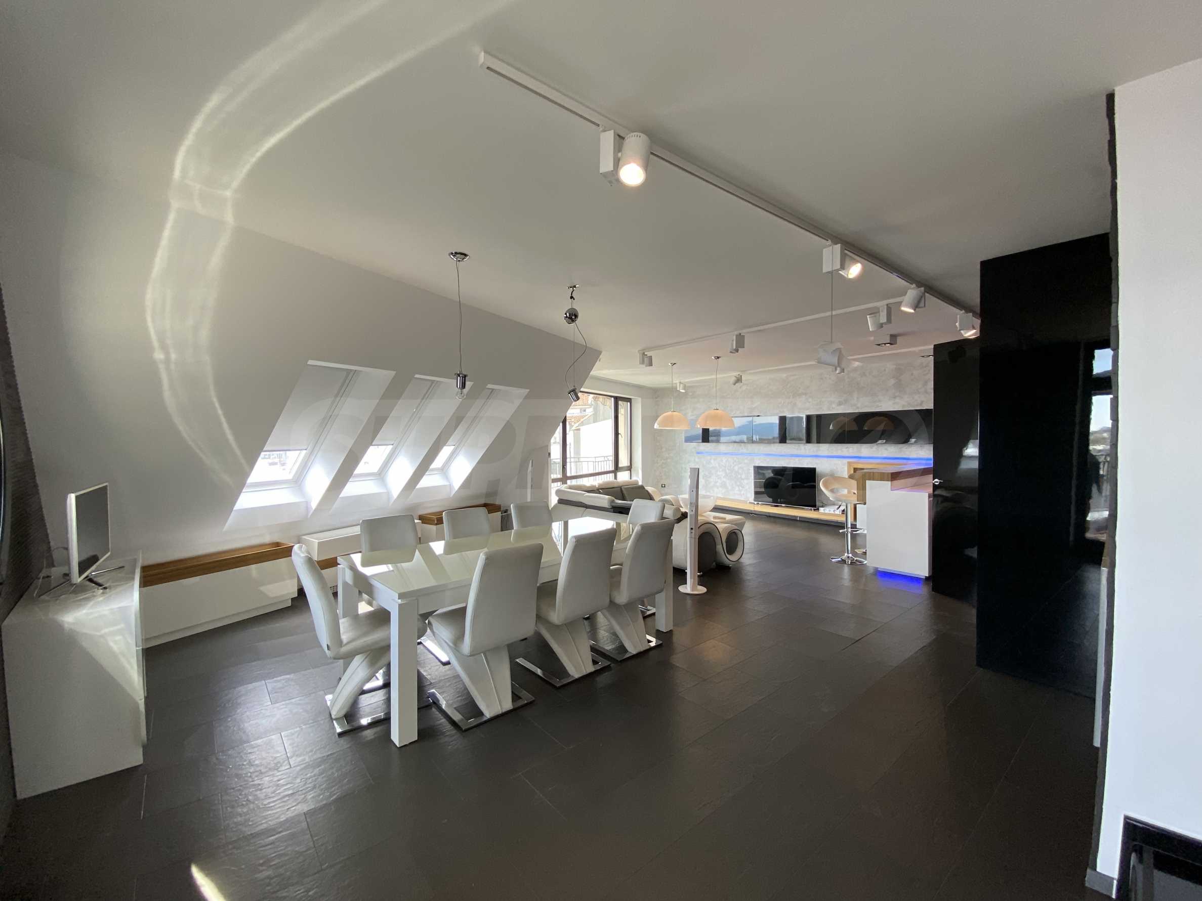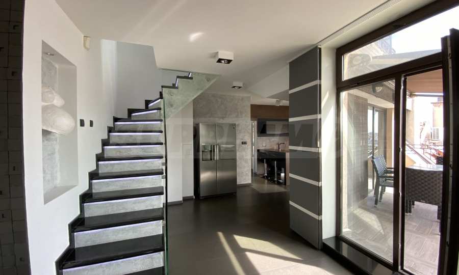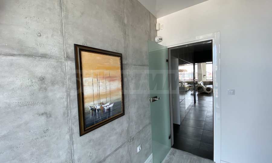 Апартаментът е с площ 274 кв.м и е разпределен на две нива, с панорамни тераси и предлага обширна градска и морска гледка.