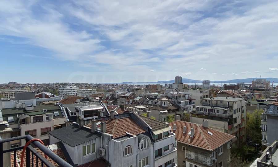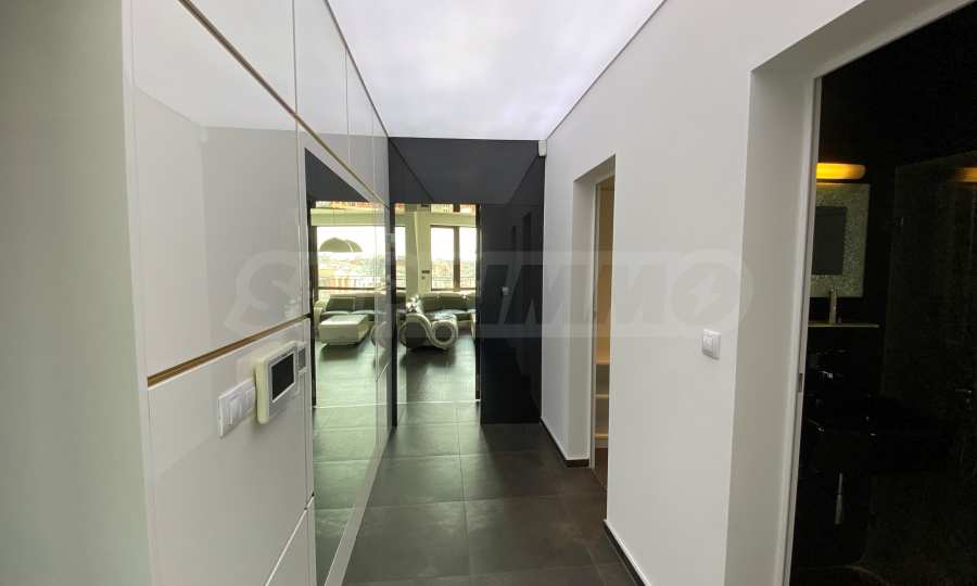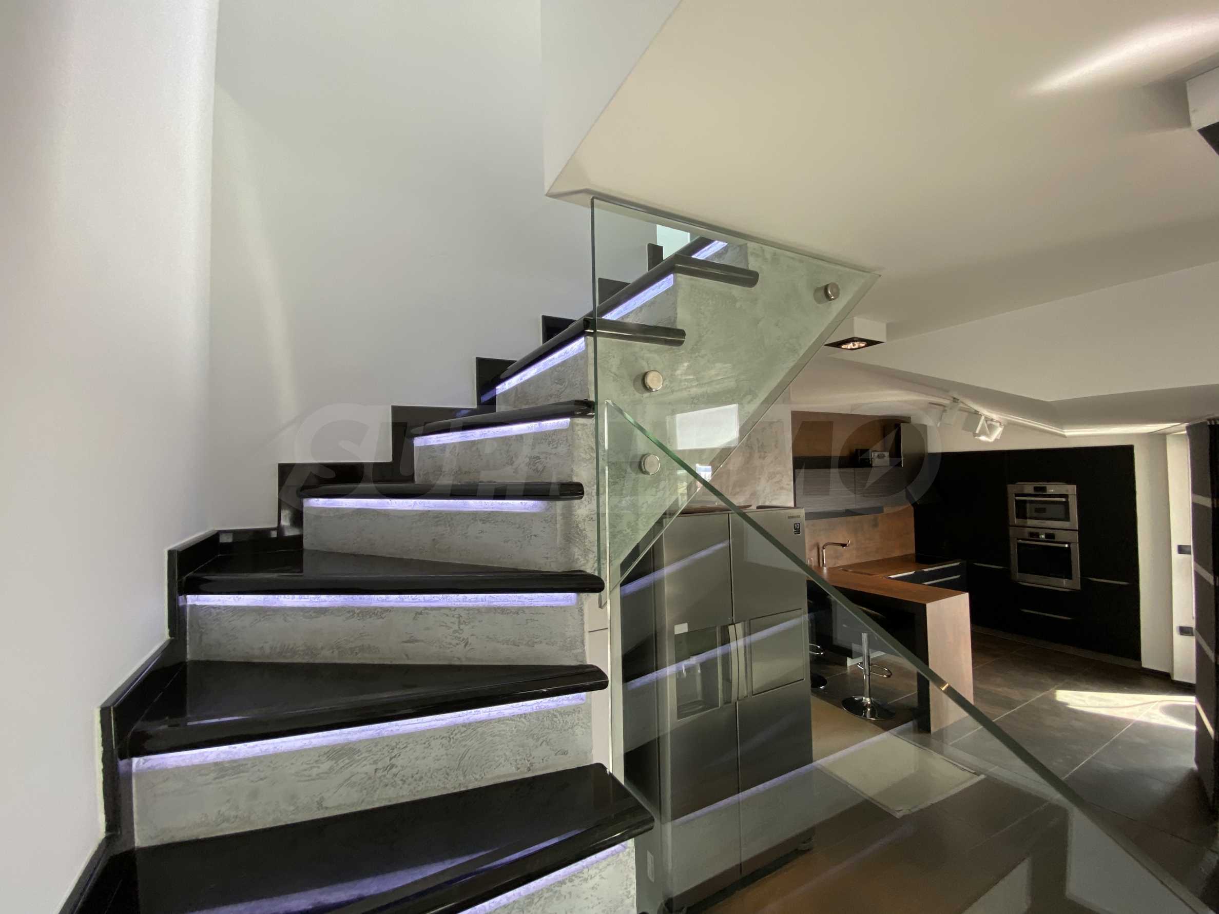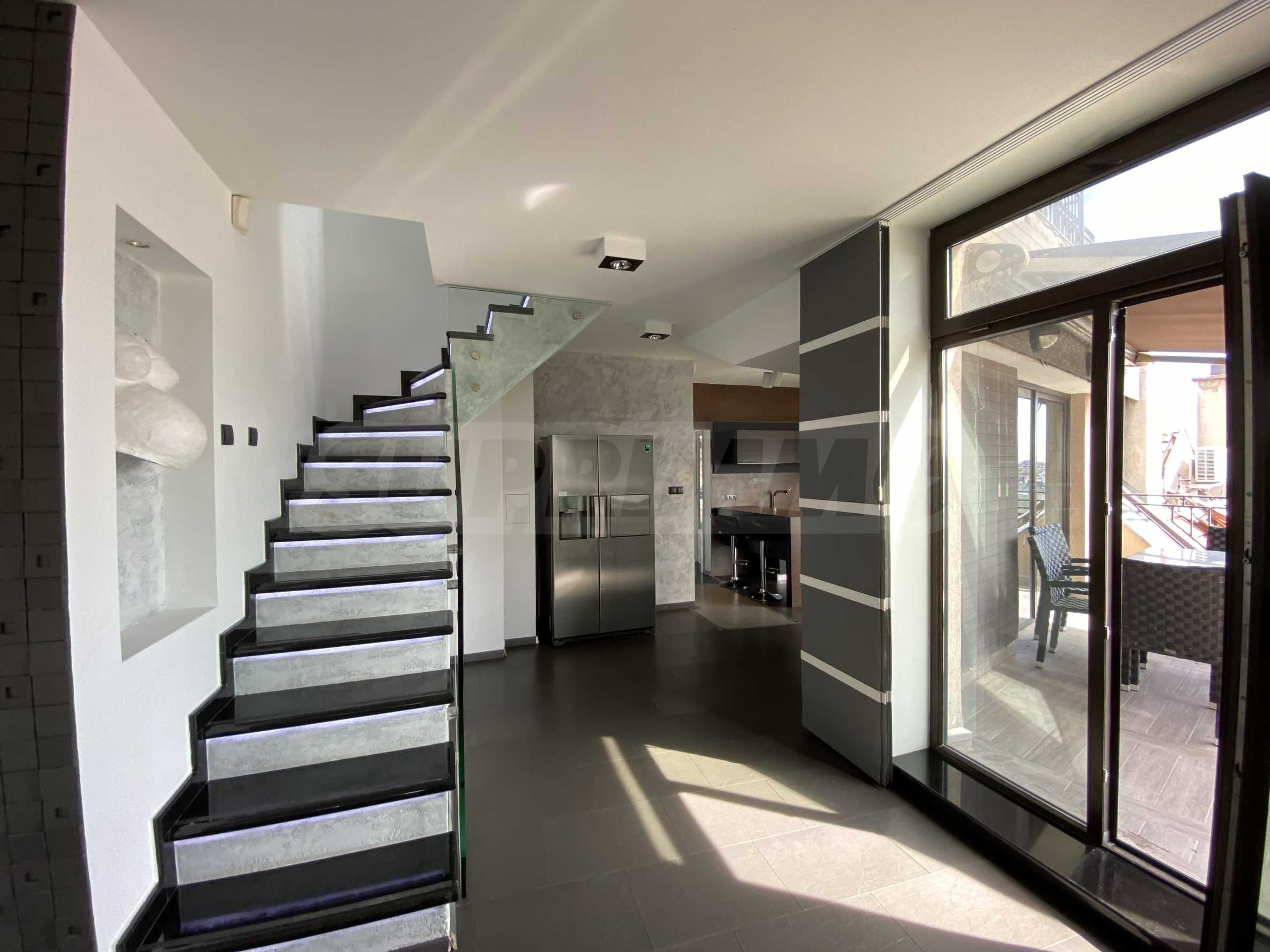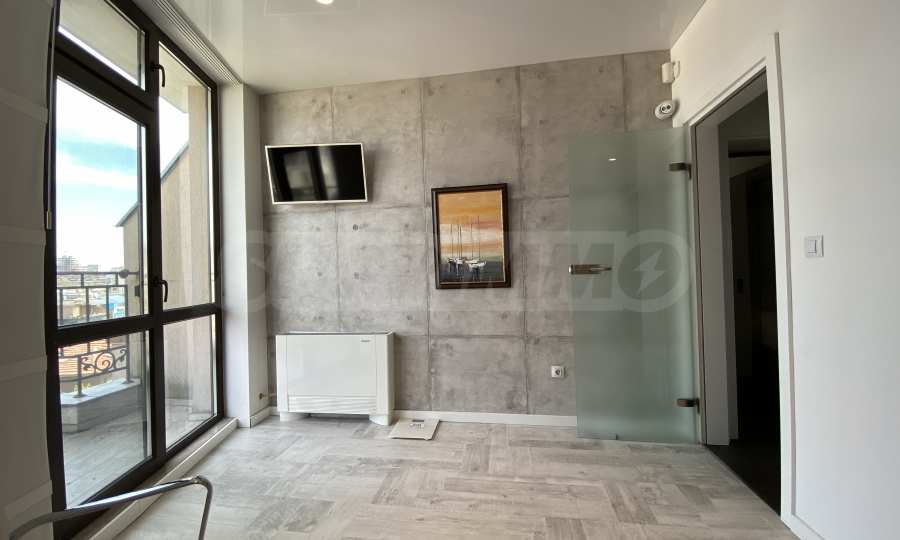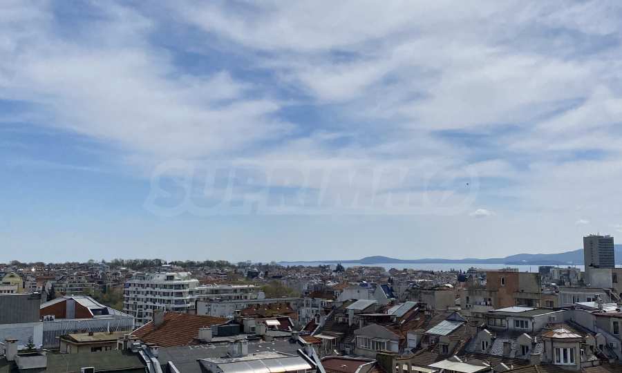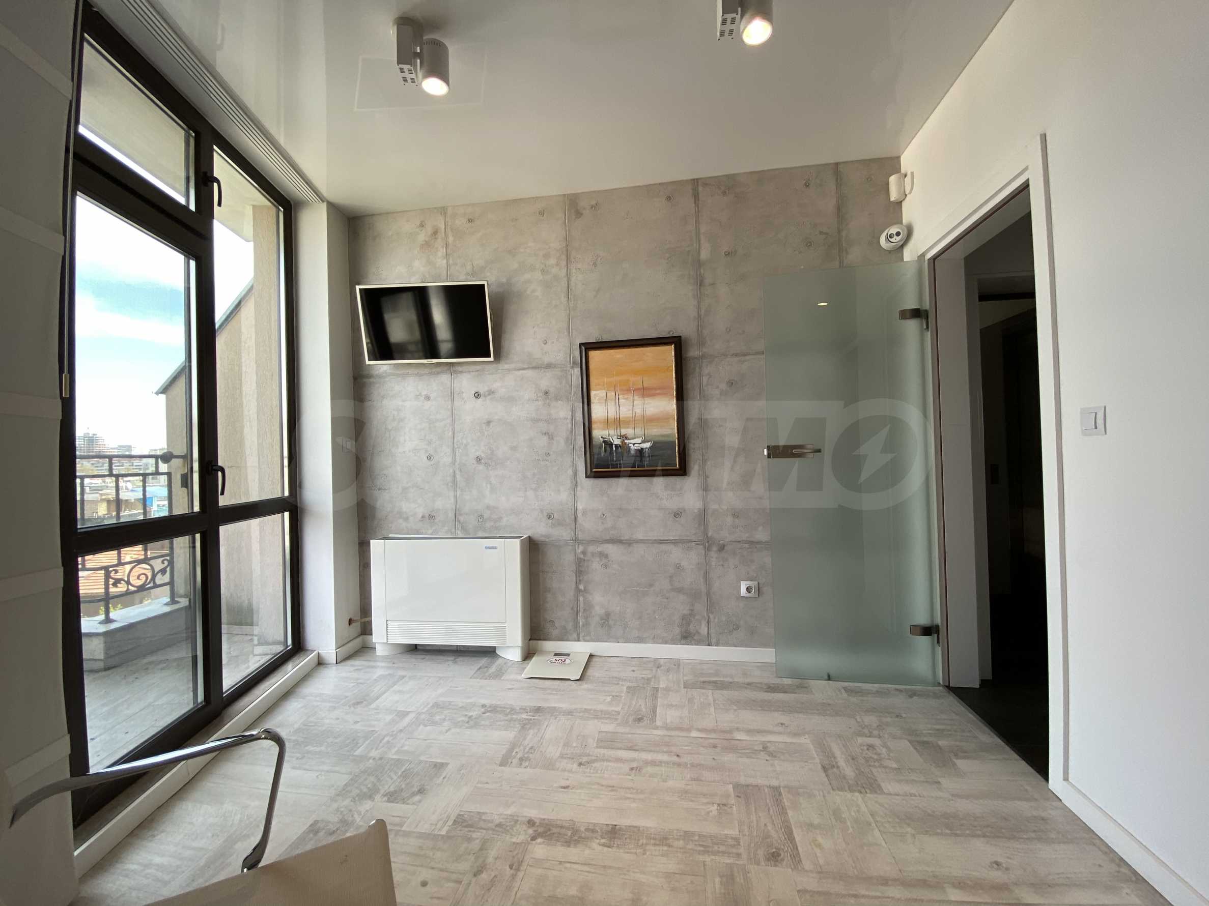 Апартаментът е с площ 274 кв.м и е разпределен на две нива, с панорамни тераси и предлага обширна градска и морска гледка.