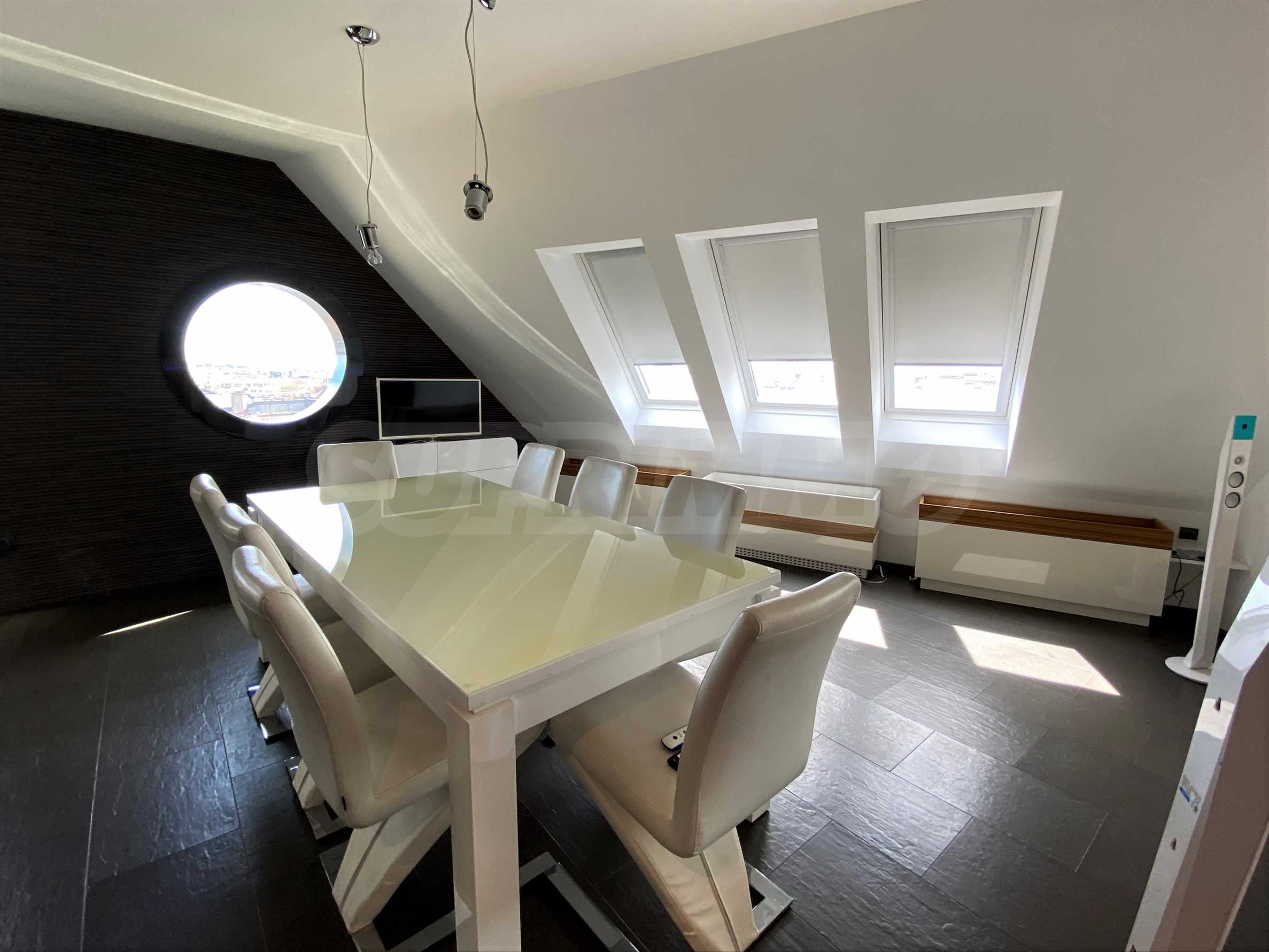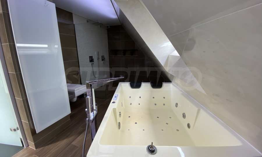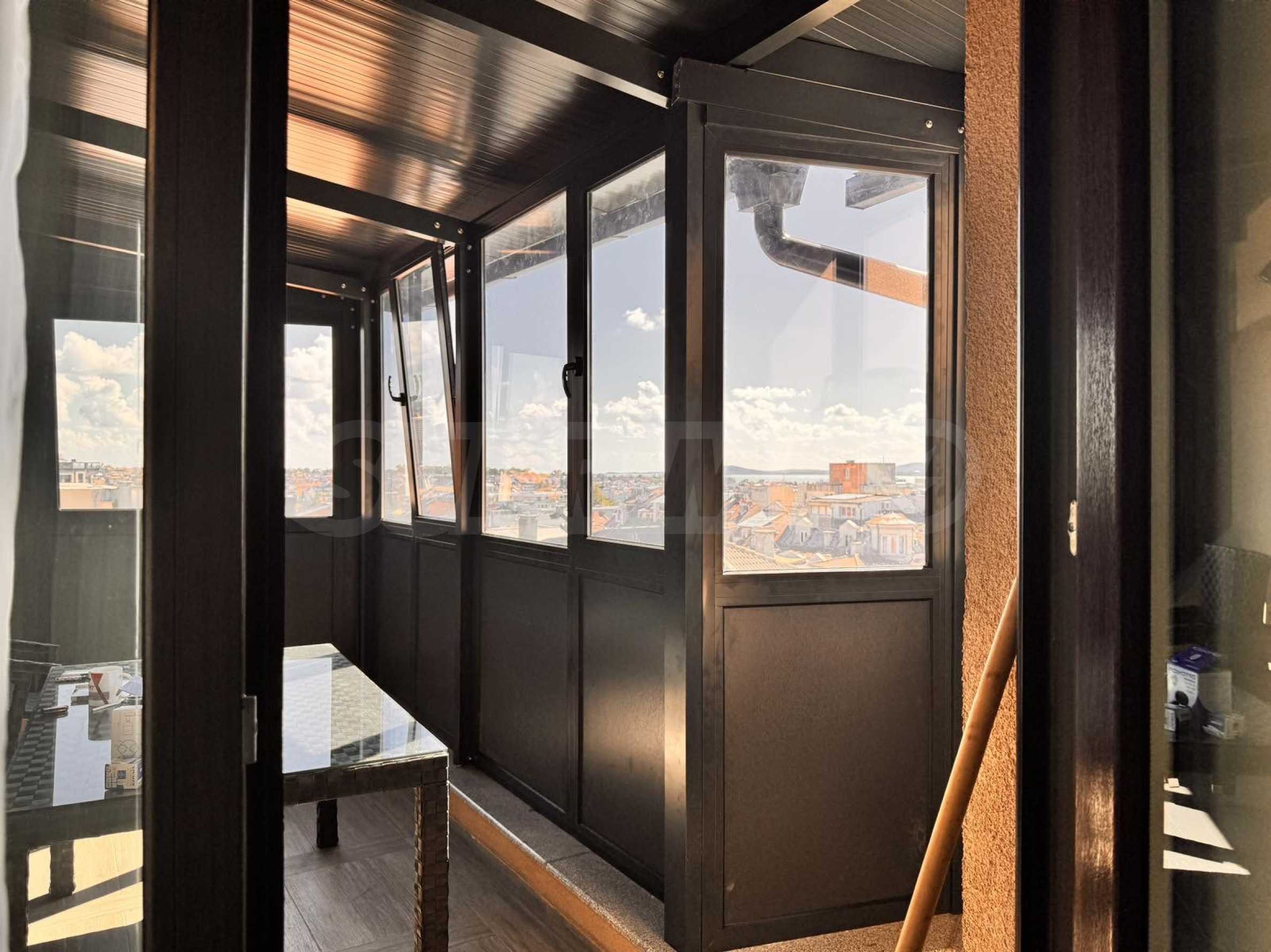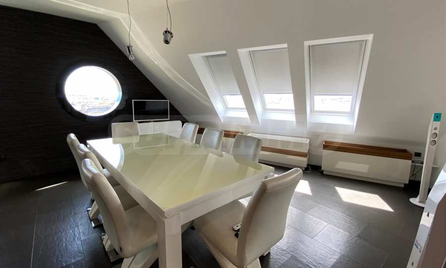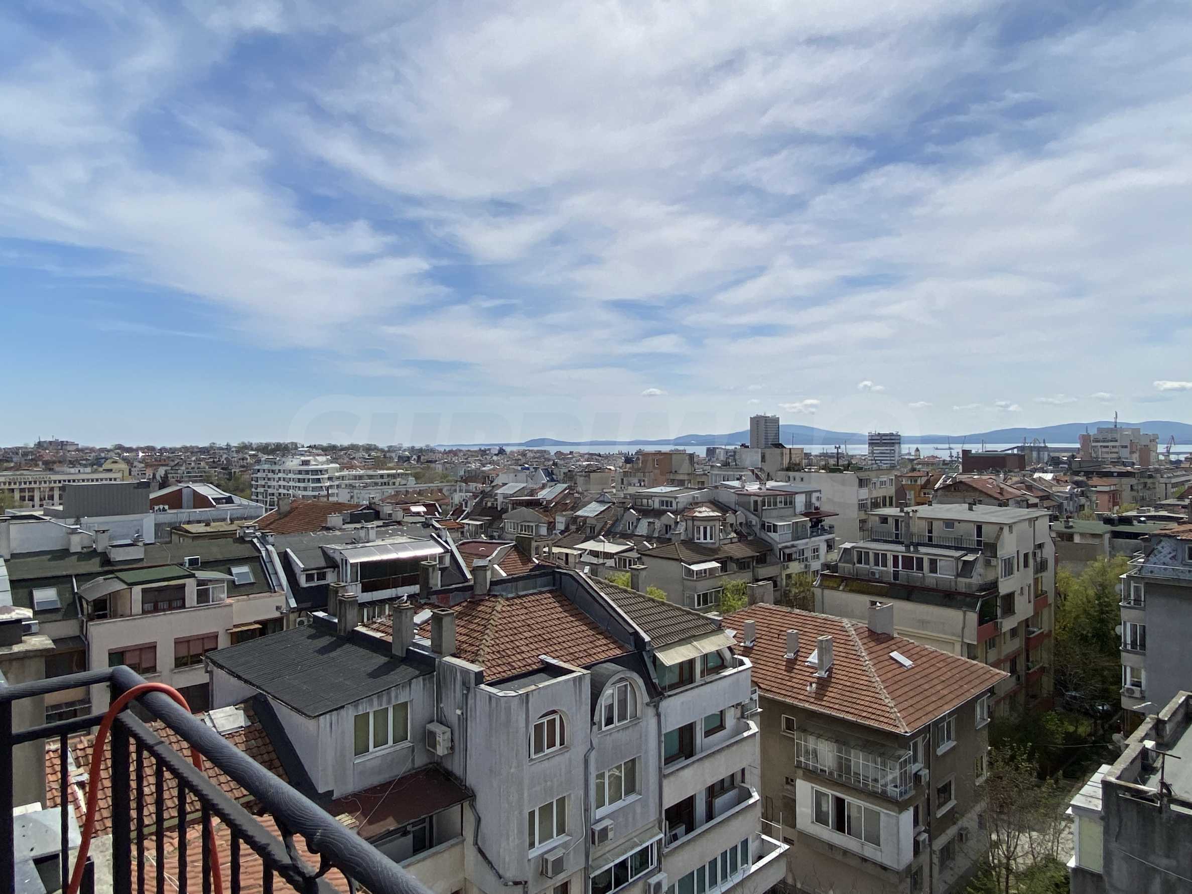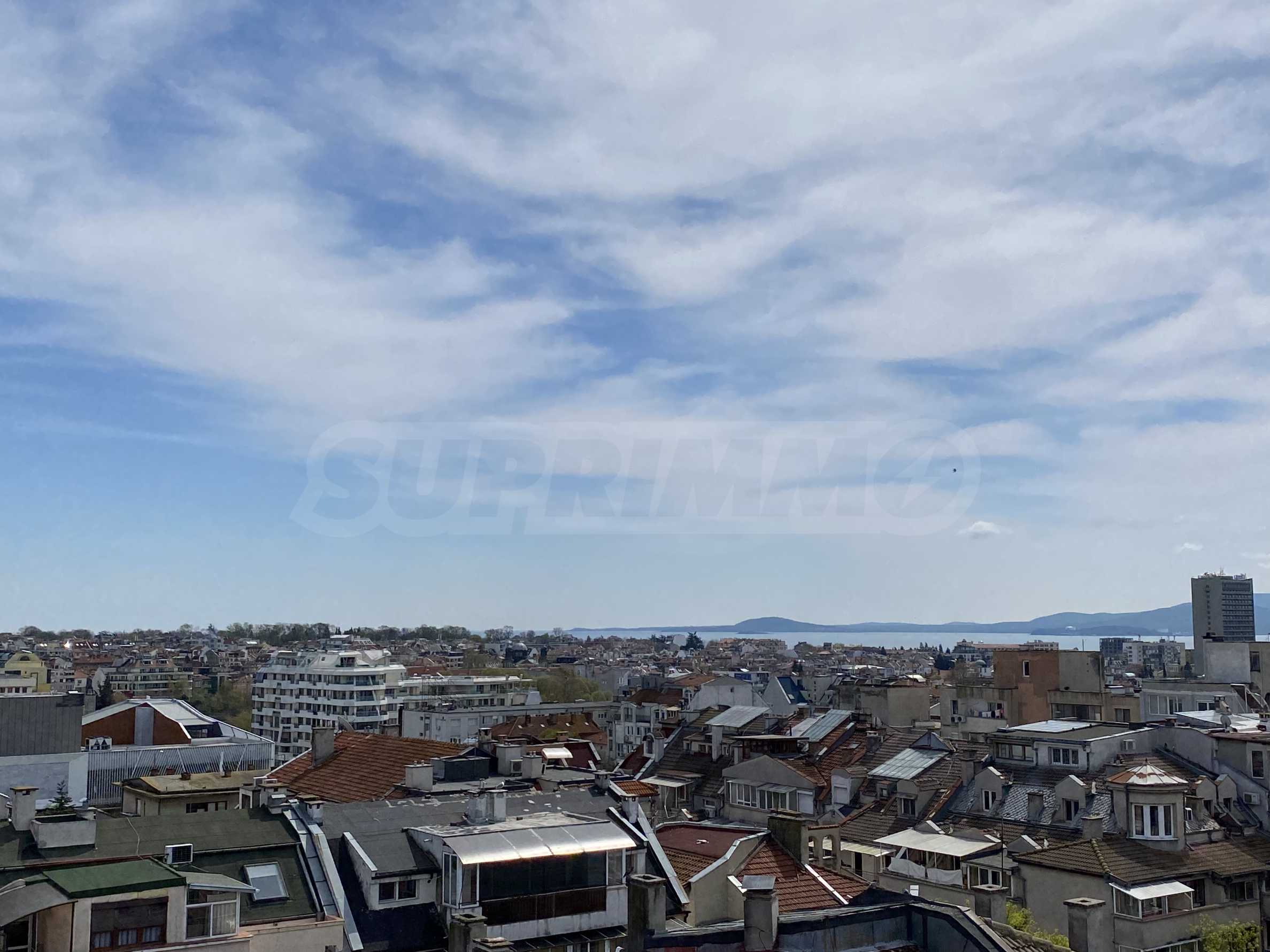 Апартаментът е с площ 274 кв.м и е разпределен на две нива, с панорамни тераси и предлага обширна градска и морска гледка.
