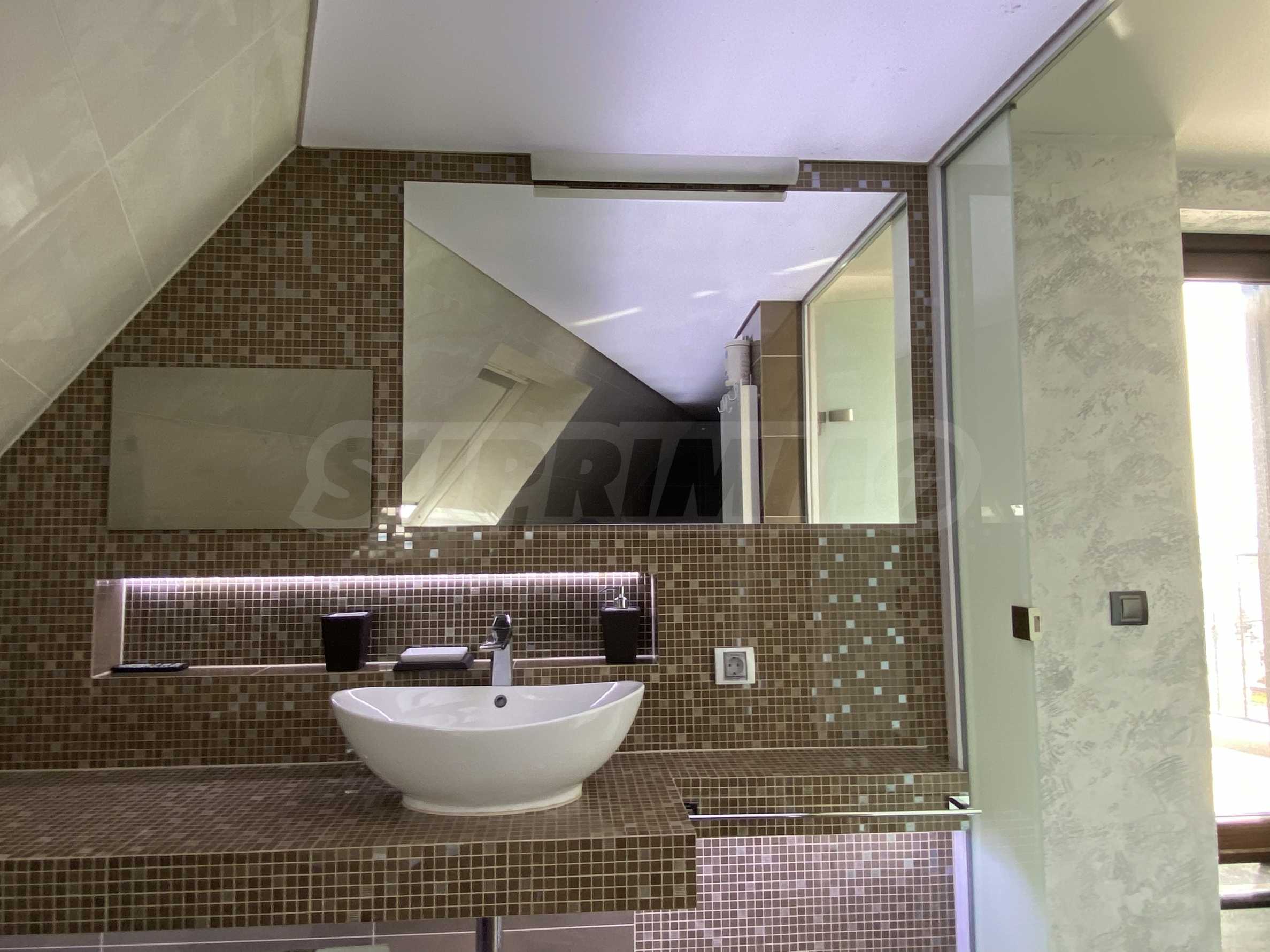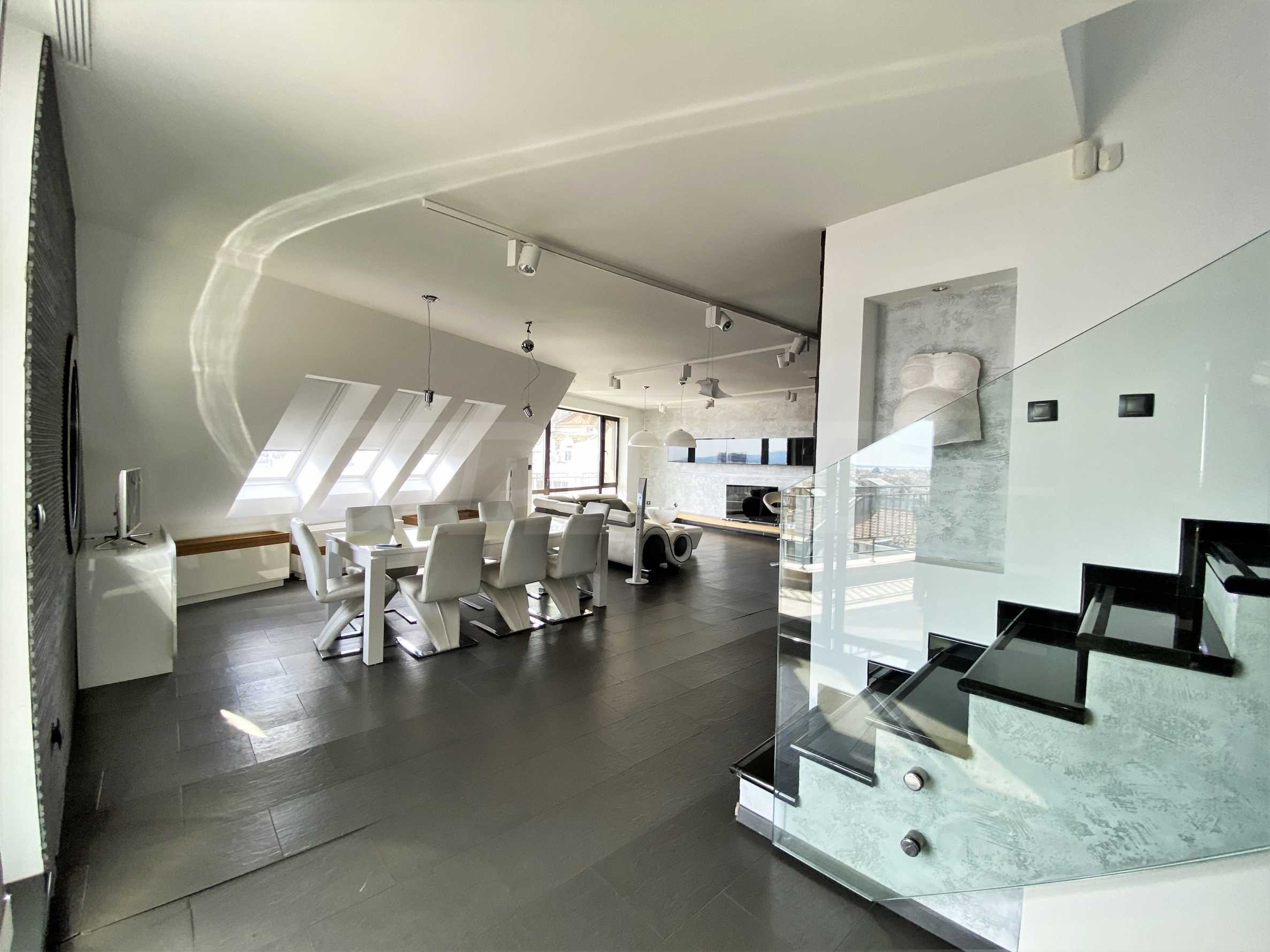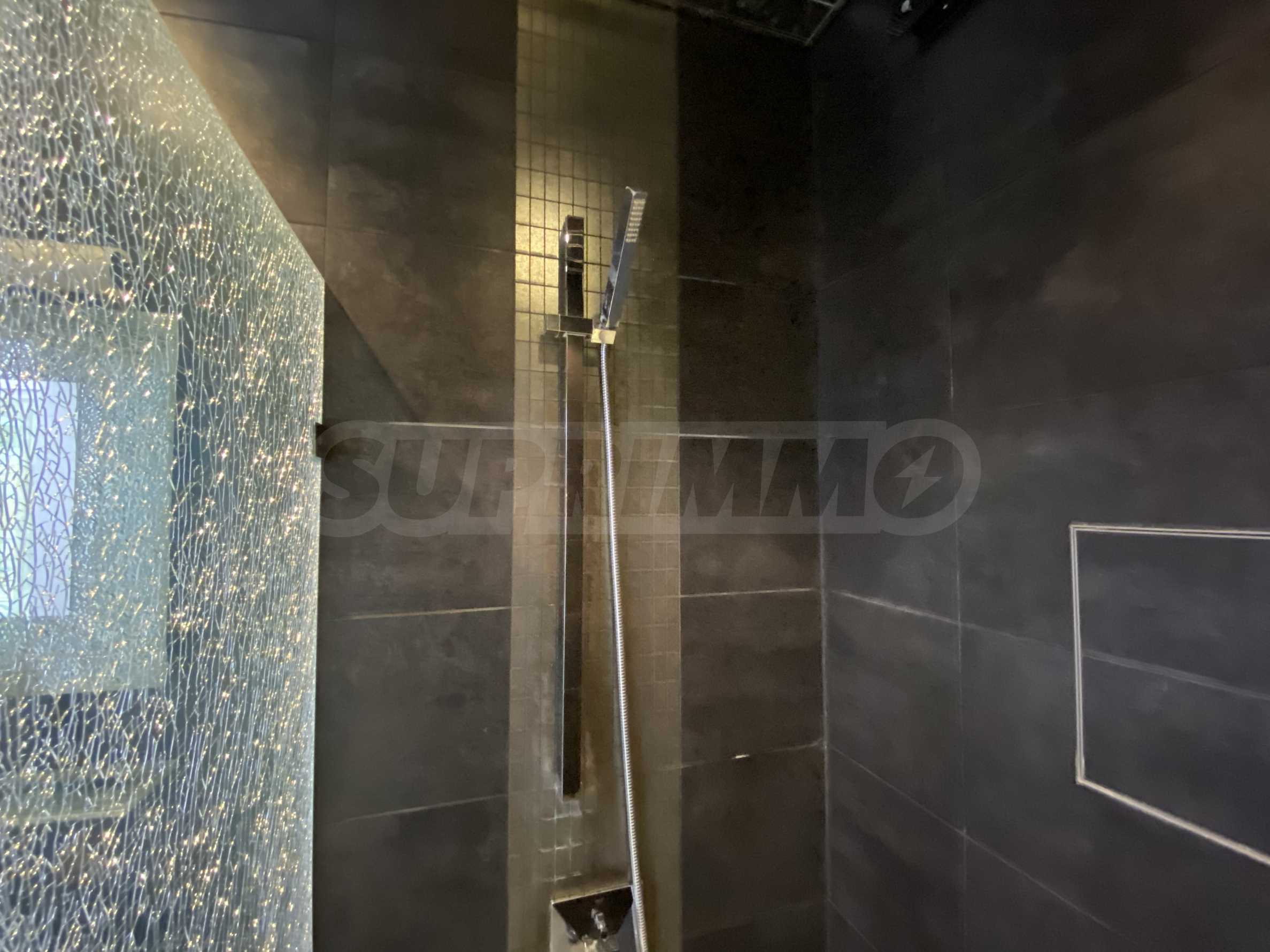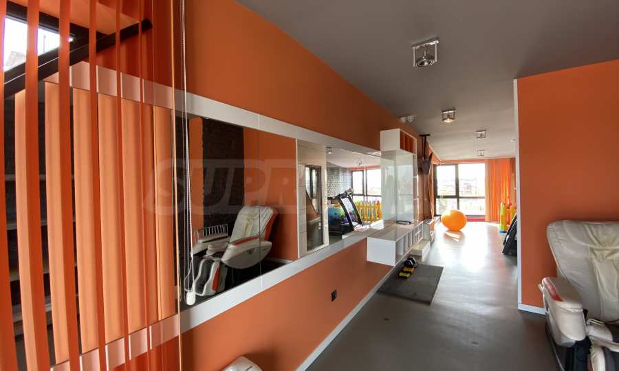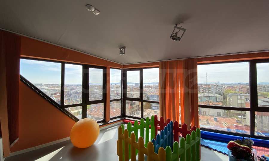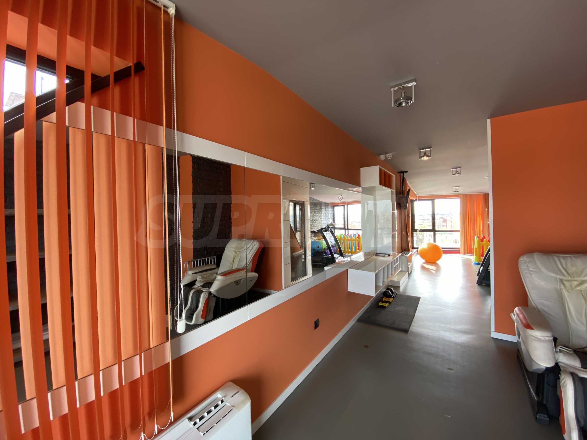 Апартаментът е с площ 274 кв.м и е разпределен на две нива, с панорамни тераси и предлага обширна градска и морска гледка.