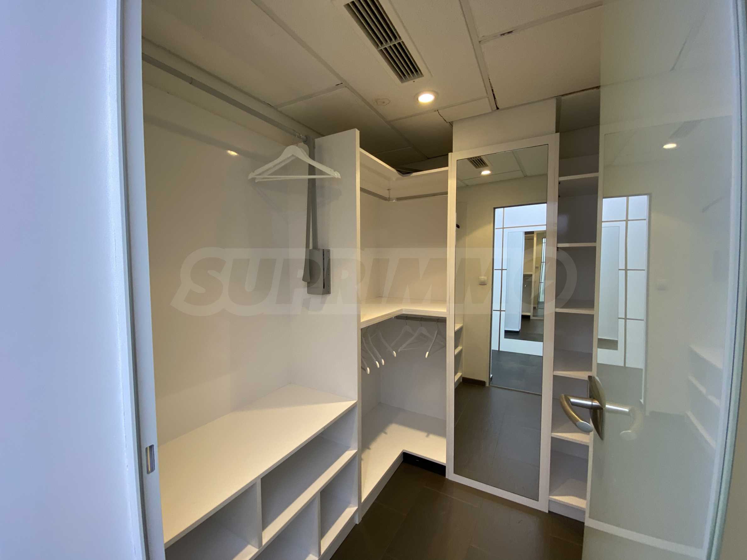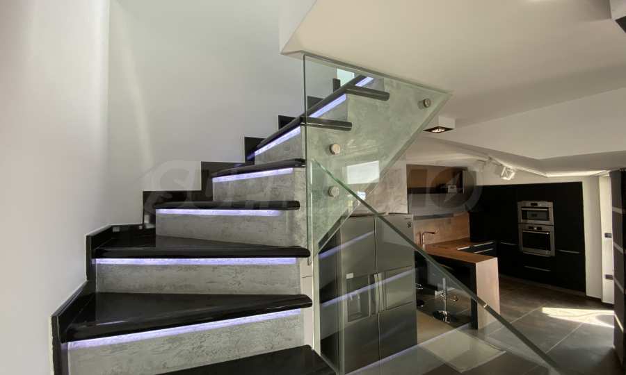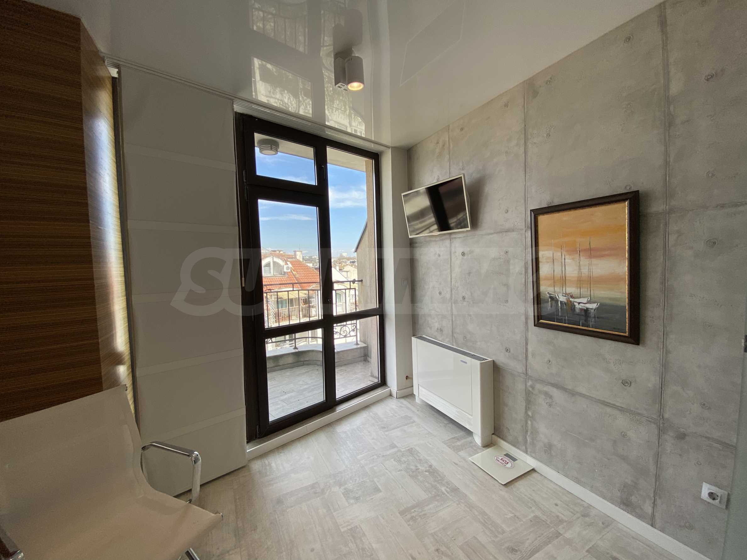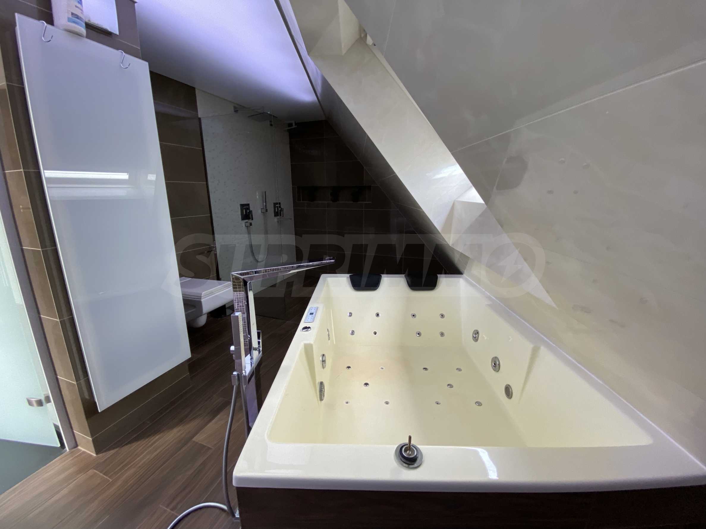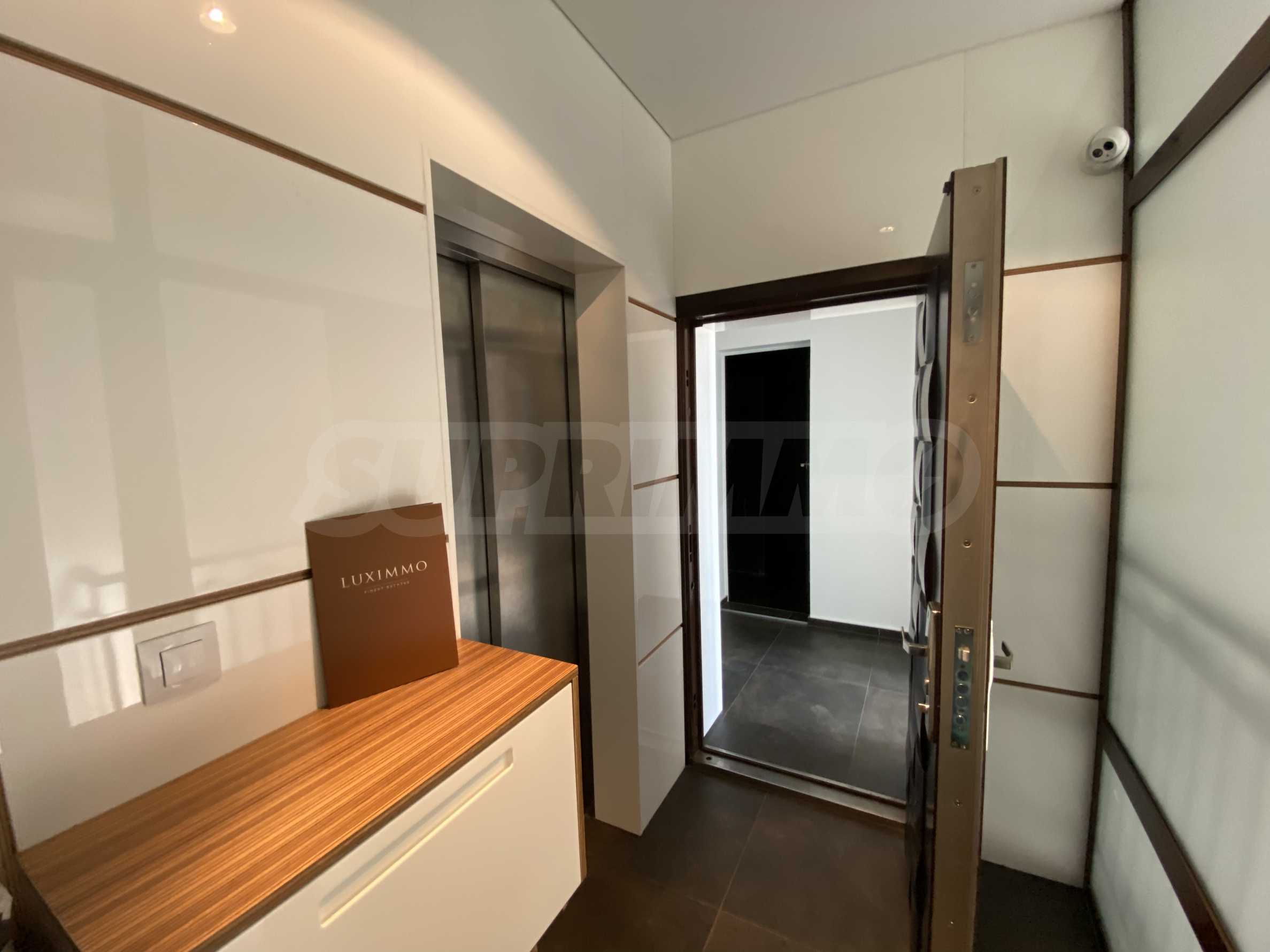 Апартаментът е с площ 274 кв.м и е разпределен на две нива, с панорамни тераси и предлага обширна градска и морска гледка.