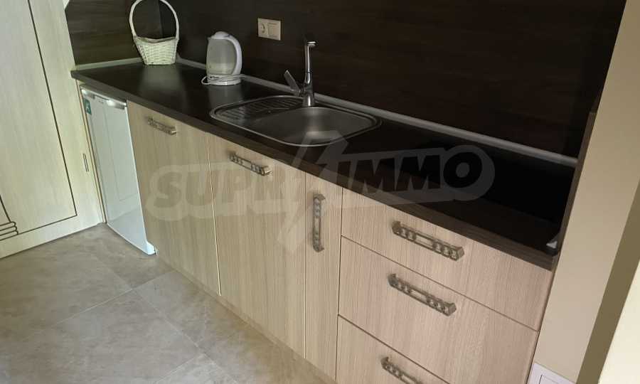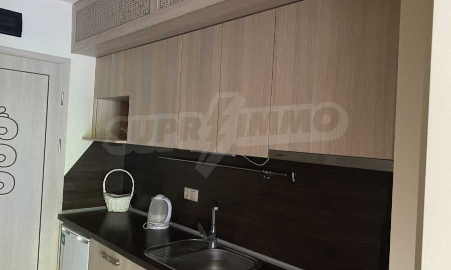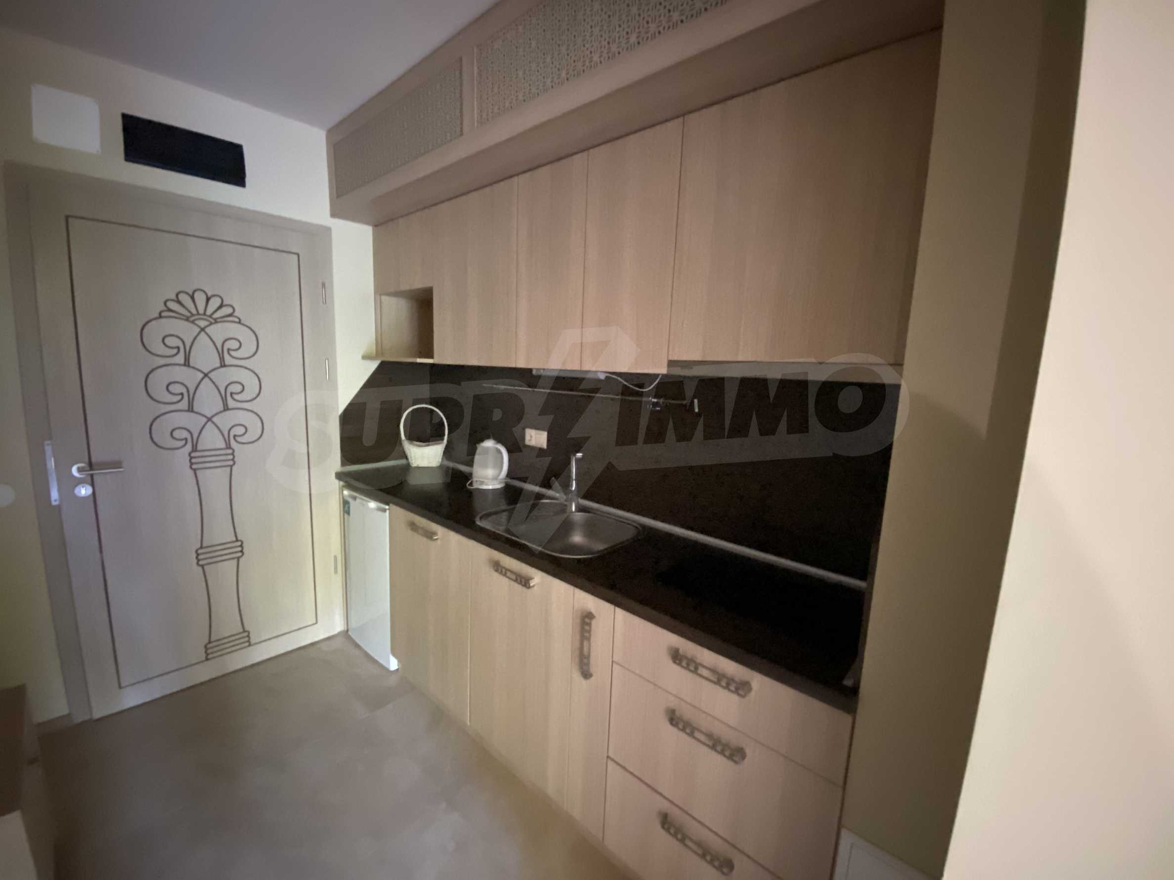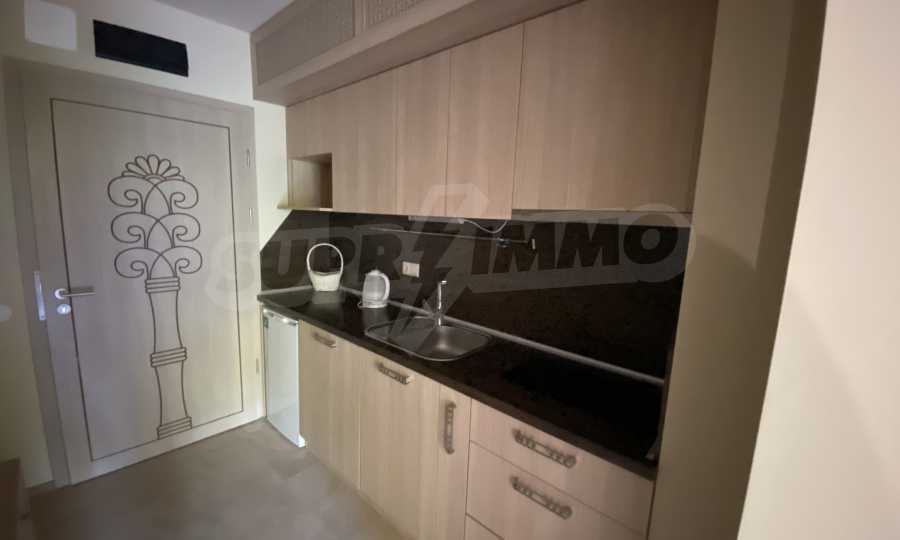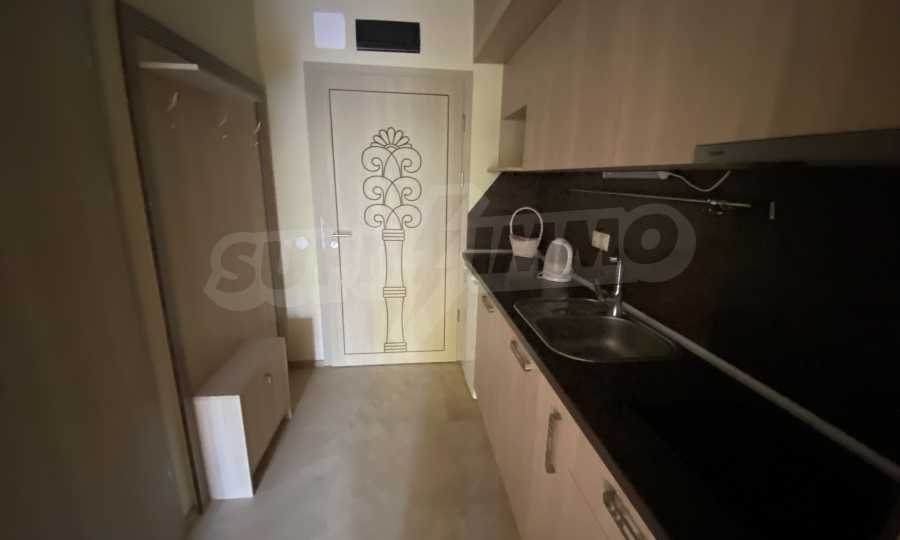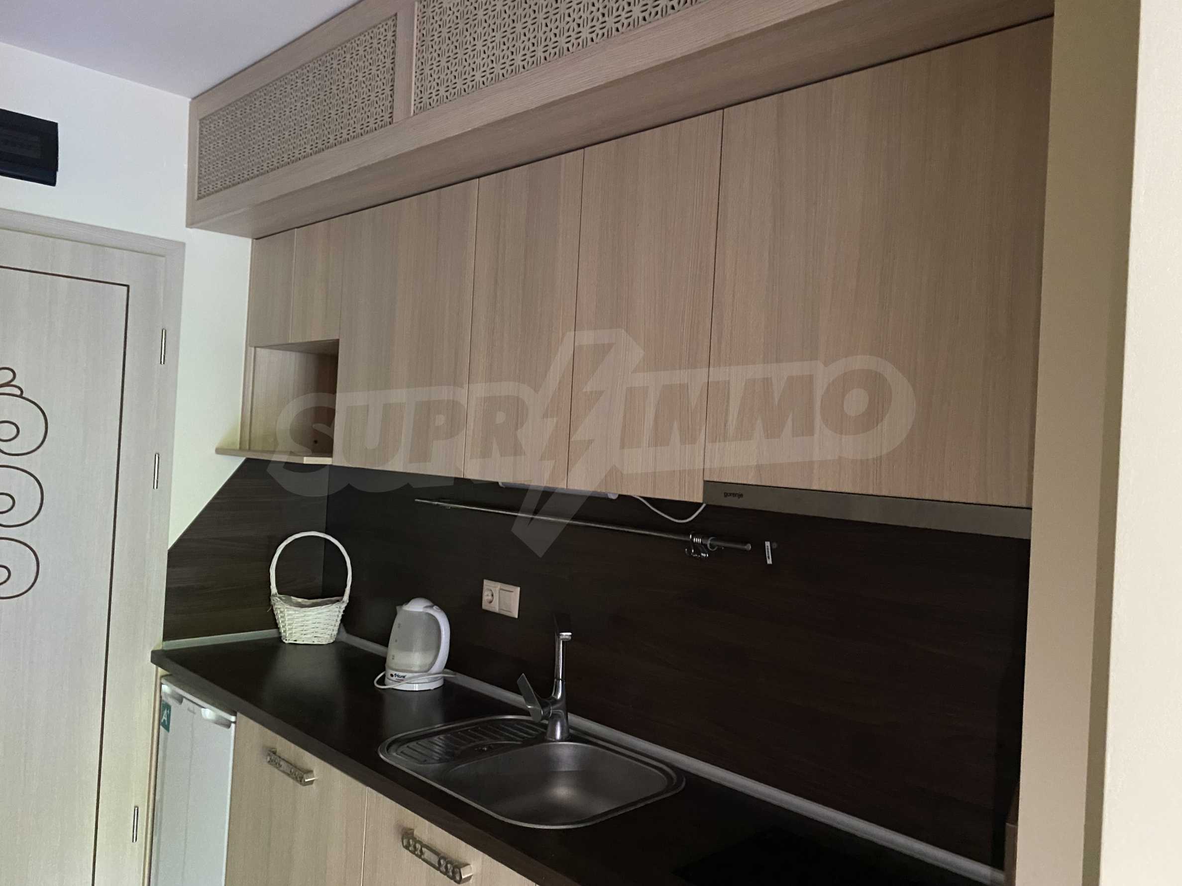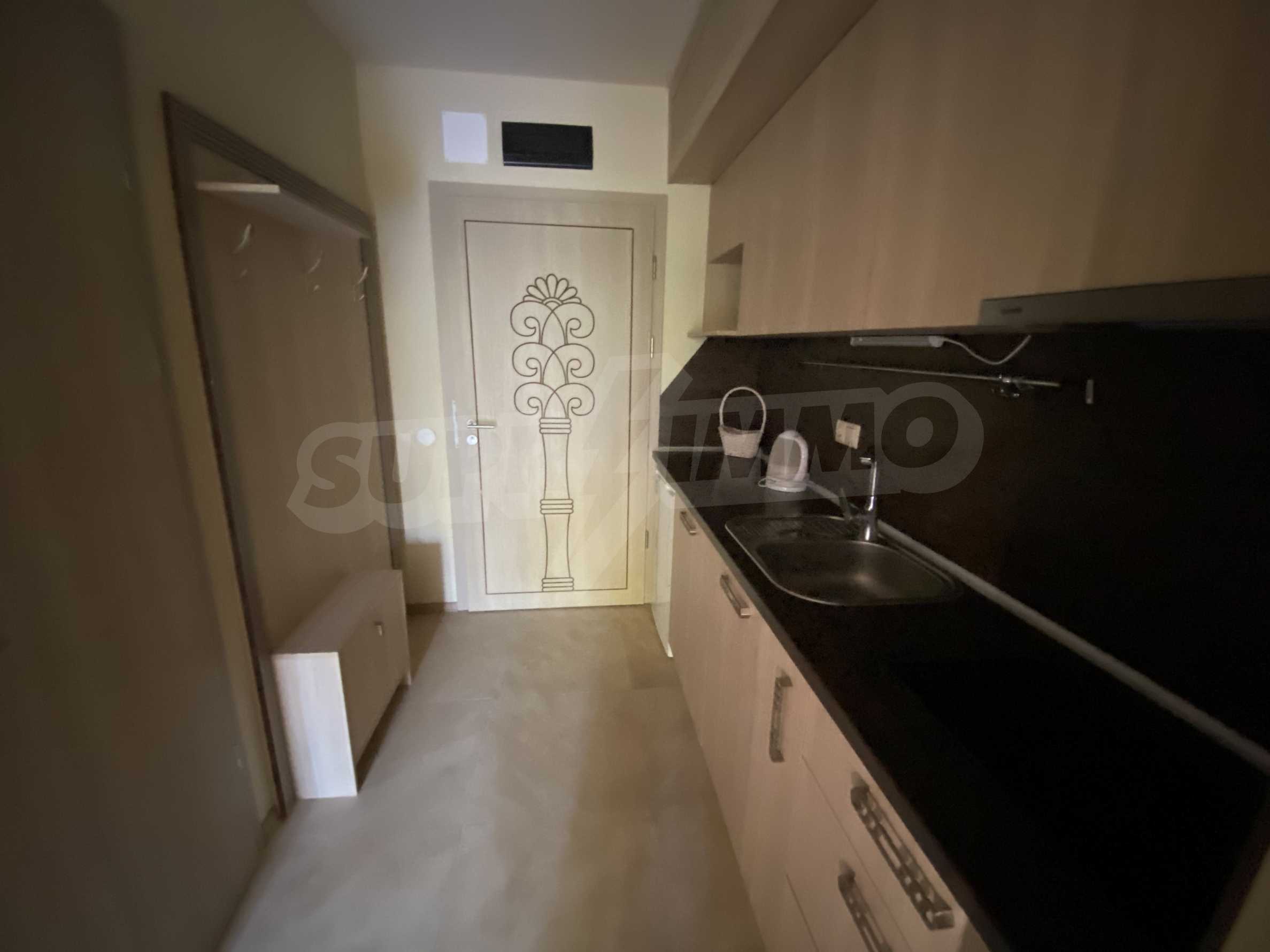 Имотът е разположен на 4-ти етаж, с южно изложение и се състои от една стая, коридор, баня с тоалет и тераса. Студиото е мебелирано и се предлага с цялото оборудване. Мебелировката е изпълнена от инвеститора и е в стила на хотелската част. В коридора е вградена кухненска мебел, оборудвана с мивка, хладилник и пералня. Банята е луксозно изпълнена и разполага с душ кабина, тоалет с биде и мивка с гранитен плот.
