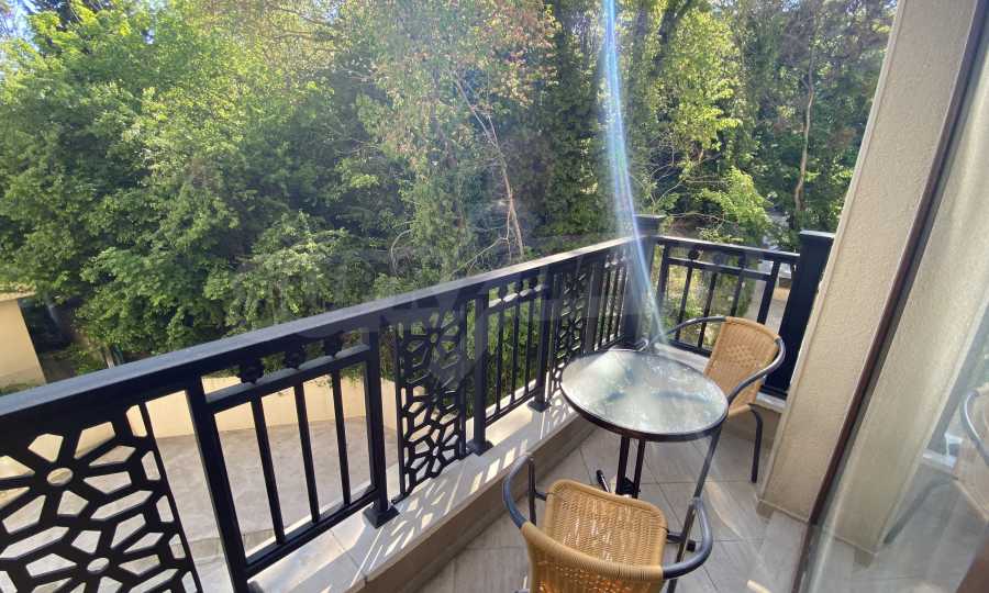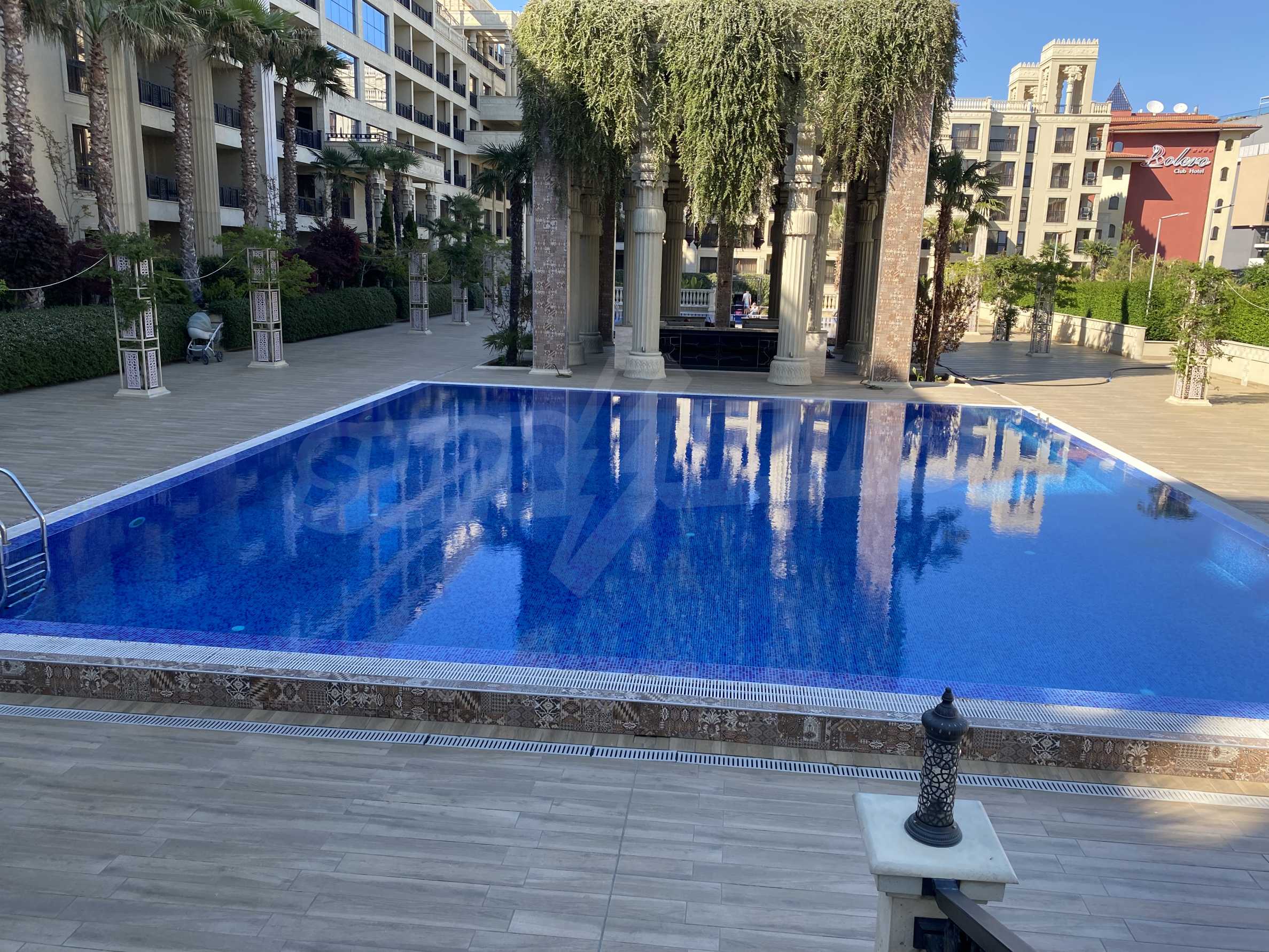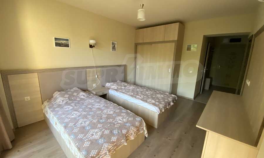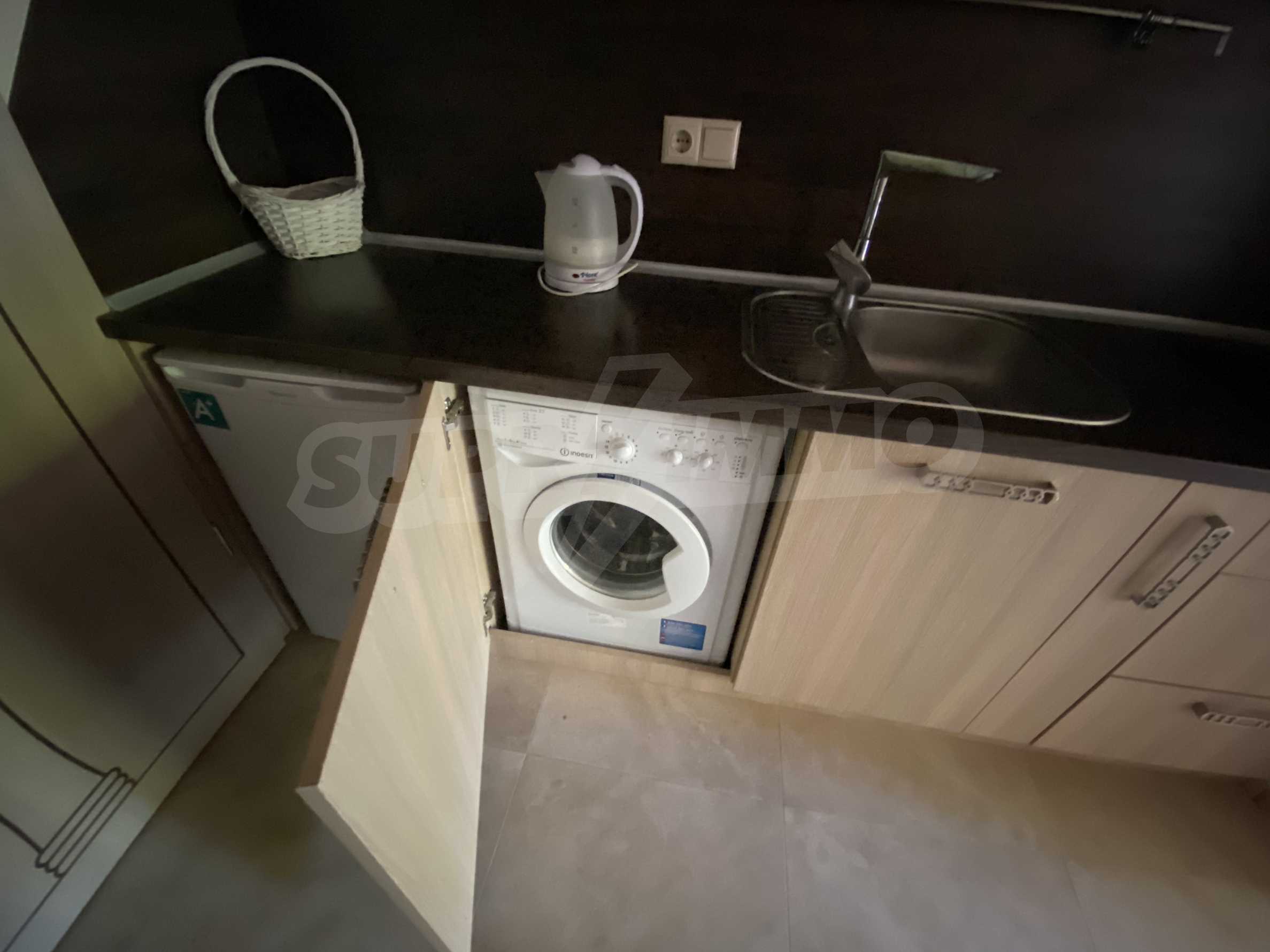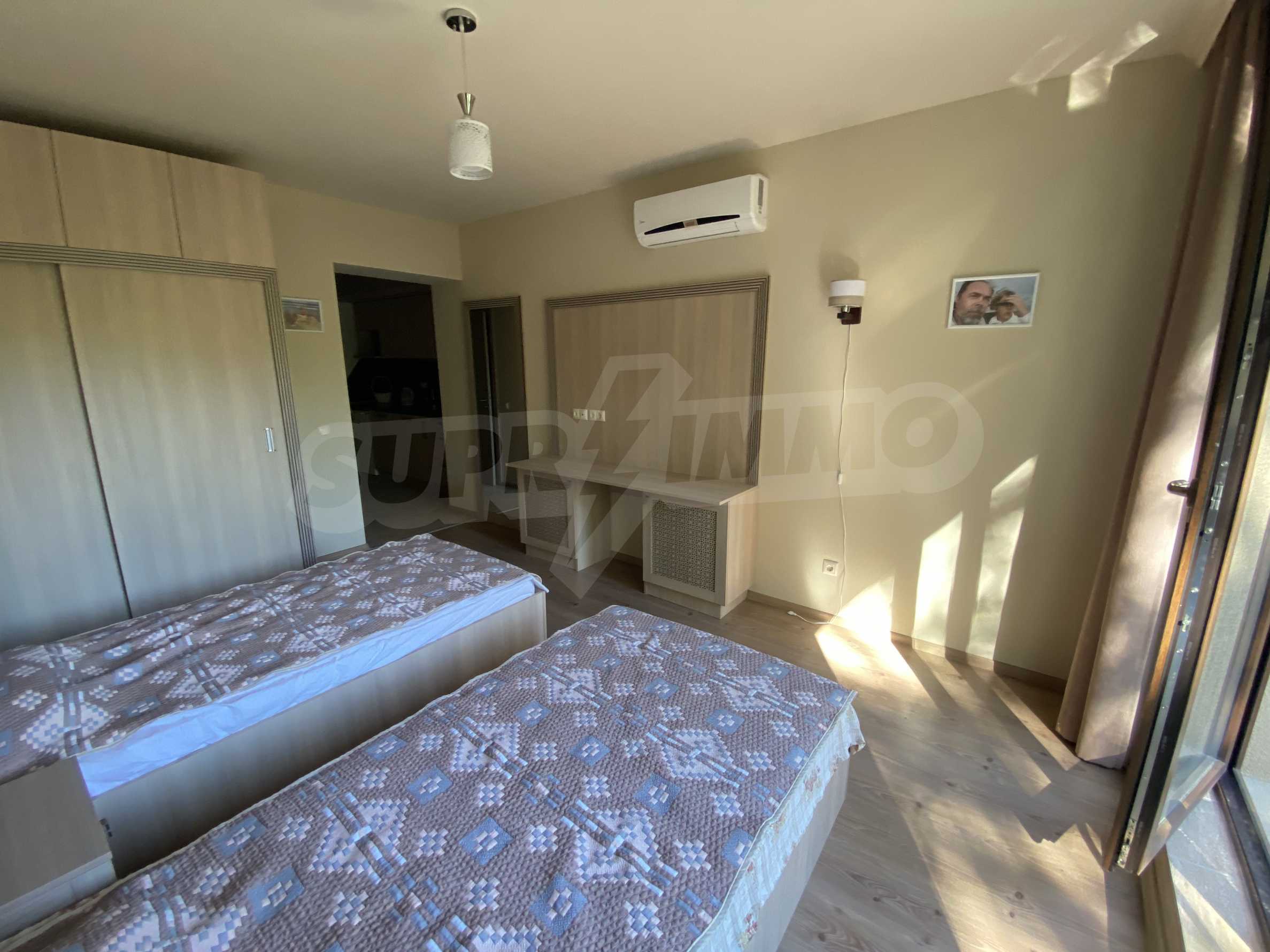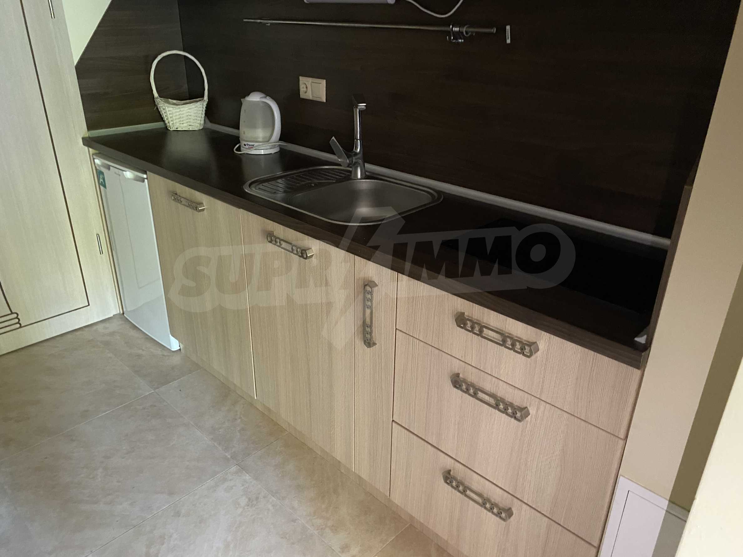 Имотът е разположен на 4-ти етаж, с южно изложение и се състои от една стая, коридор, баня с тоалет и тераса. Студиото е мебелирано и се предлага с цялото оборудване. Мебелировката е изпълнена от инвеститора и е в стила на хотелската част. В коридора е вградена кухненска мебел, оборудвана с мивка, хладилник и пералня. Банята е луксозно изпълнена и разполага с душ кабина, тоалет с биде и мивка с гранитен плот.