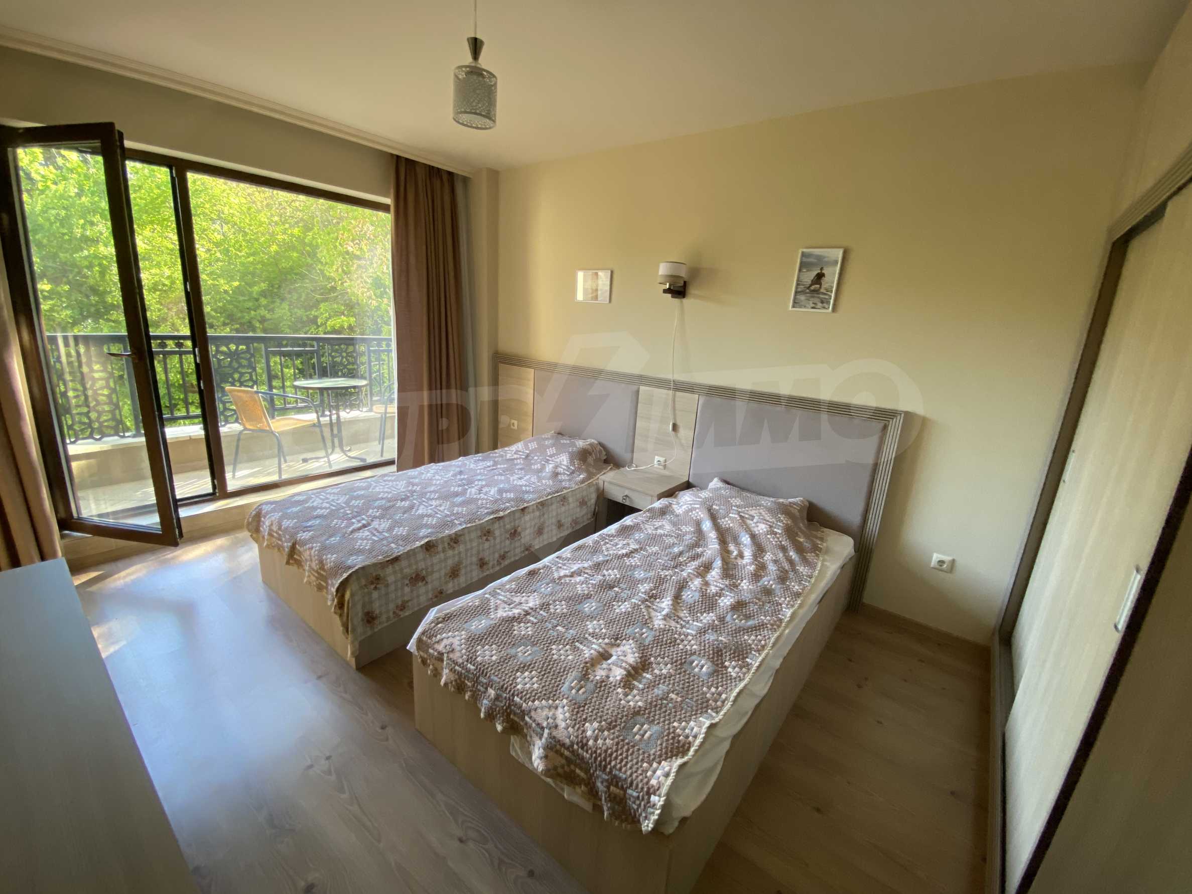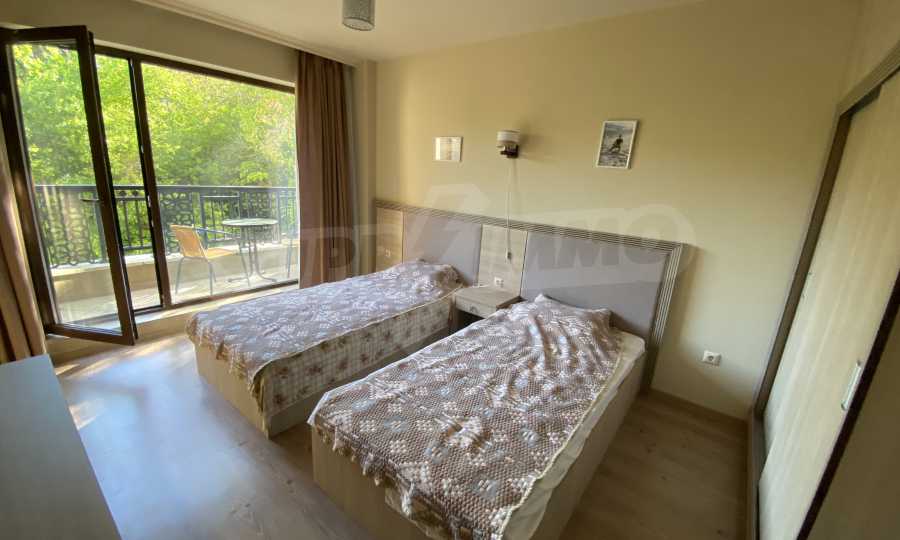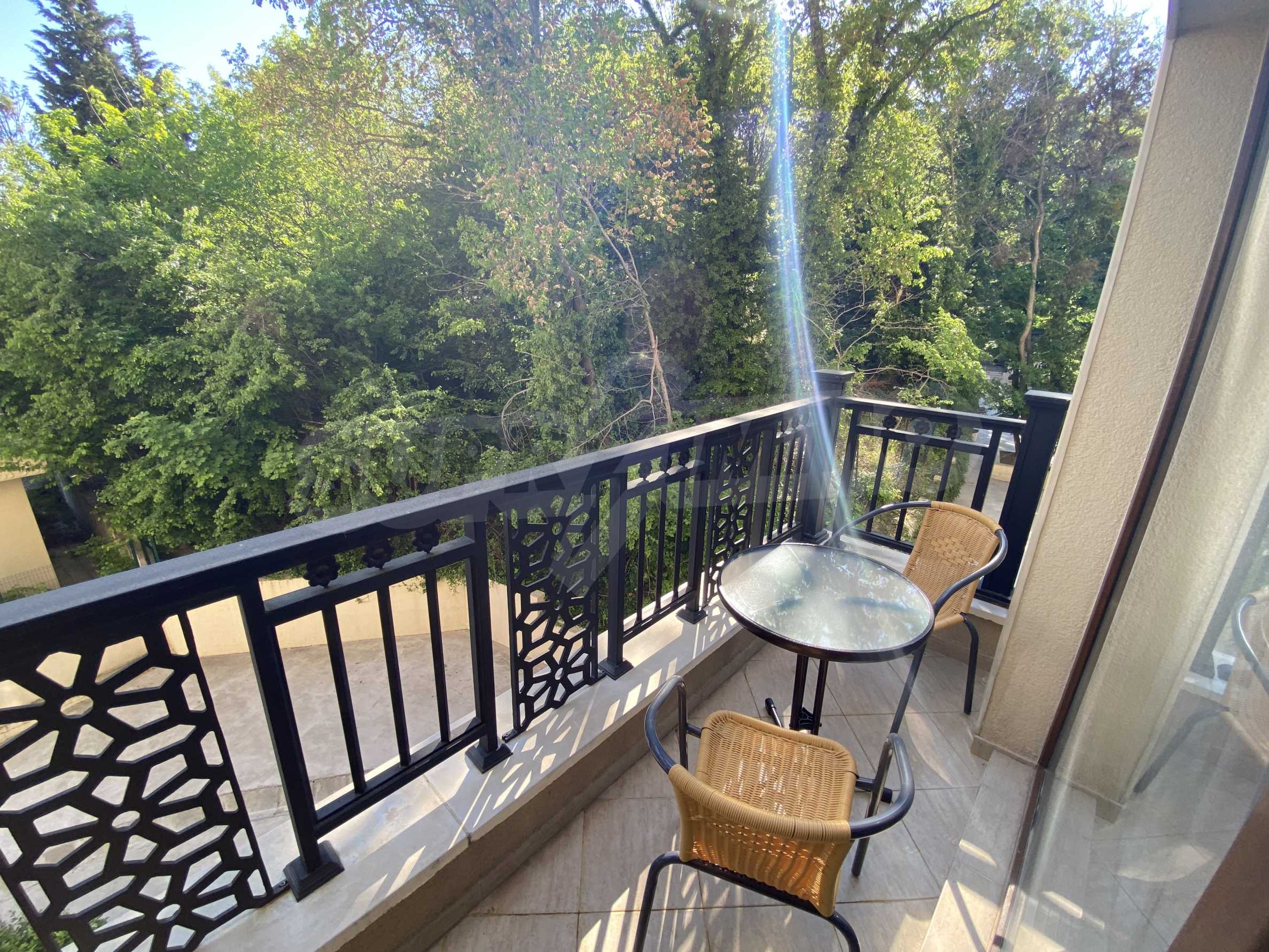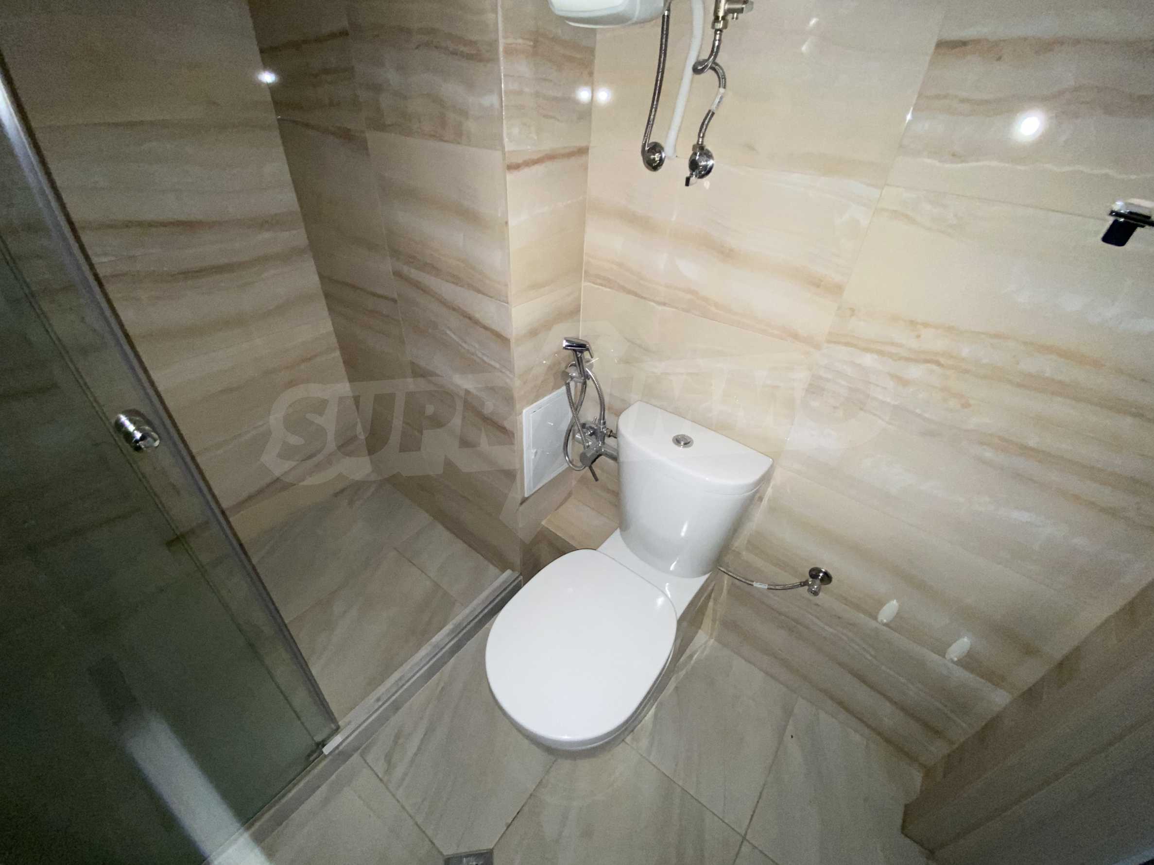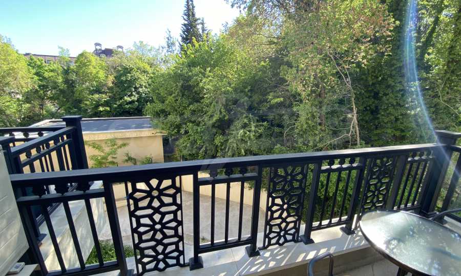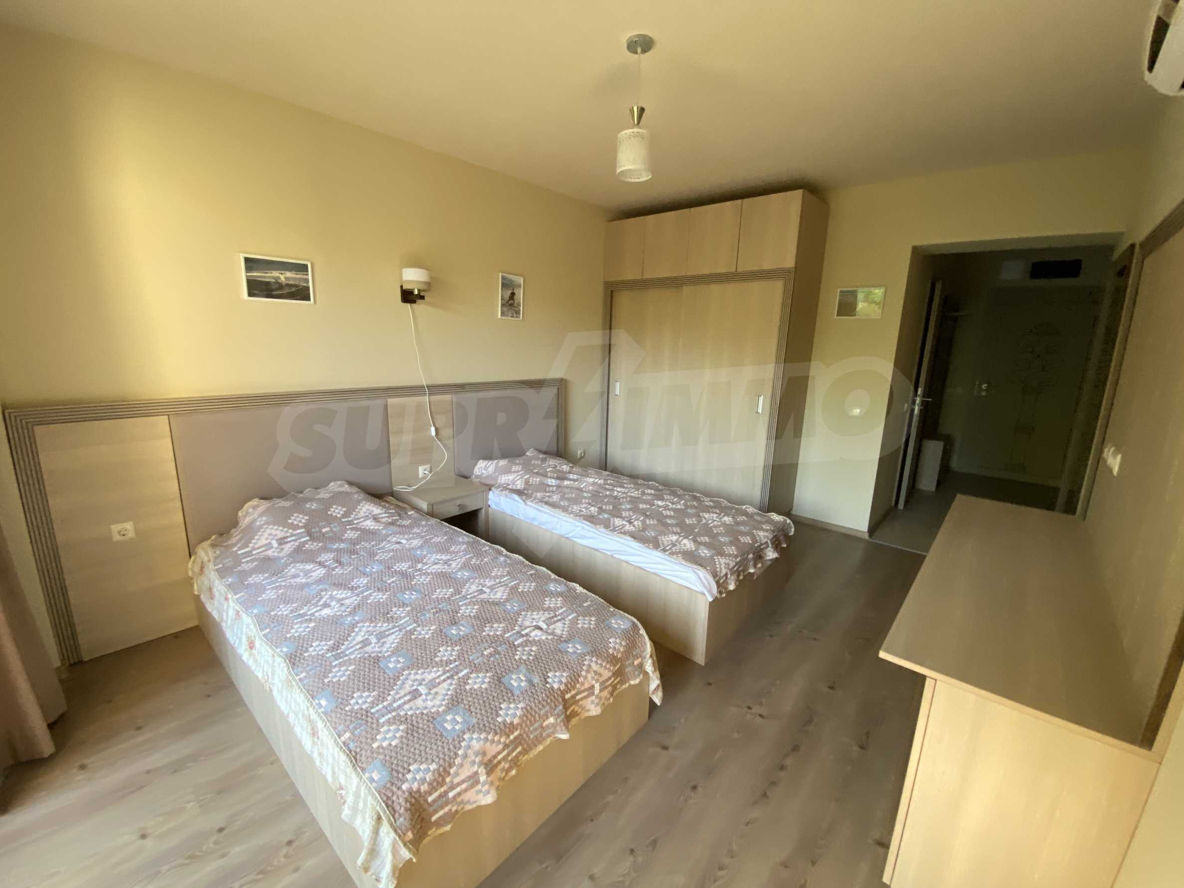 Имотът е разположен на 4-ти етаж, с южно изложение и се състои от една стая, коридор, баня с тоалет и тераса. Студиото е мебелирано и се предлага с цялото оборудване. Мебелировката е изпълнена от инвеститора и е в стила на хотелската част. В коридора е вградена кухненска мебел, оборудвана с мивка, хладилник и пералня. Банята е луксозно изпълнена и разполага с душ кабина, тоалет с биде и мивка с гранитен плот.