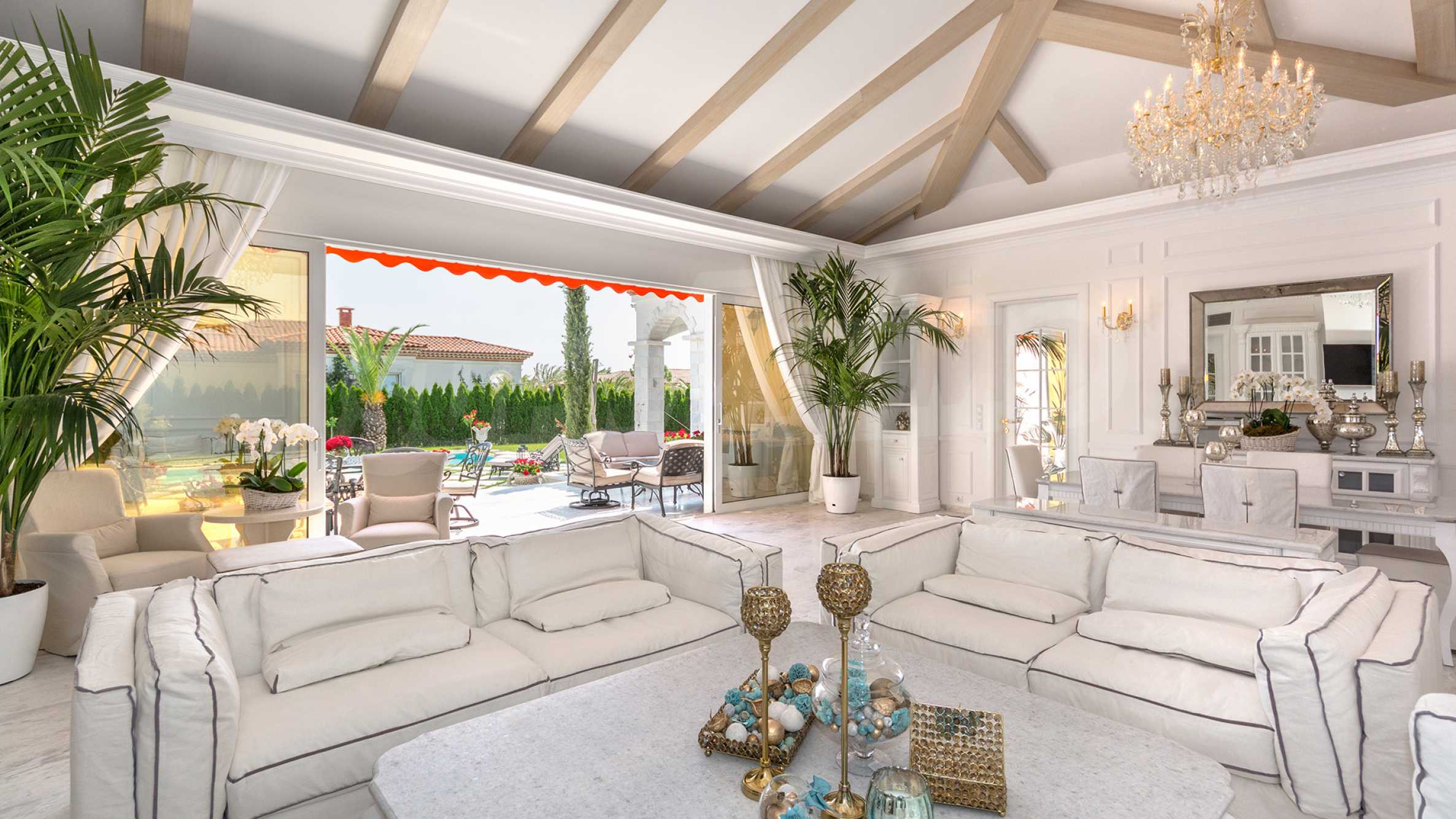 След представителен вход Ви посреща просторен хол. Дневната и кухнята в имота са тип Open space, с обособени кътове за трапезария, почивка и камина. На юг дневната се отваря изцяло към верандата през голяма витрина, уникално преходно пространство идеално за романтични вечери. От верандата има пряк излаз към басейна, ситуиран централно в градината и облицован изцяло с естествен мрамор Pyrgos Light.