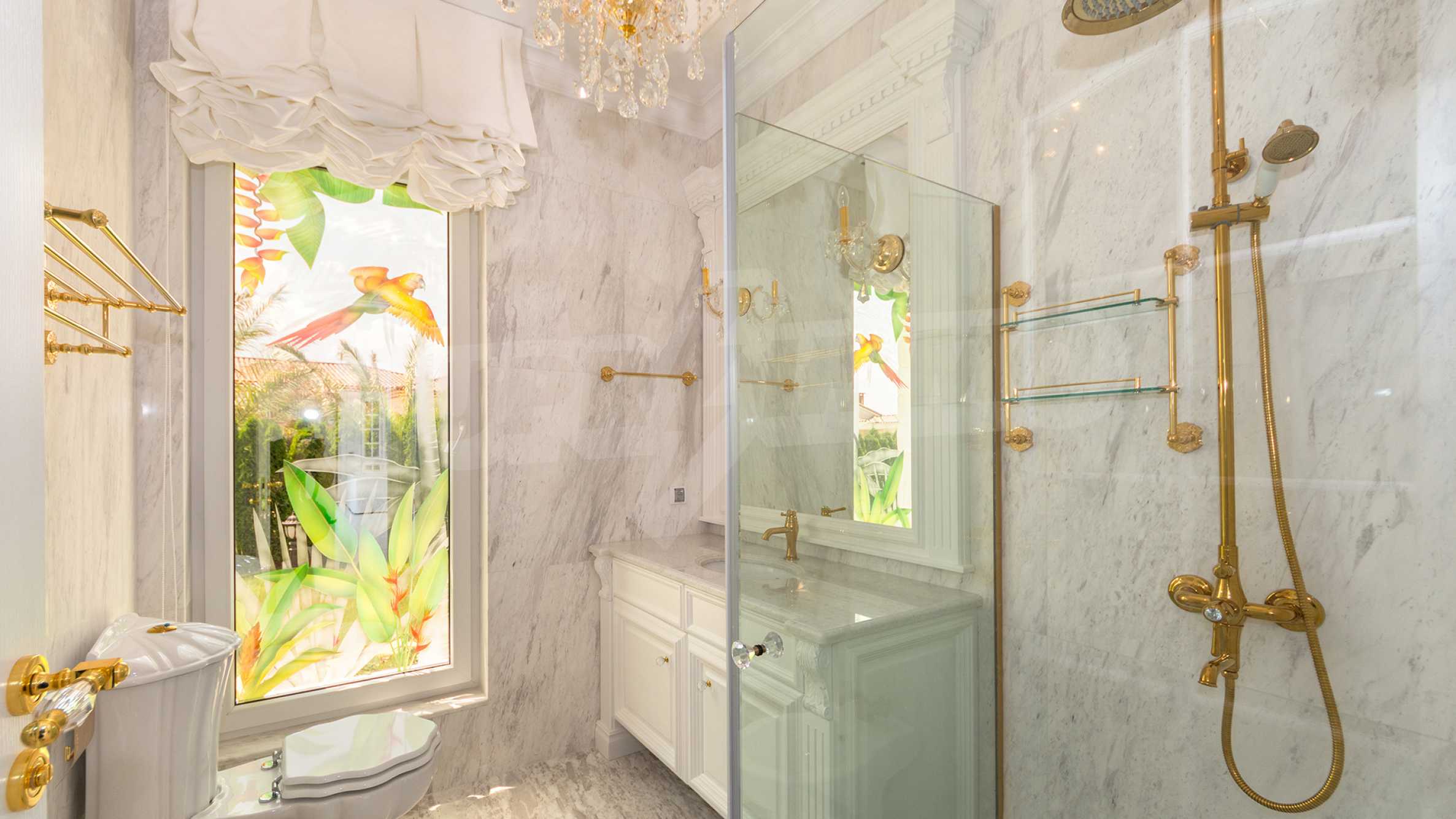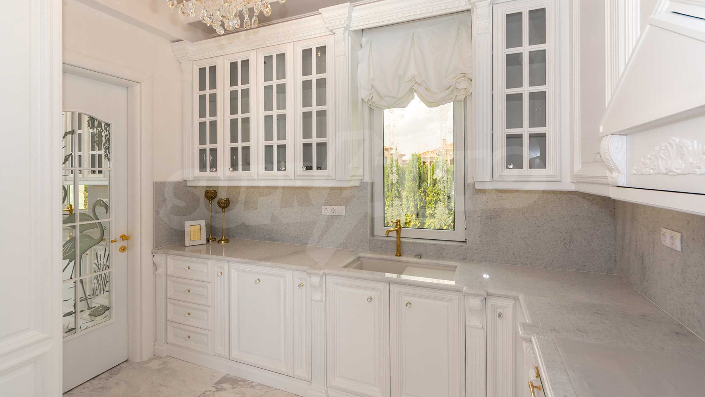 Къщата е луксозно и изискано обзаведена, декорирана е с авторски витражи, с изцяло индивидуално изработени мебели. В интериора са използвани първокласни естествени материали, както и естествен мрамор Pyrgos Light.