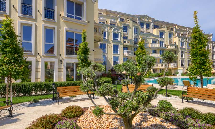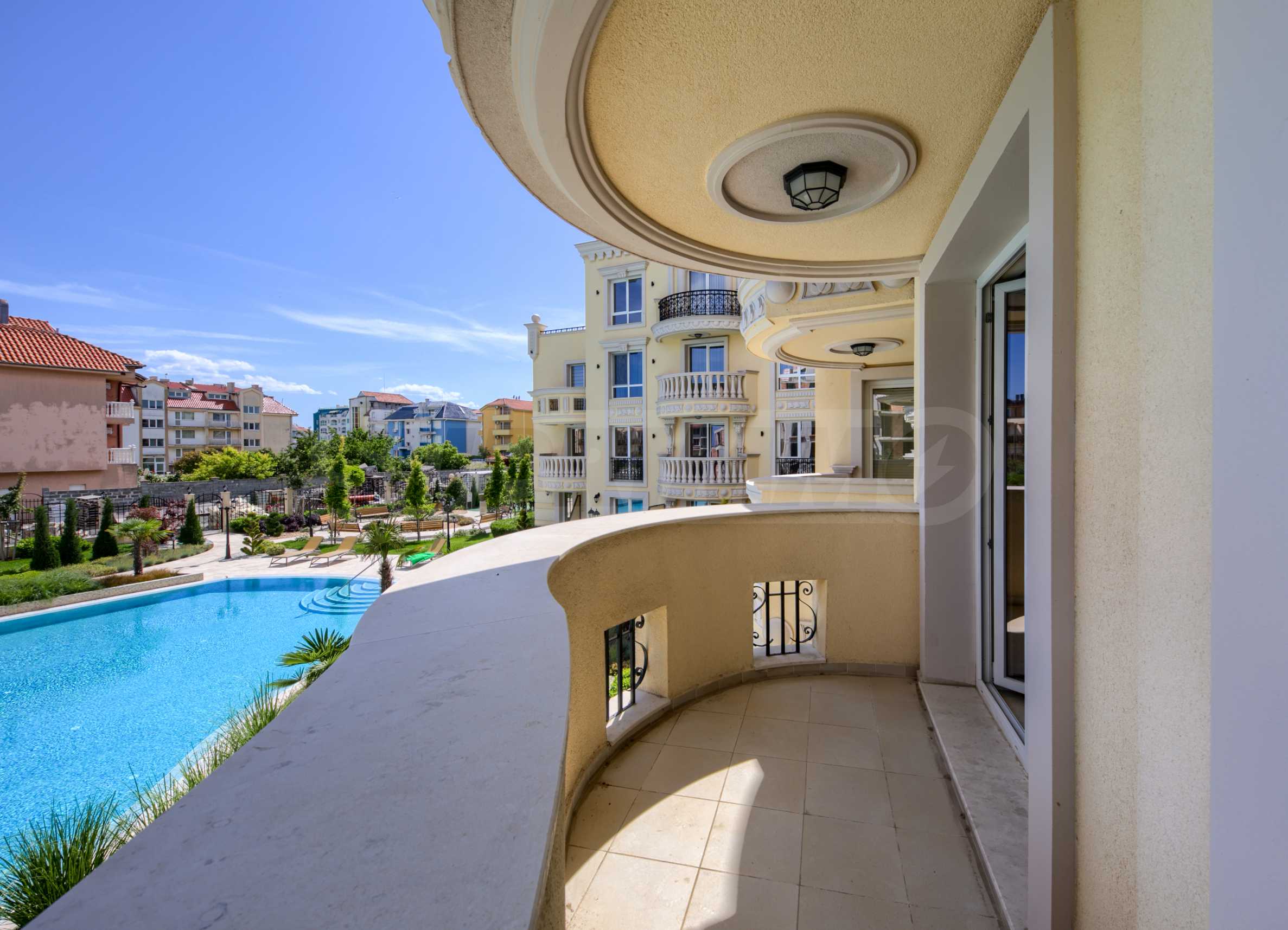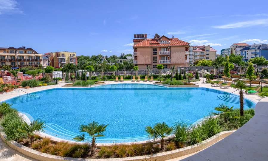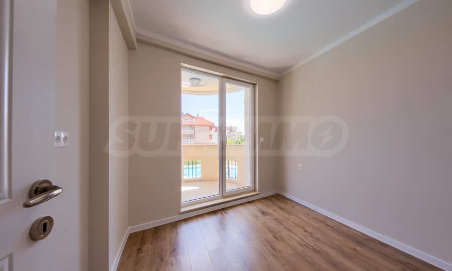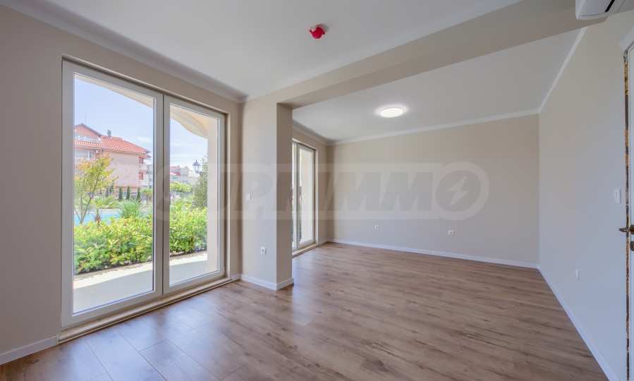 Имотът има веранда от 15.36 кв.м, с гледка към басейна, две уютни спални, дневна/кухня и две бани, едната е с вана.
