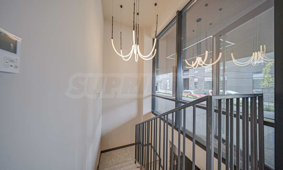 Настилките по общите части на сградата, фоайе, коридори и стълбища са изпълнени с плочи от естествен камък — полиран гранит. Стълбищните парапети са ажурни от алуминий, по архитектурен детайл, видим в интериорните 3D визуализации на сградата. Предвидени са стъклени врати към етажните площадки, които са димоуплътнени, самозатварящи се. За настилките на балконите и лоджиите сме избрали италиански гранитогрес, осигурен срещу хлъзгане. Откритите тераси са с изграден двоен под и подови настилки от италиански керамични плочи.