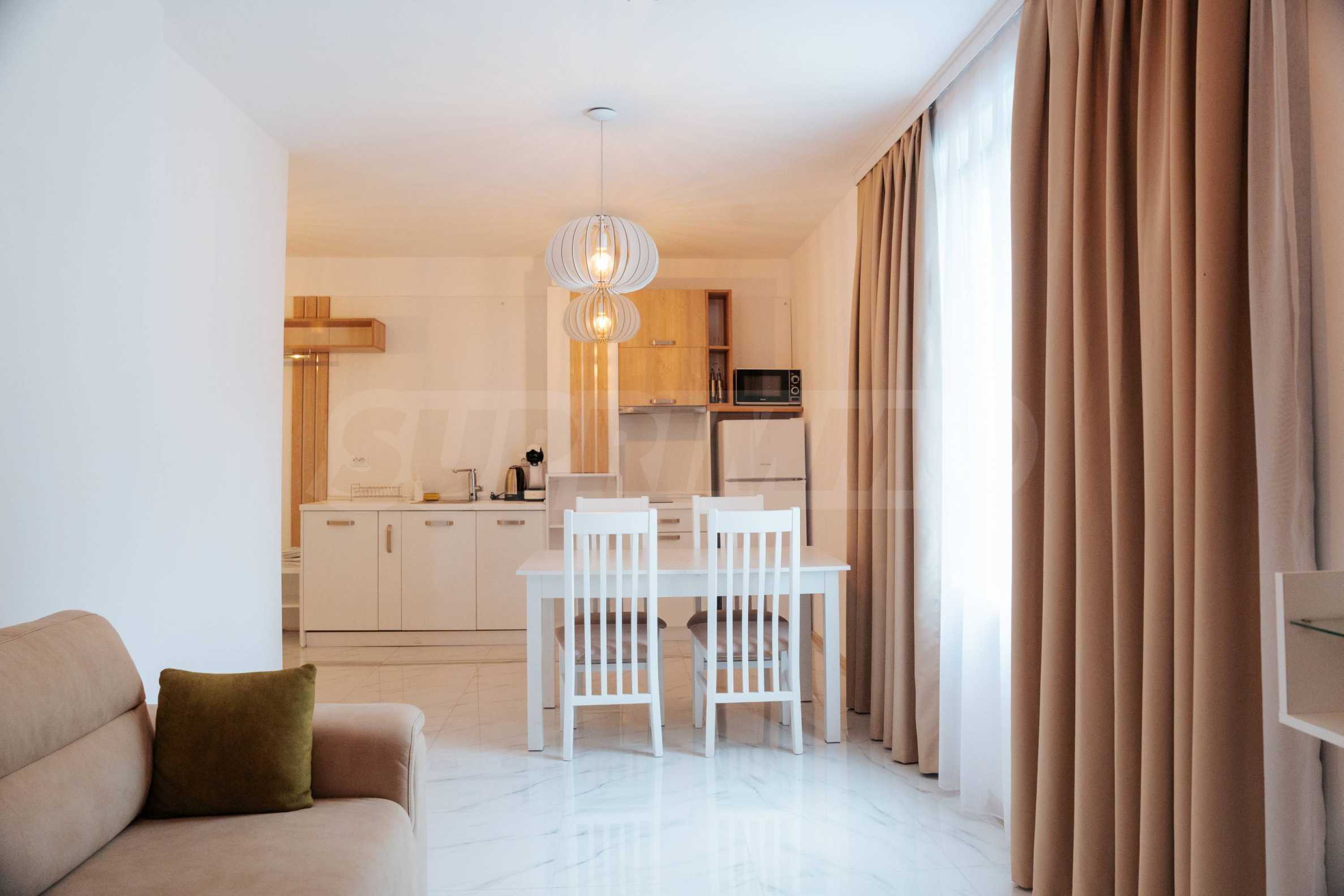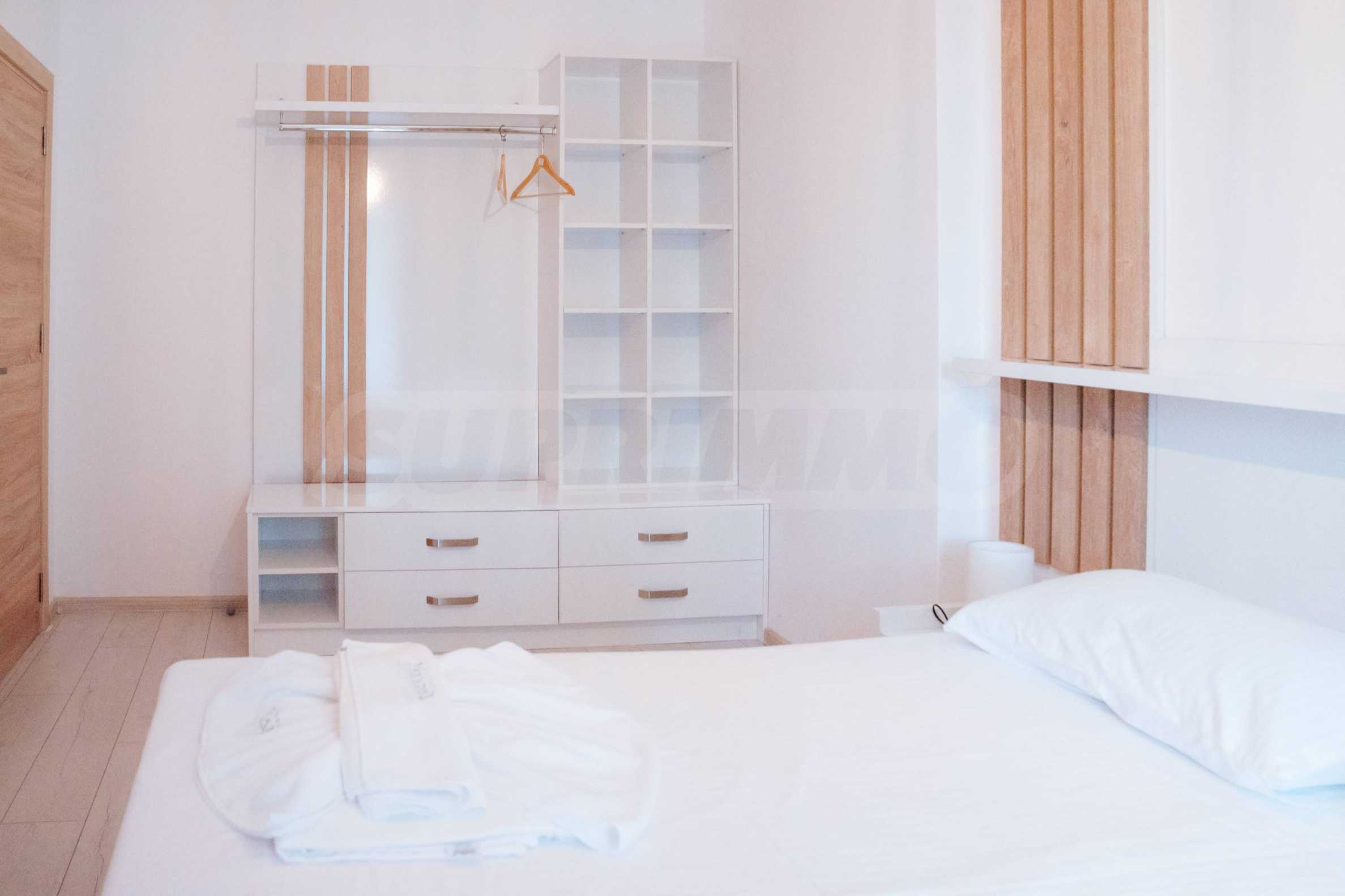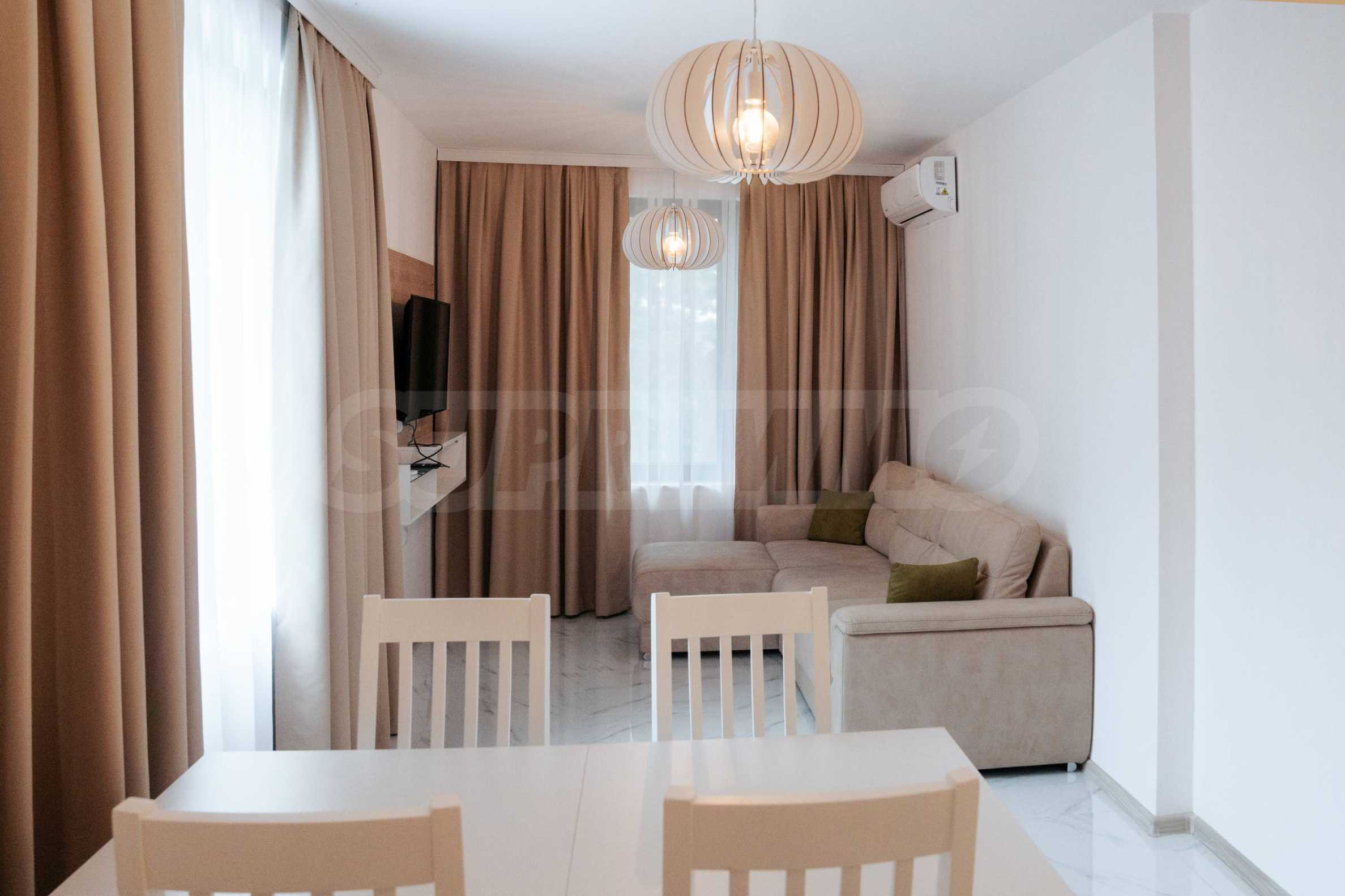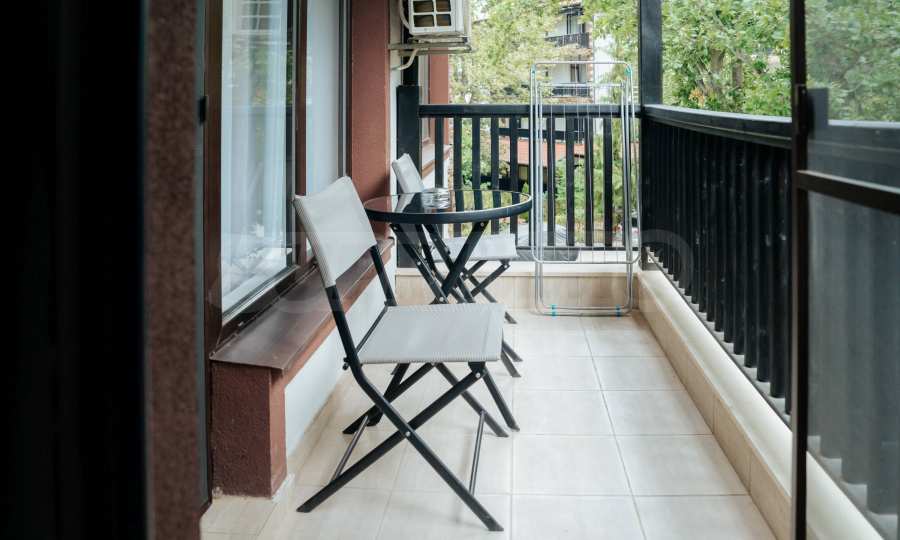 Имотът се намира на 3-ти етаж и се състои от дневна, две спални, две бани с тоалетни, антре и тераса. Предлага се напълно обзаведен, качествено оборудван и е подходящ както за лично ползване, така и за инвестиция благодарение на отличните удобства на територията.