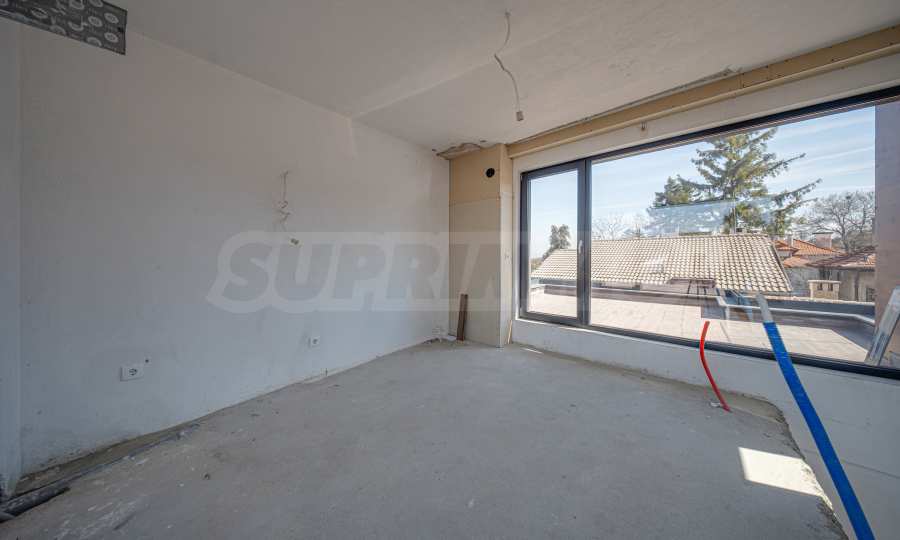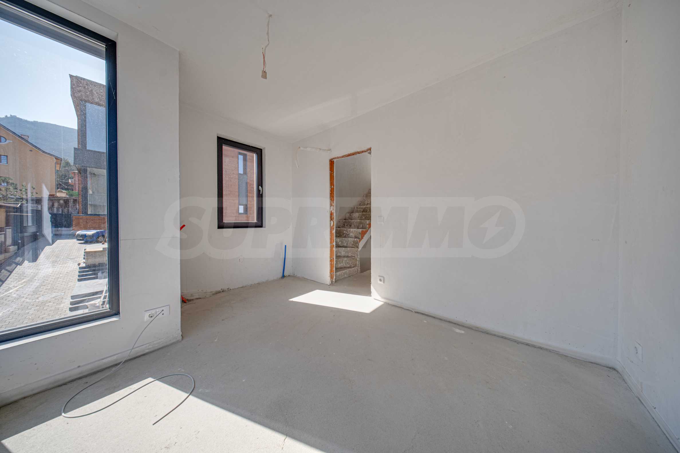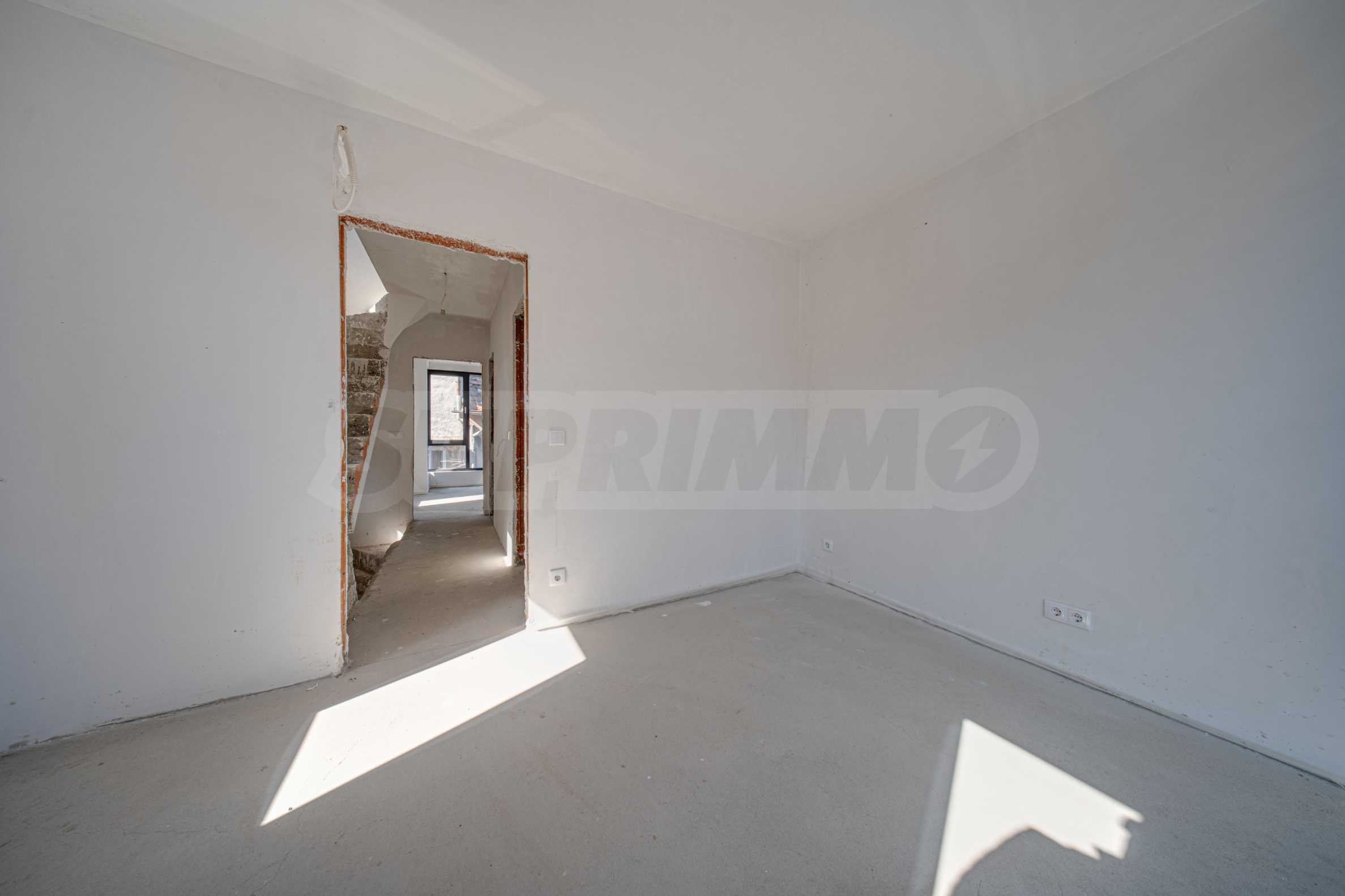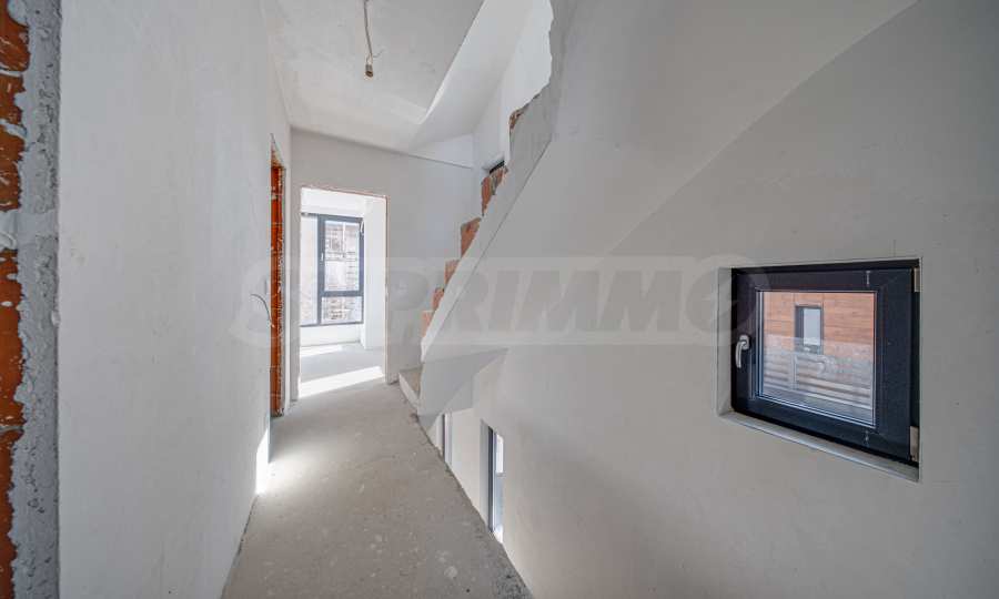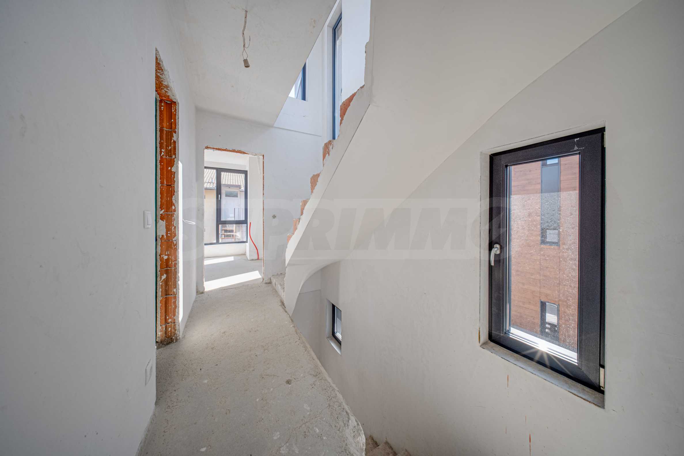 Дневната е на партерен етаж, на следващия етаж има по две спални, една баня с тоалетна, един склад, на трети етаж има две спални, една баня с тоалетна и на етаж четири има още една стая с покривна тераса.