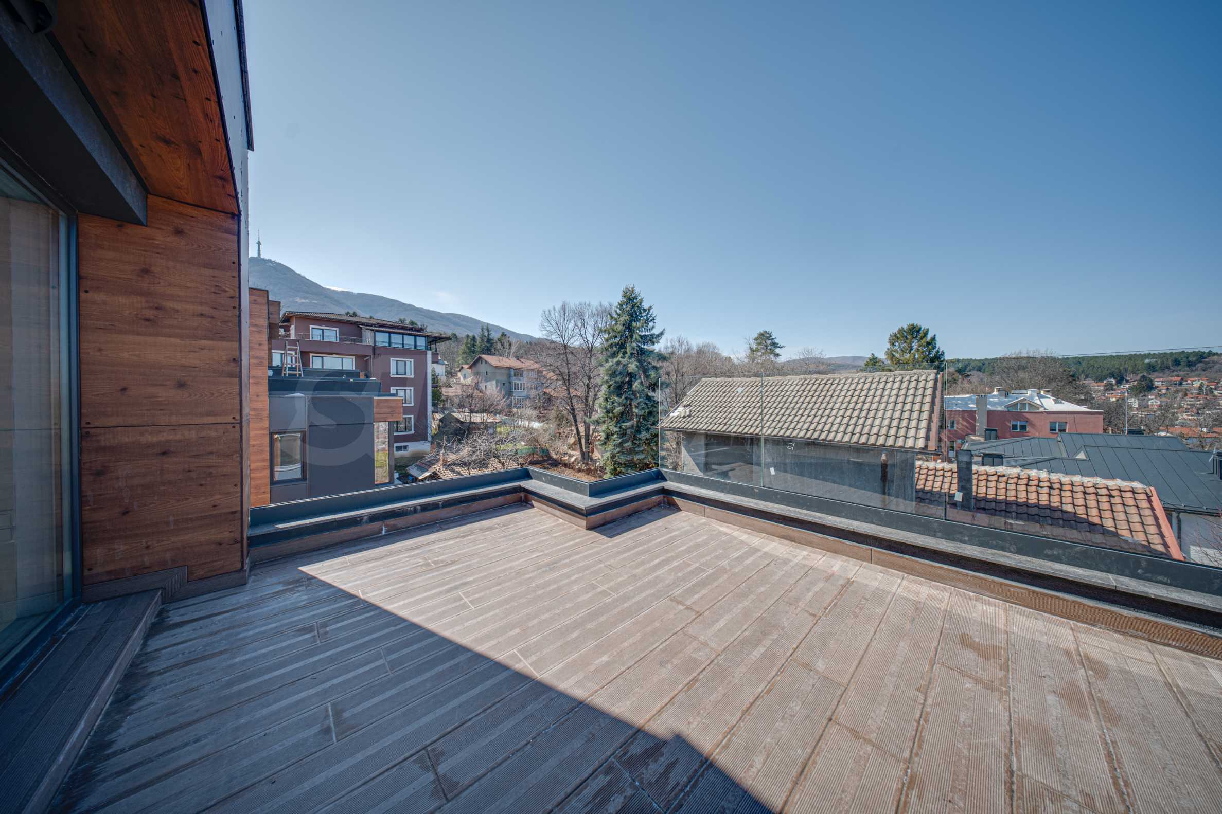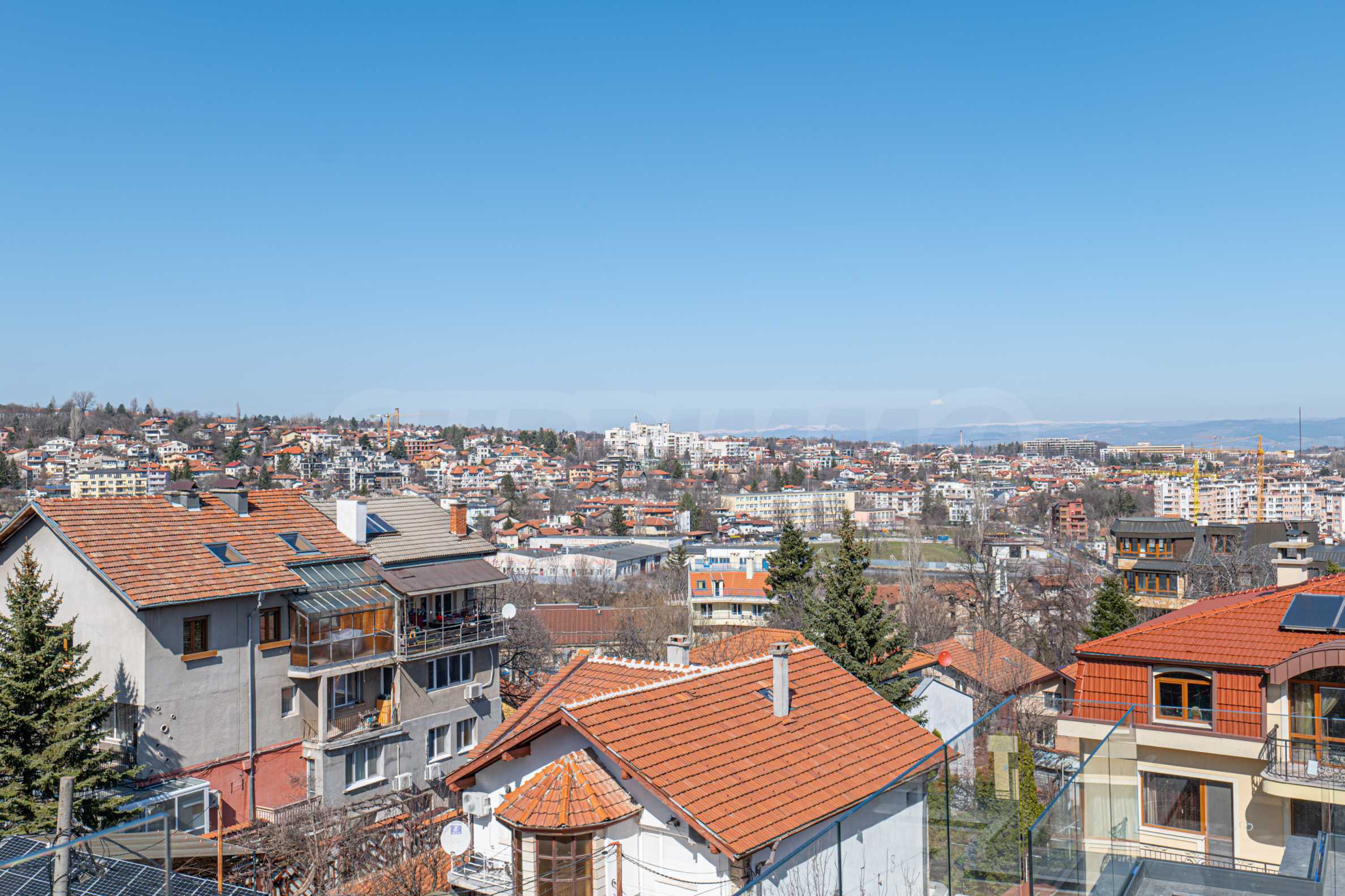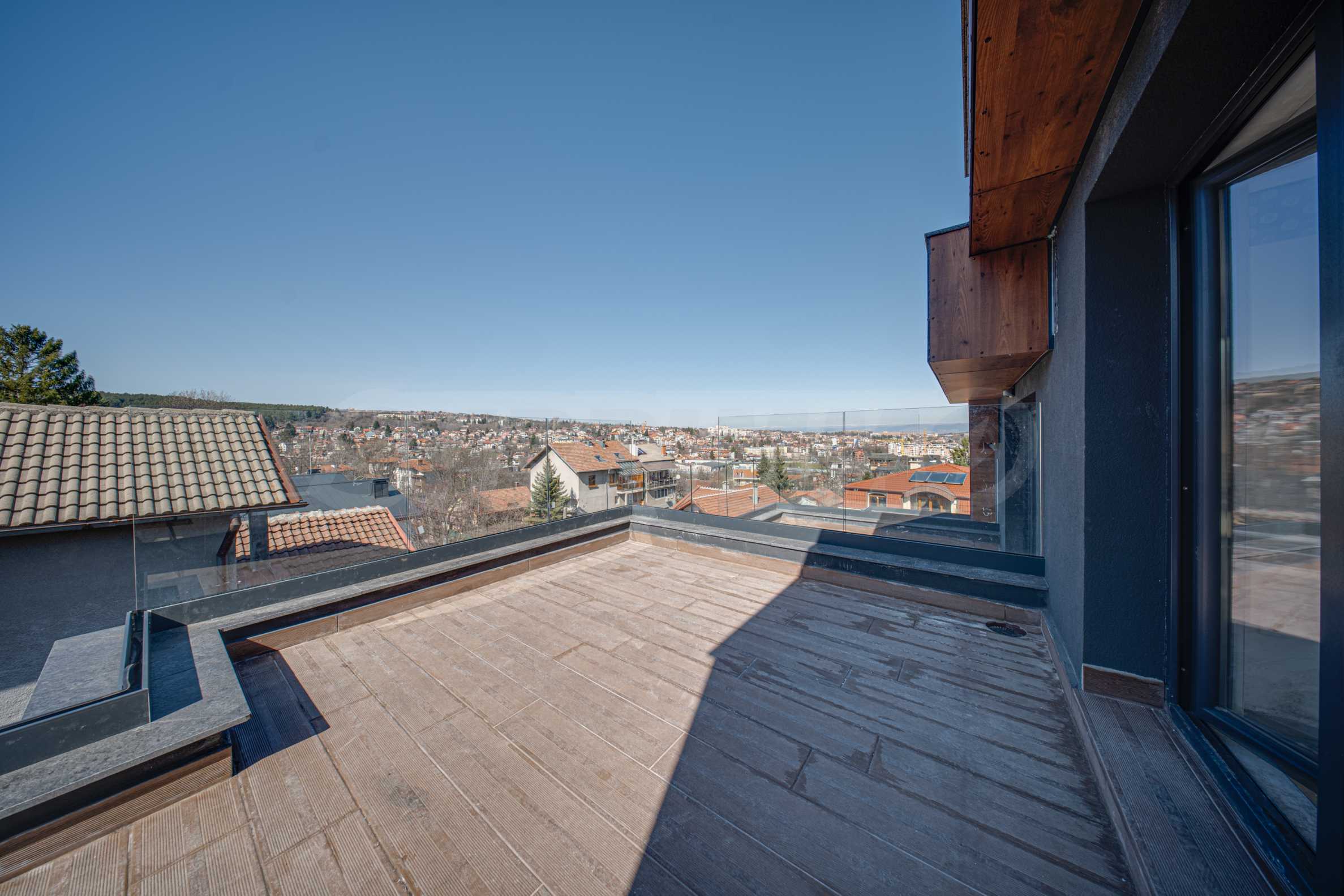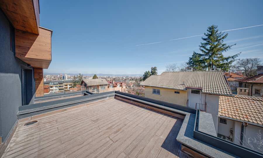 Дневната е на партерен етаж, на следващия етаж има по две спални, една баня с тоалетна, един склад, на трети етаж има две спални, една баня с тоалетна и на етаж четири има още една стая с покривна тераса.