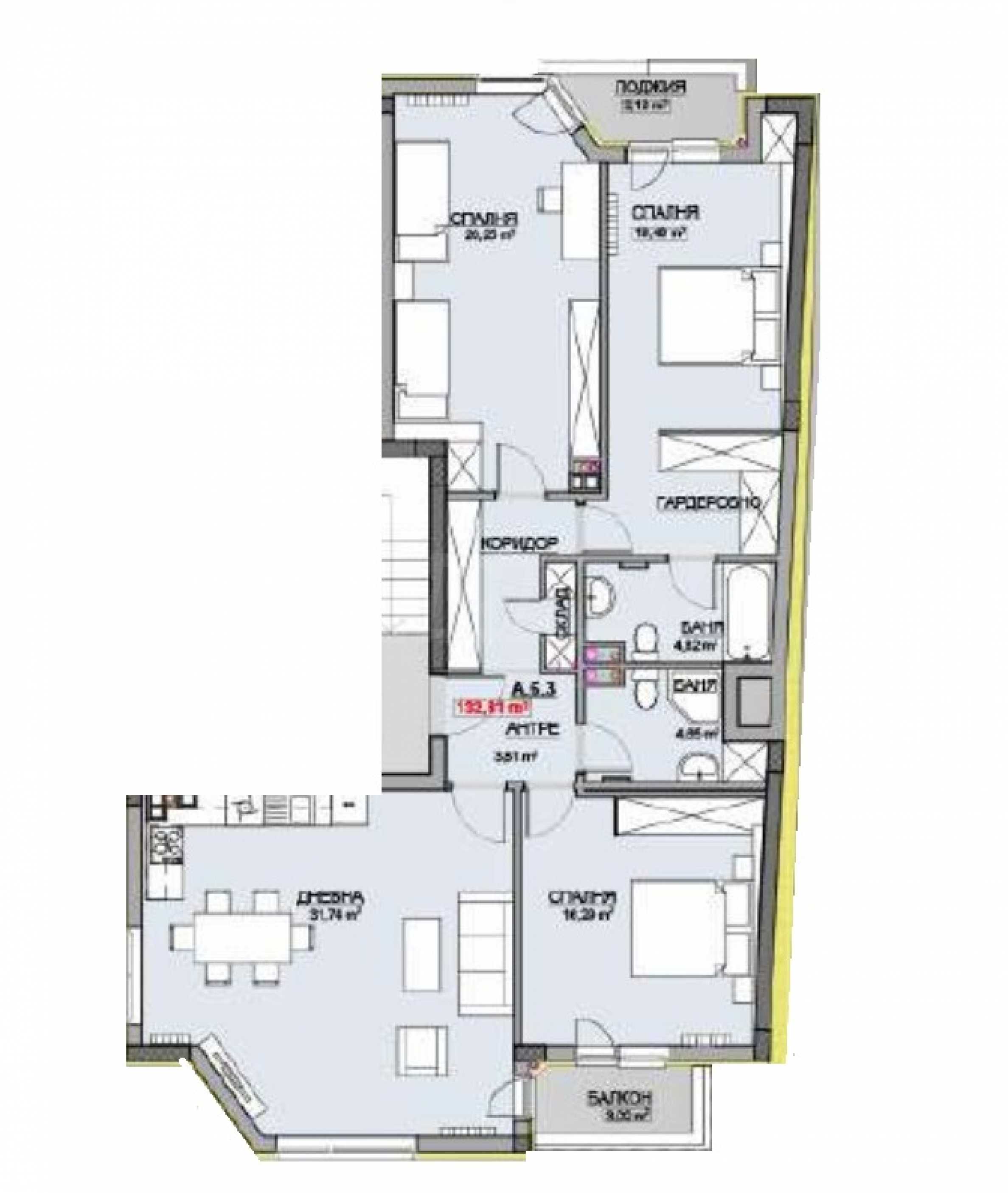 Имотът е ситуиран на 6-и етаж, с източно изложение и 126.70 кв.м обща площ. На чиста площ от 96.52 кв.м са разпределени всекидневна с кухненски бокс, две спални, баня с тоалетна, антре, склад, коридор, тоалетна, две лоджии.