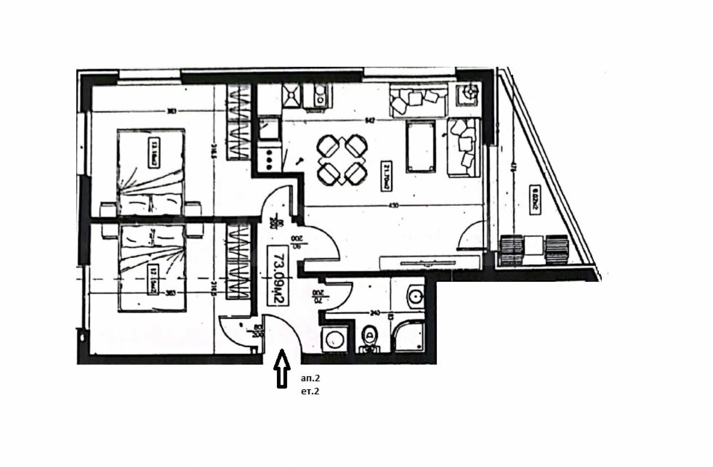 Състои се от входно антре, просторна дневна с кухненски бокс, две спални, баня с тоалетна и тераса.