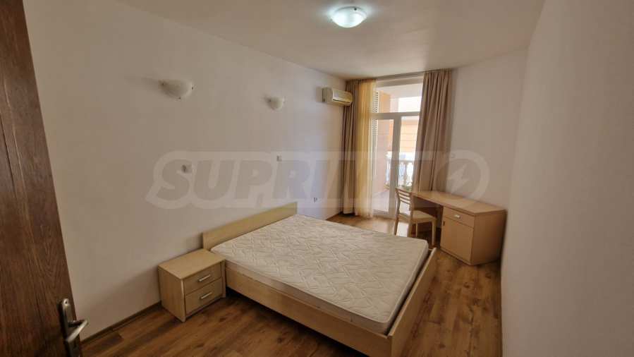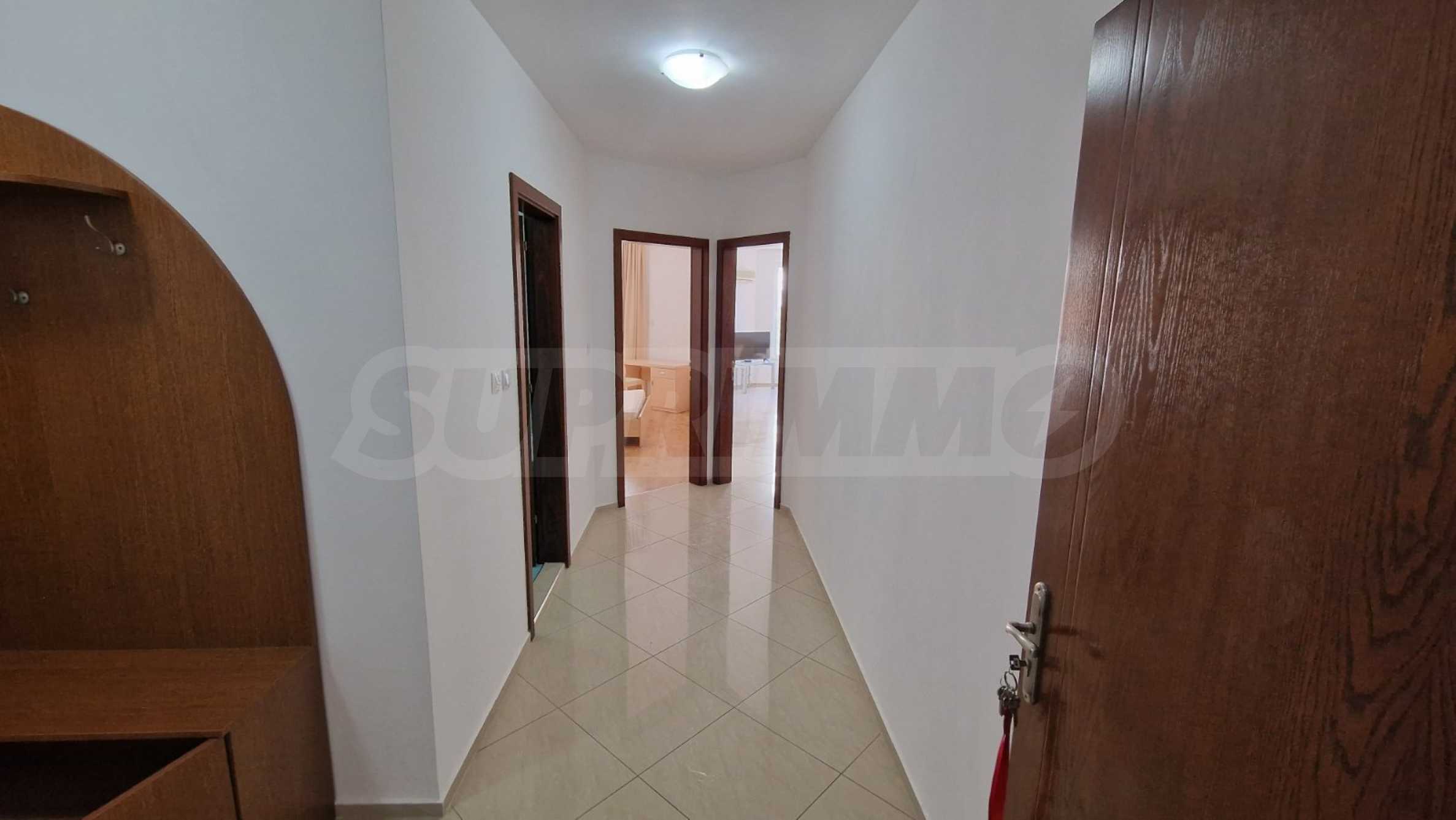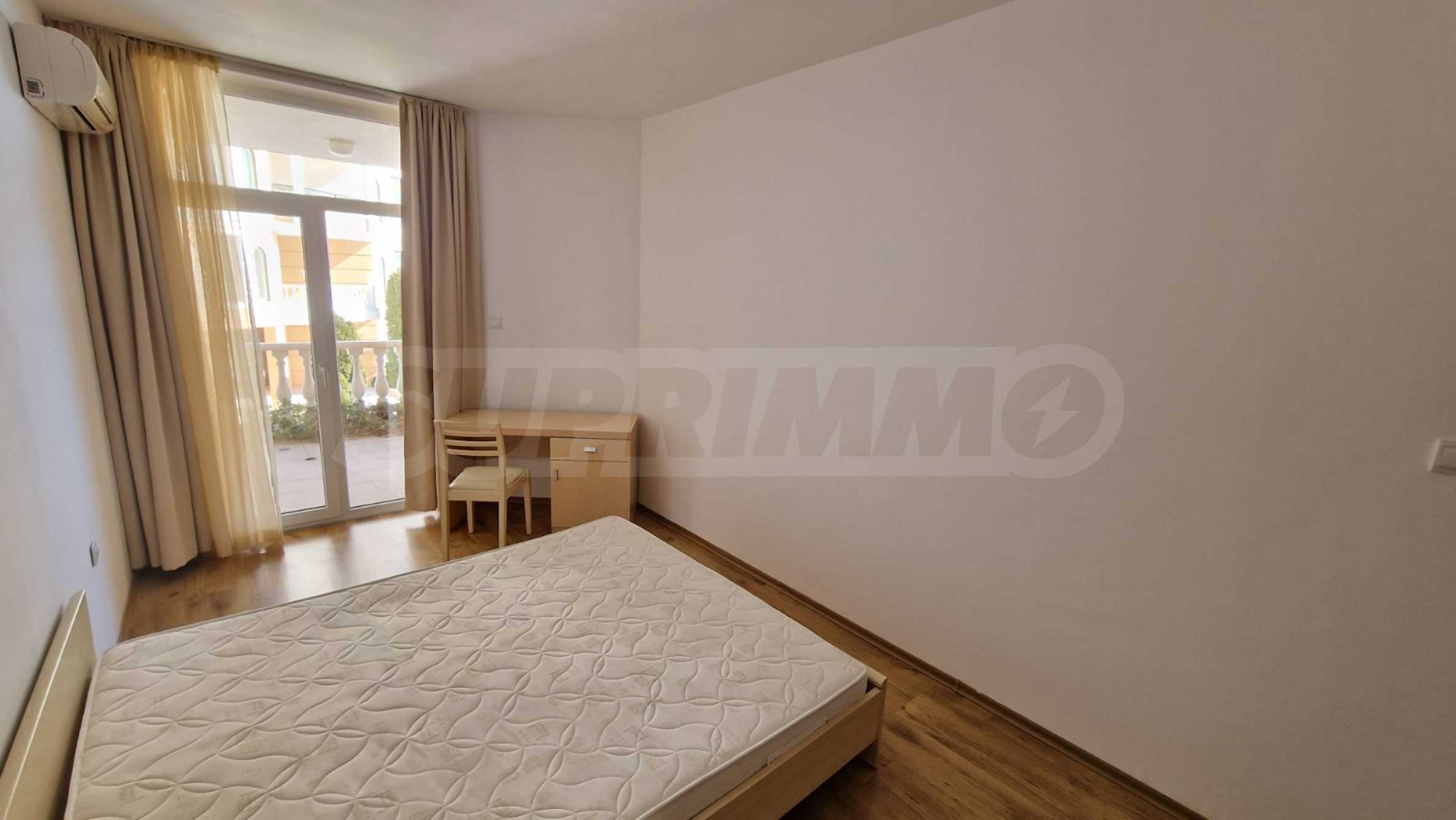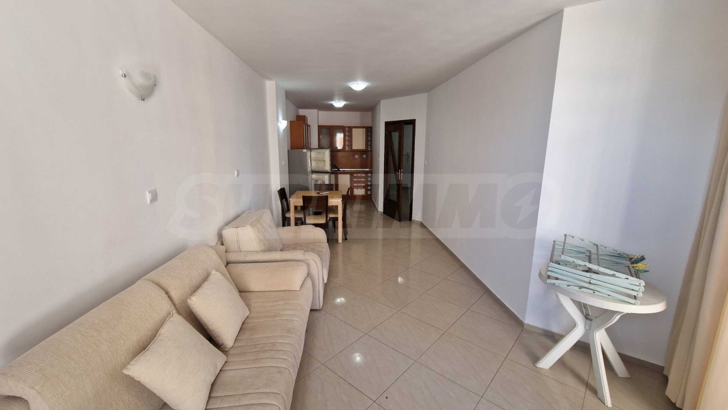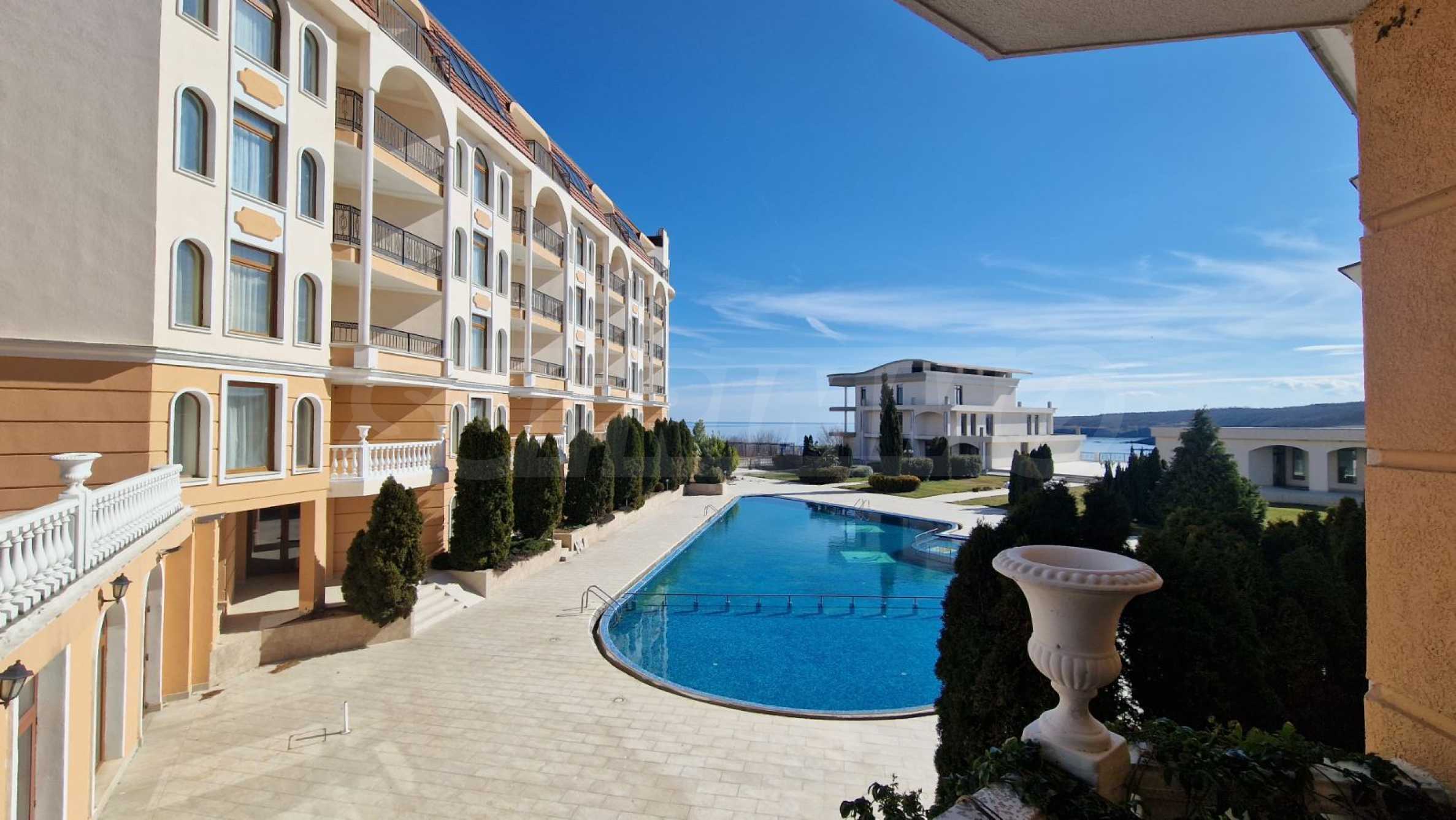 Апартаментът се намира на 1-ви етаж и е с площ 83.56 кв.м. Има частична гледка море, фронтална към красивия басейн.
