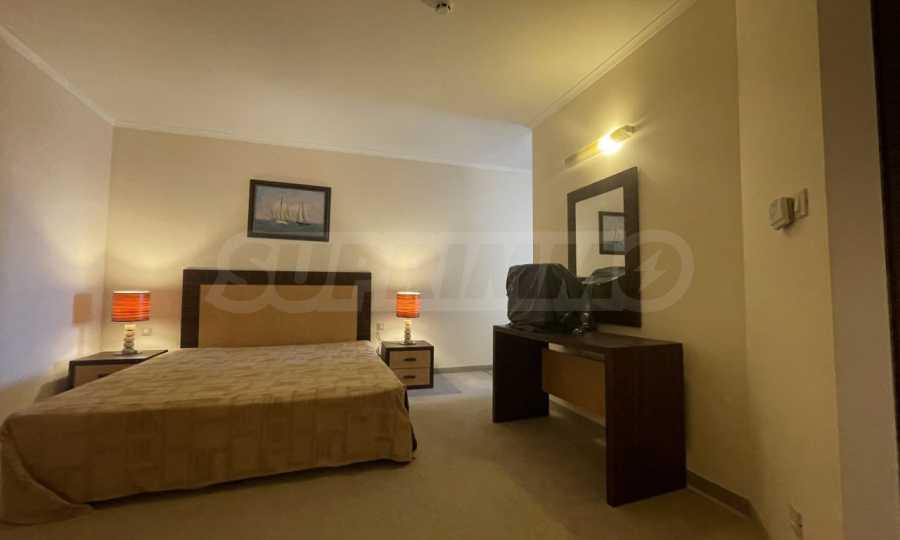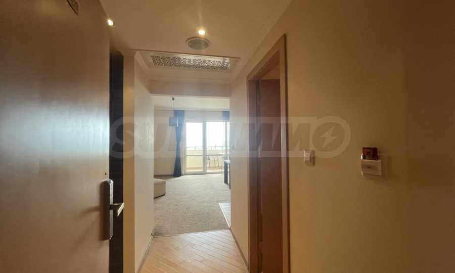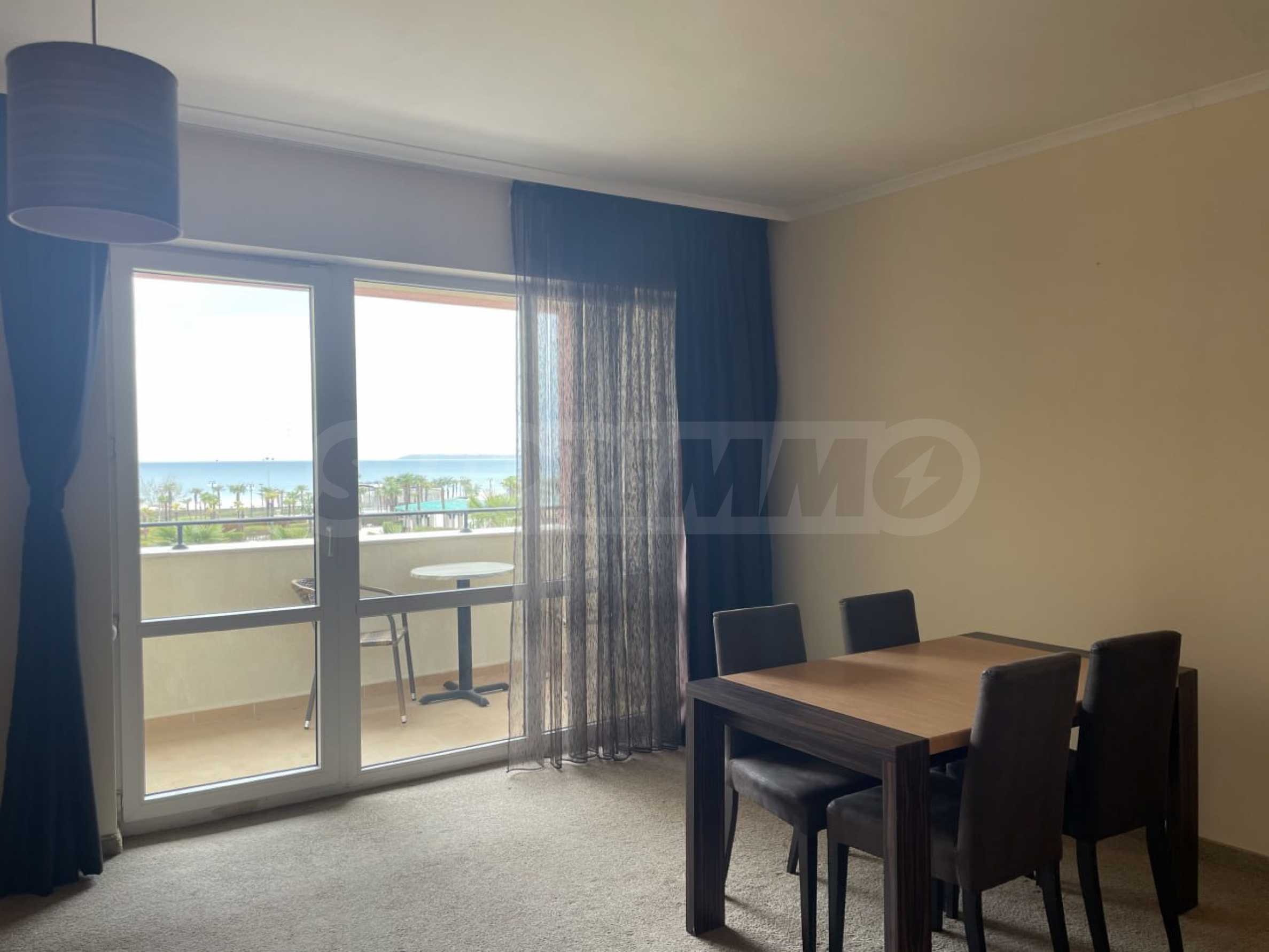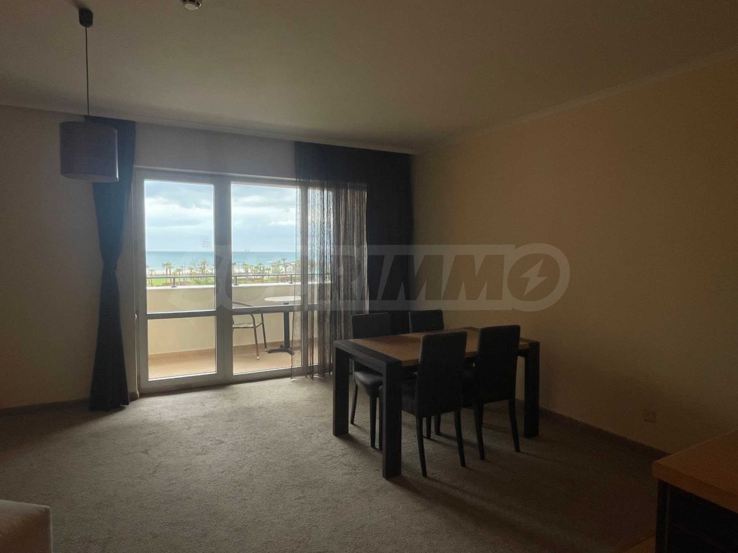 Апартаментът се намира на 3-ти етаж, с обща площ 75 кв.м: антре, всекидневна с кухня и трапезария, просторна спалня, баня с вана, тераса с фронтална панорамна гледка към морето и красивата територия на комплекса. Имотът е напълно оборудван, продава се с необходими мебели и уреди и е готов за комфортен престой или за отдаване под наем.