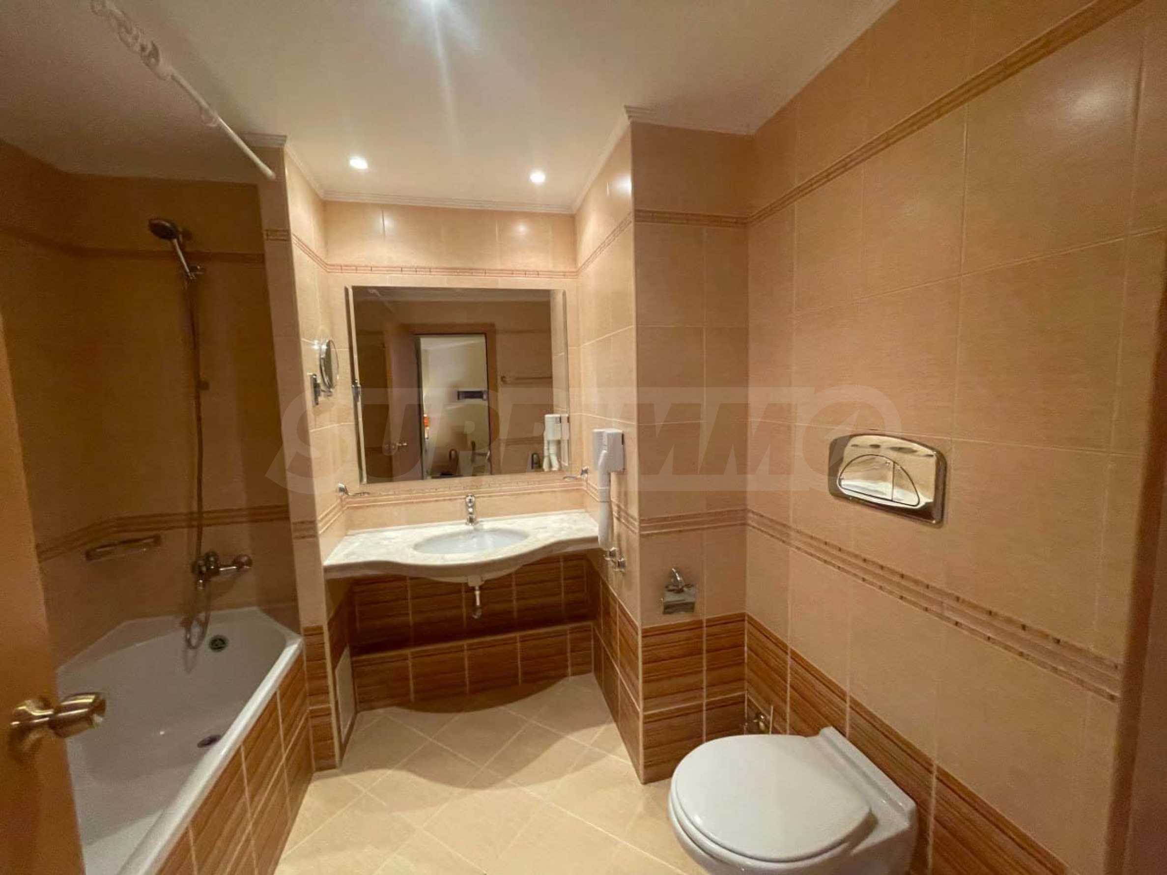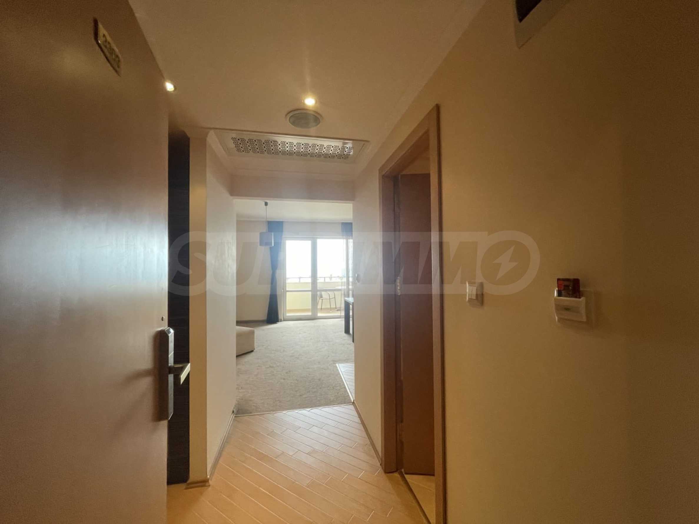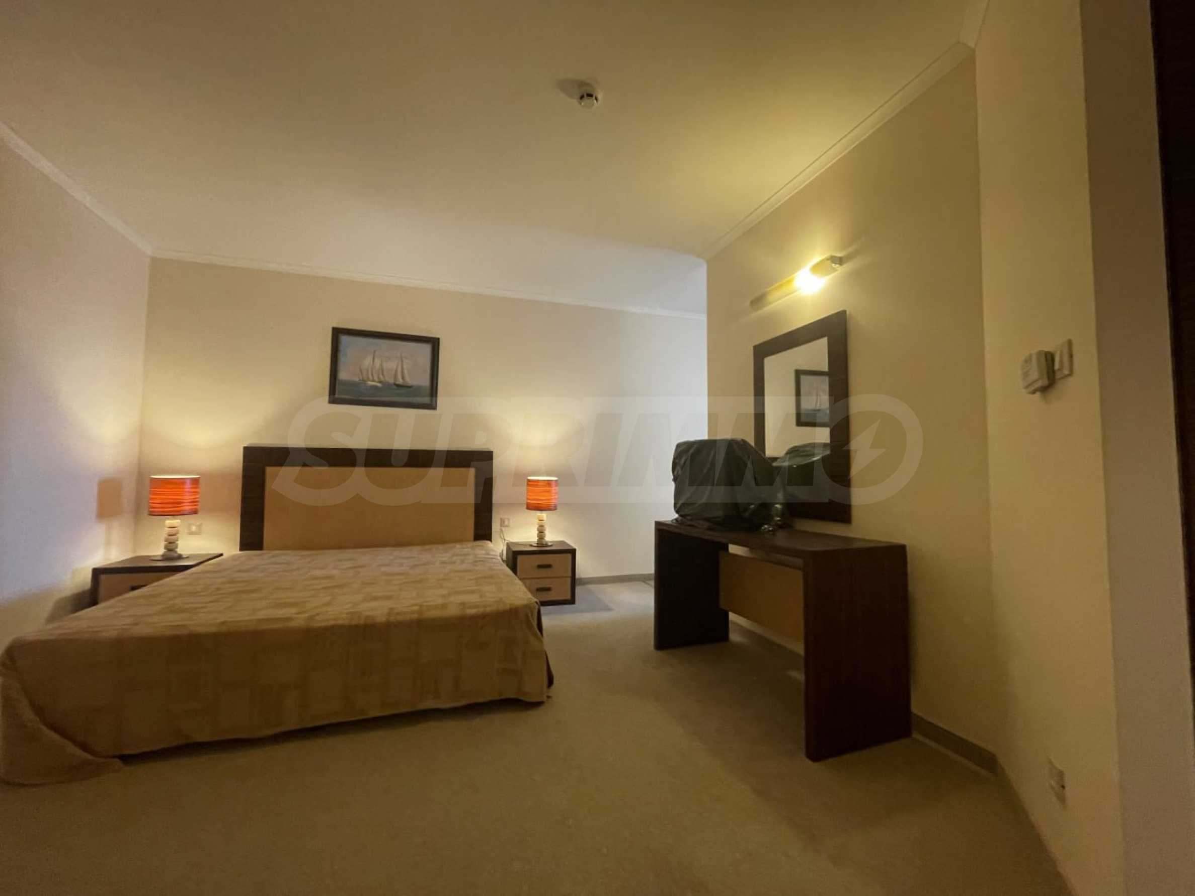 Апартаментът се намира на 3-ти етаж, с обща площ 75 кв.м: антре, всекидневна с кухня и трапезария, просторна спалня, баня с вана, тераса с фронтална панорамна гледка към морето и красивата територия на комплекса. Имотът е напълно оборудван, продава се с необходими мебели и уреди и е готов за комфортен престой или за отдаване под наем.