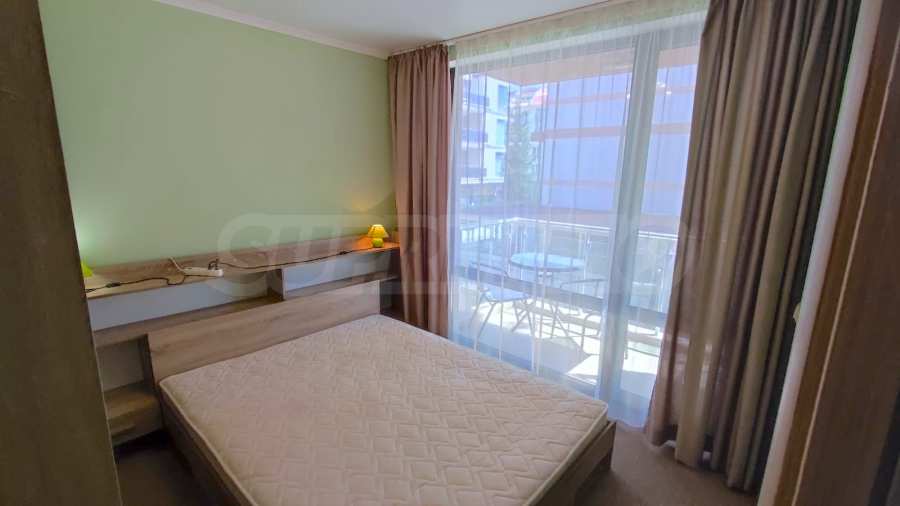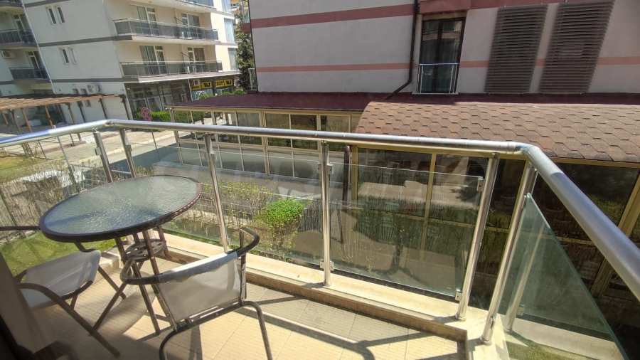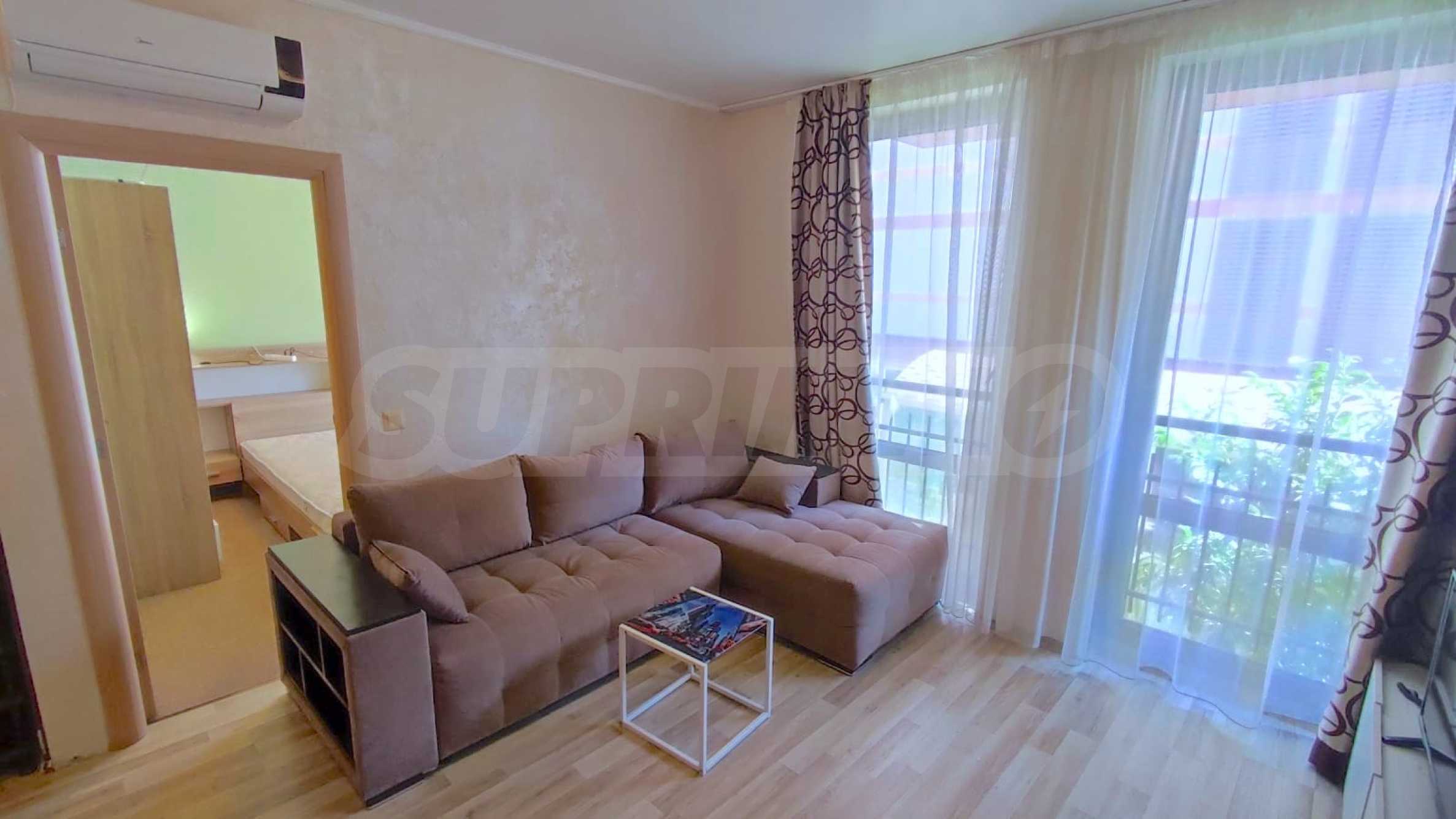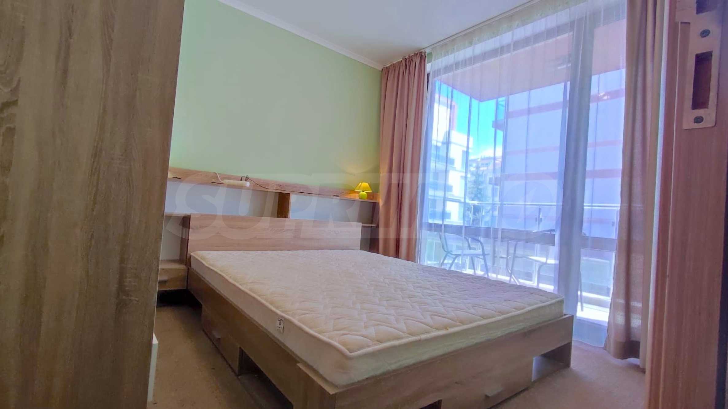 Апартаментът се намира на втори етаж и е обзаведен с всичко необходимо за живеене, а от терасата се разкрива гледка към единия от басейните.