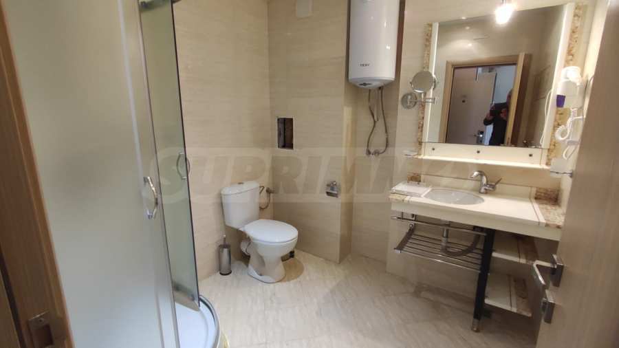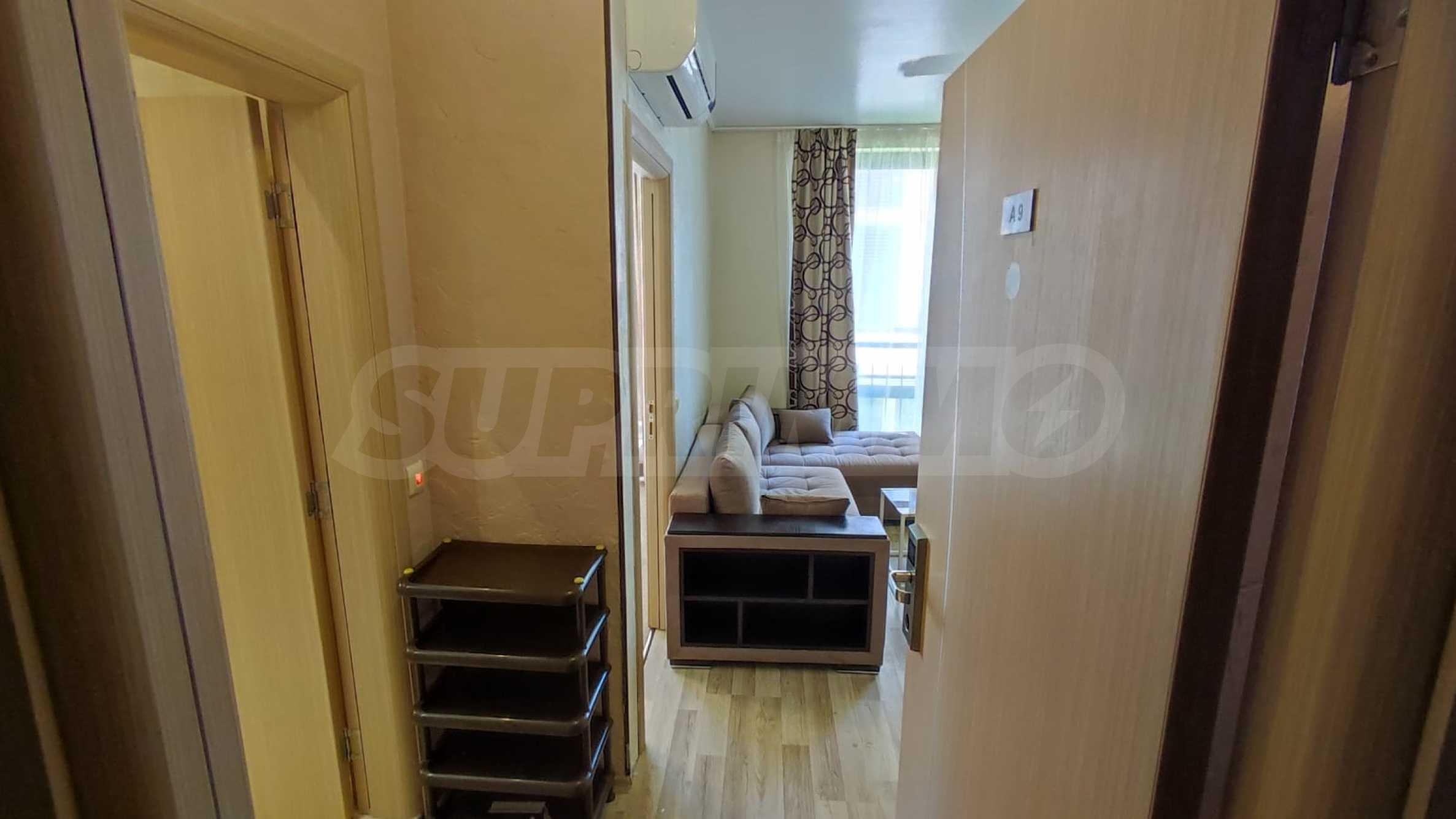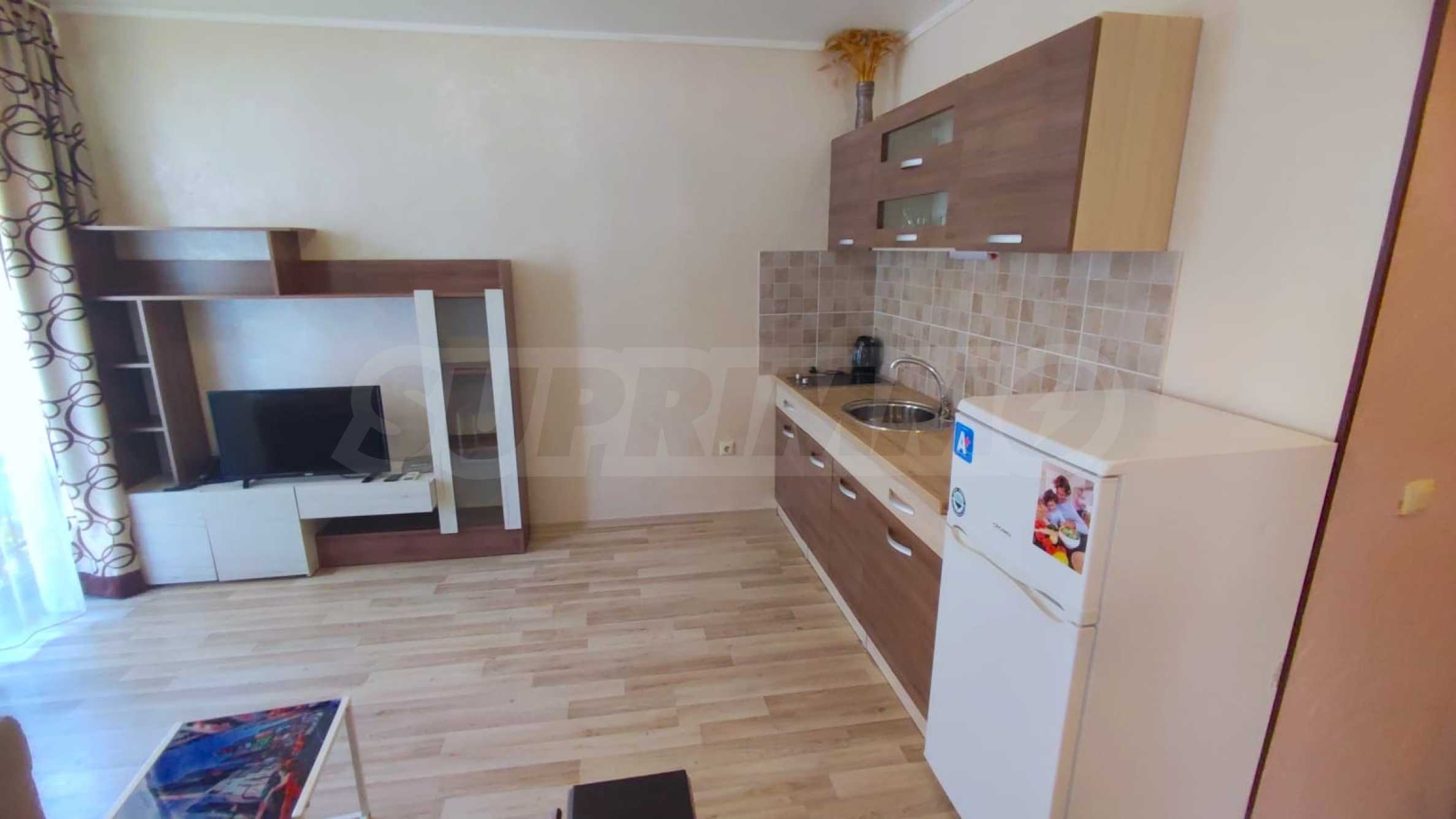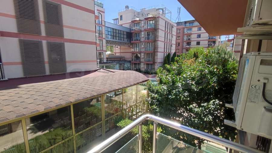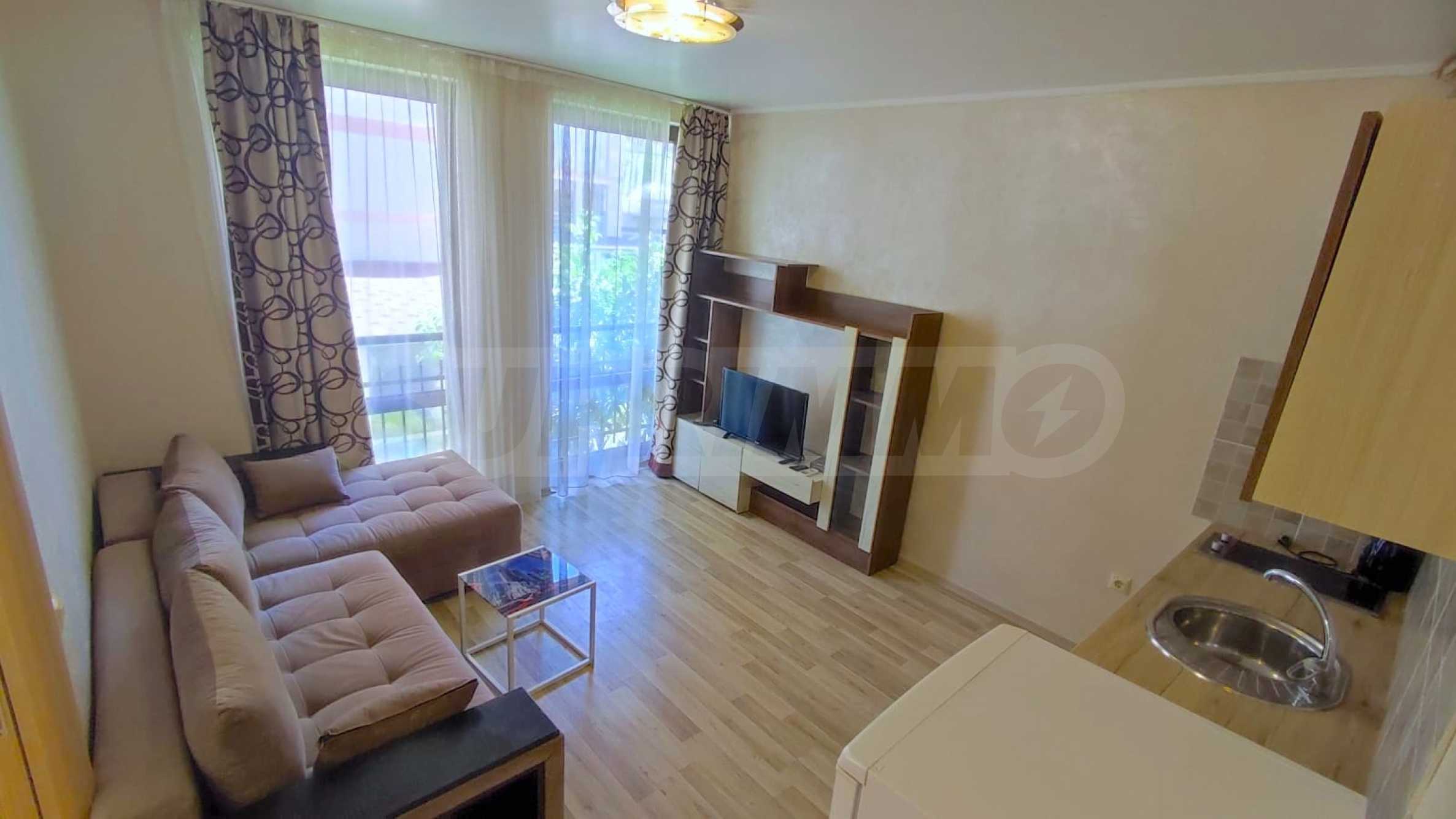 Апартаментът се намира на втори етаж и е обзаведен с всичко необходимо за живеене, а от терасата се разкрива гледка към единия от басейните.