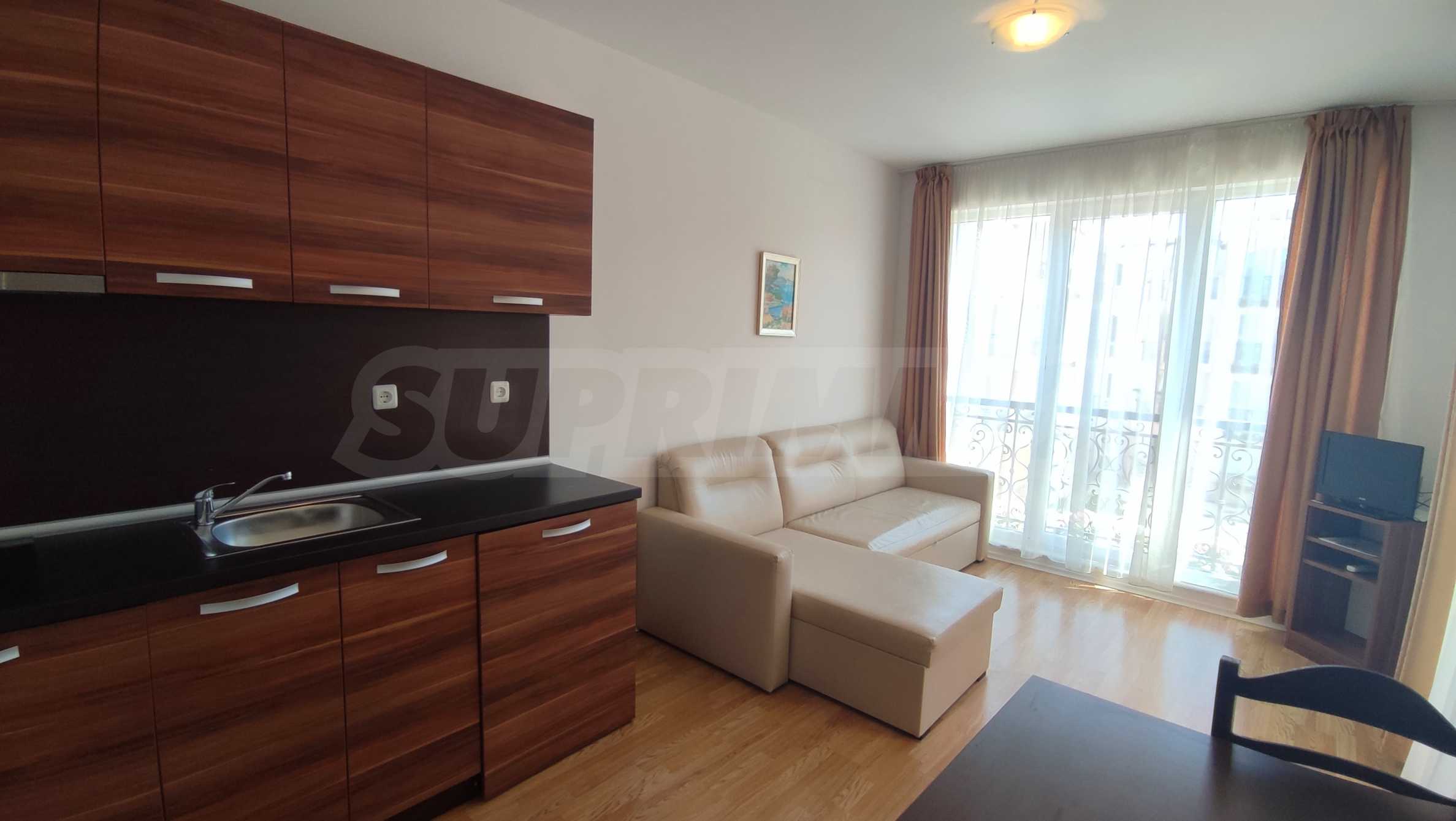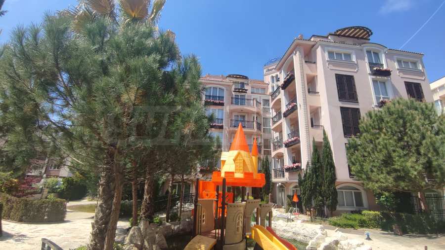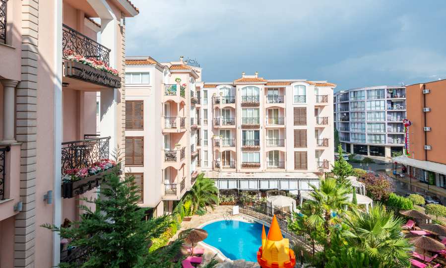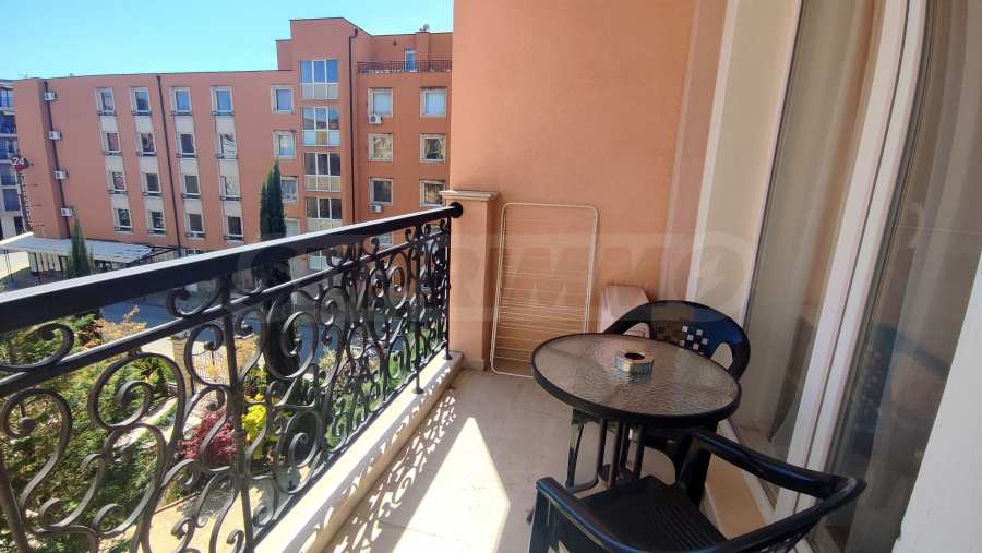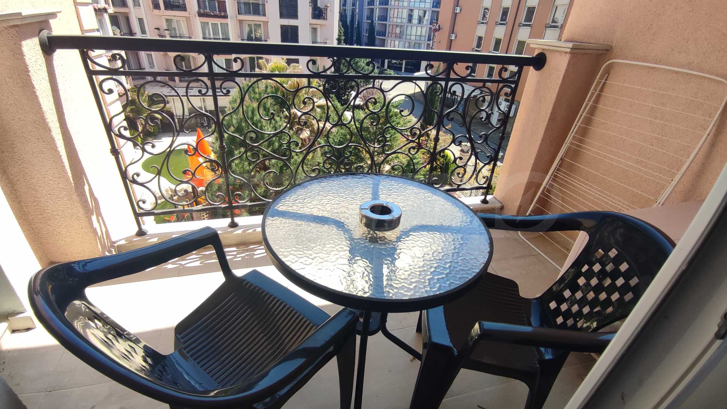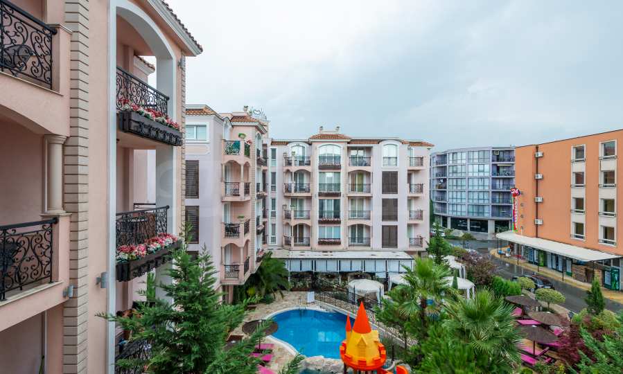 Имотът е разположен на 4-ти етаж, предлага балкон с изглед към басейна.