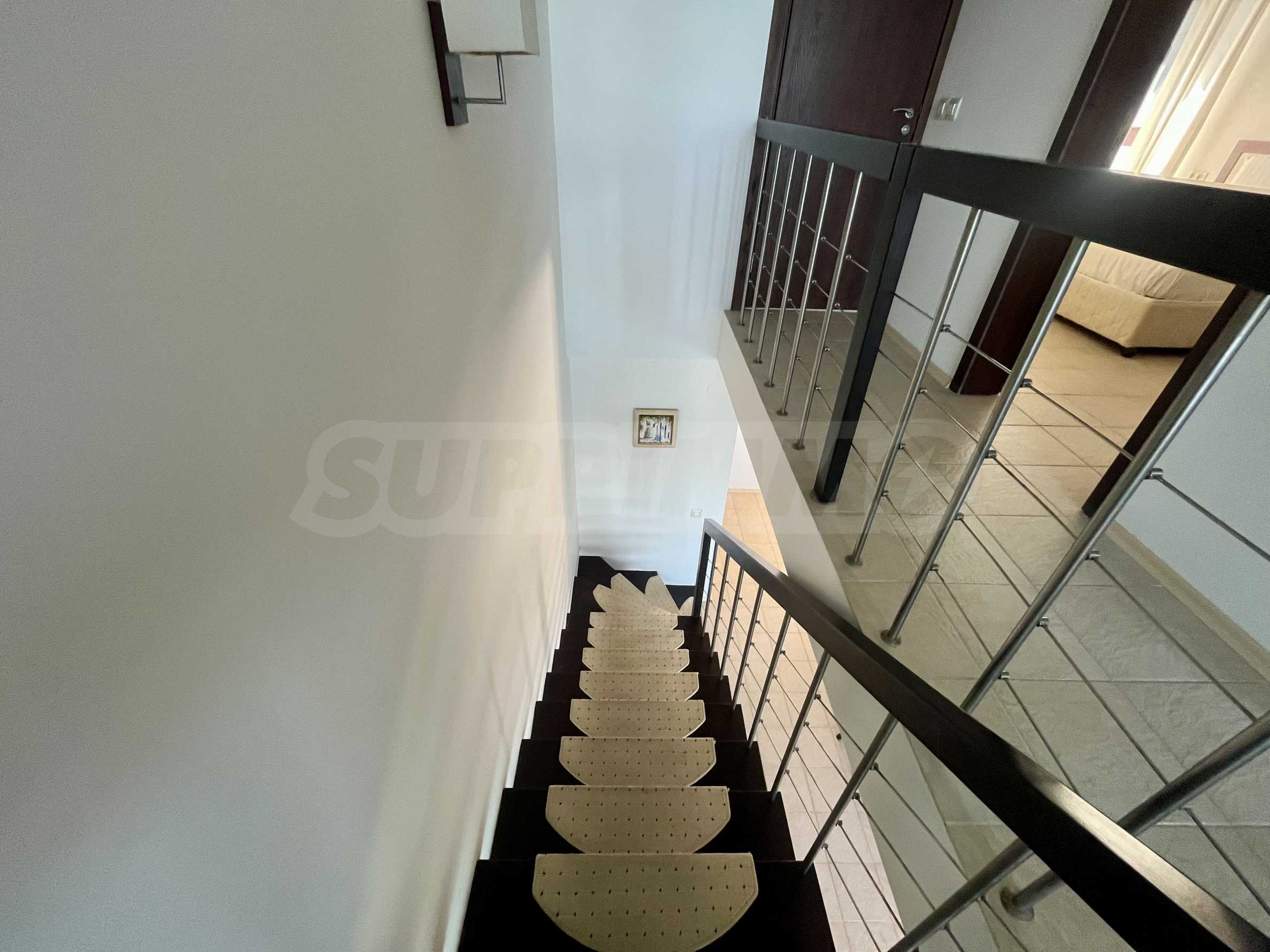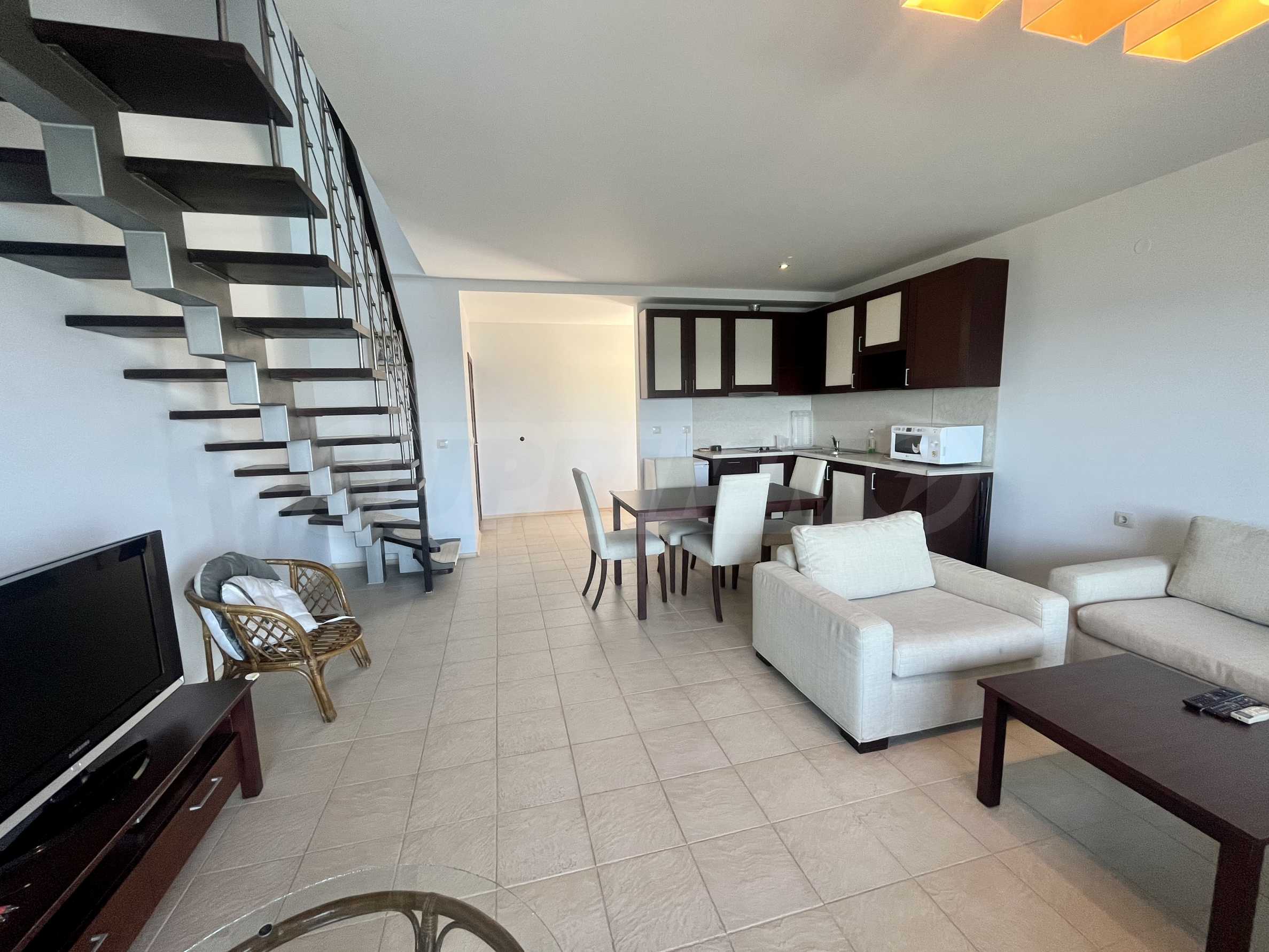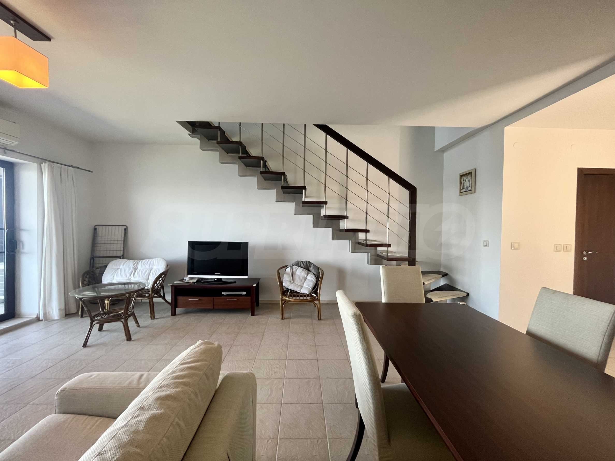 Апартаментът се намира на 1-ви и 2-ри етаж и се състои от всекидневна с кухненски бокс, две спални и две бани. Продава се с наличното обзавеждане и оборудване.