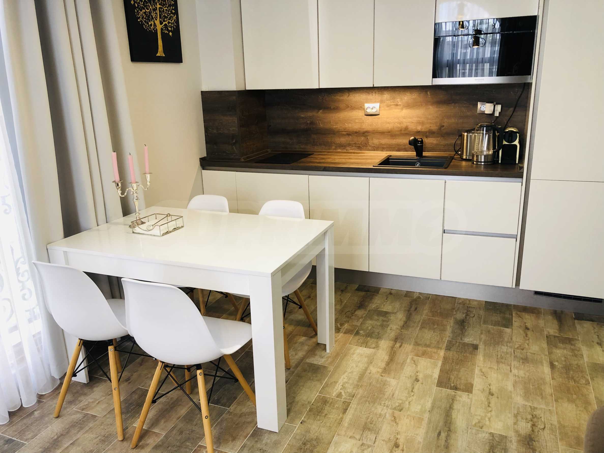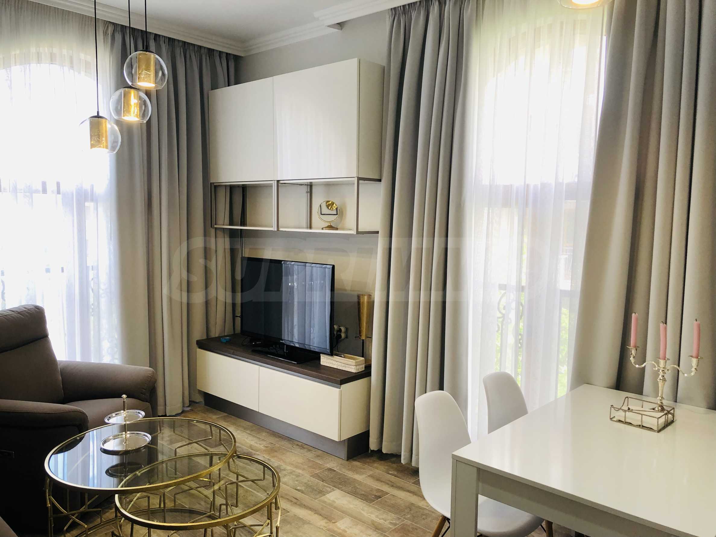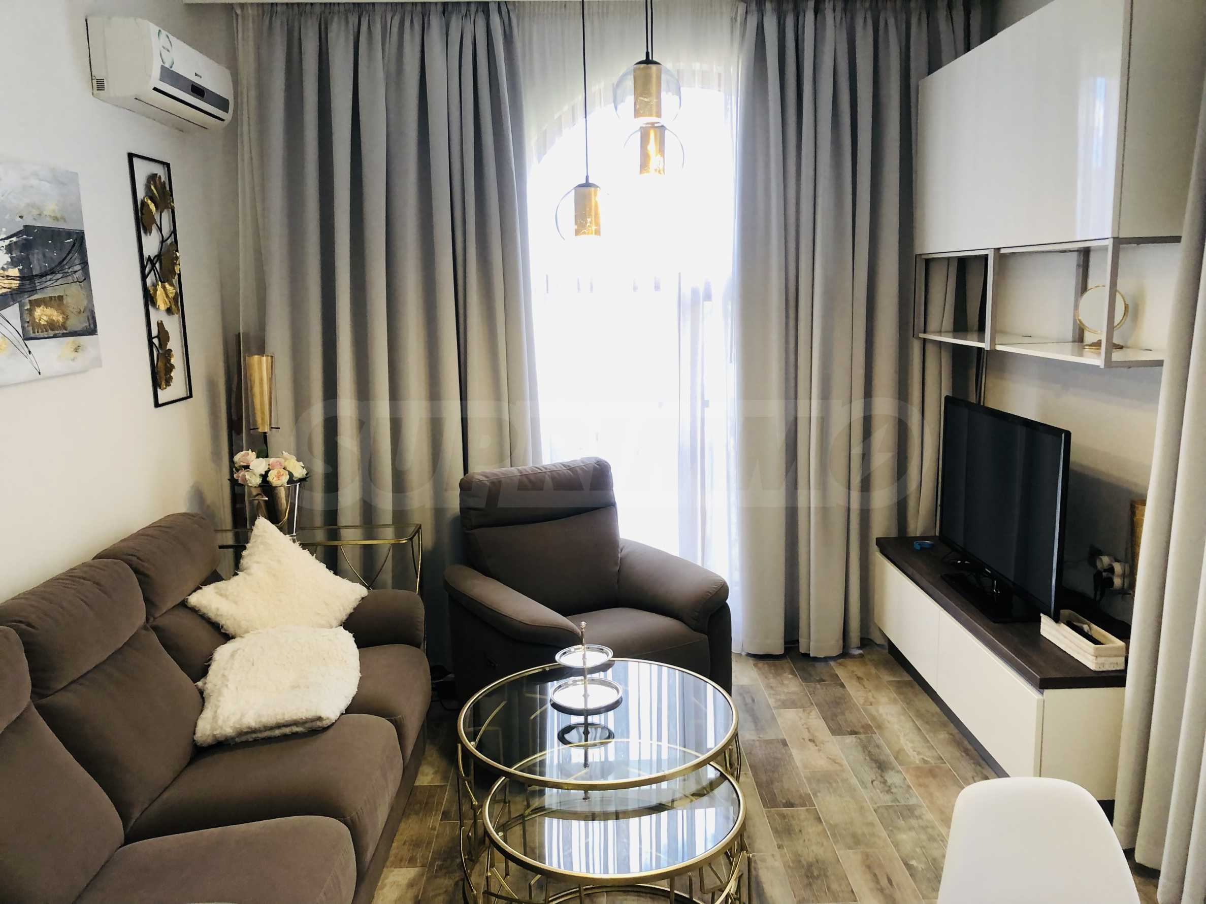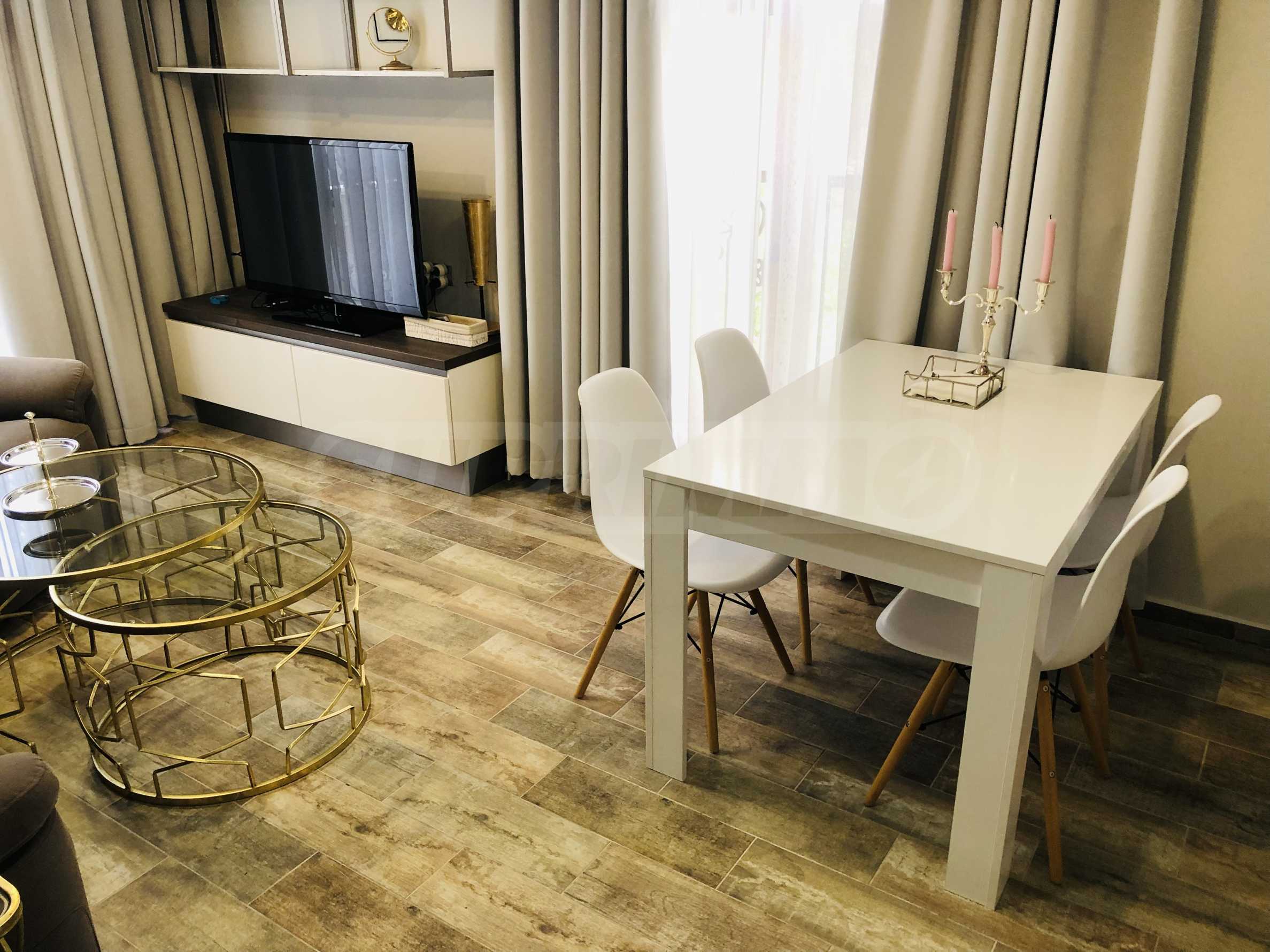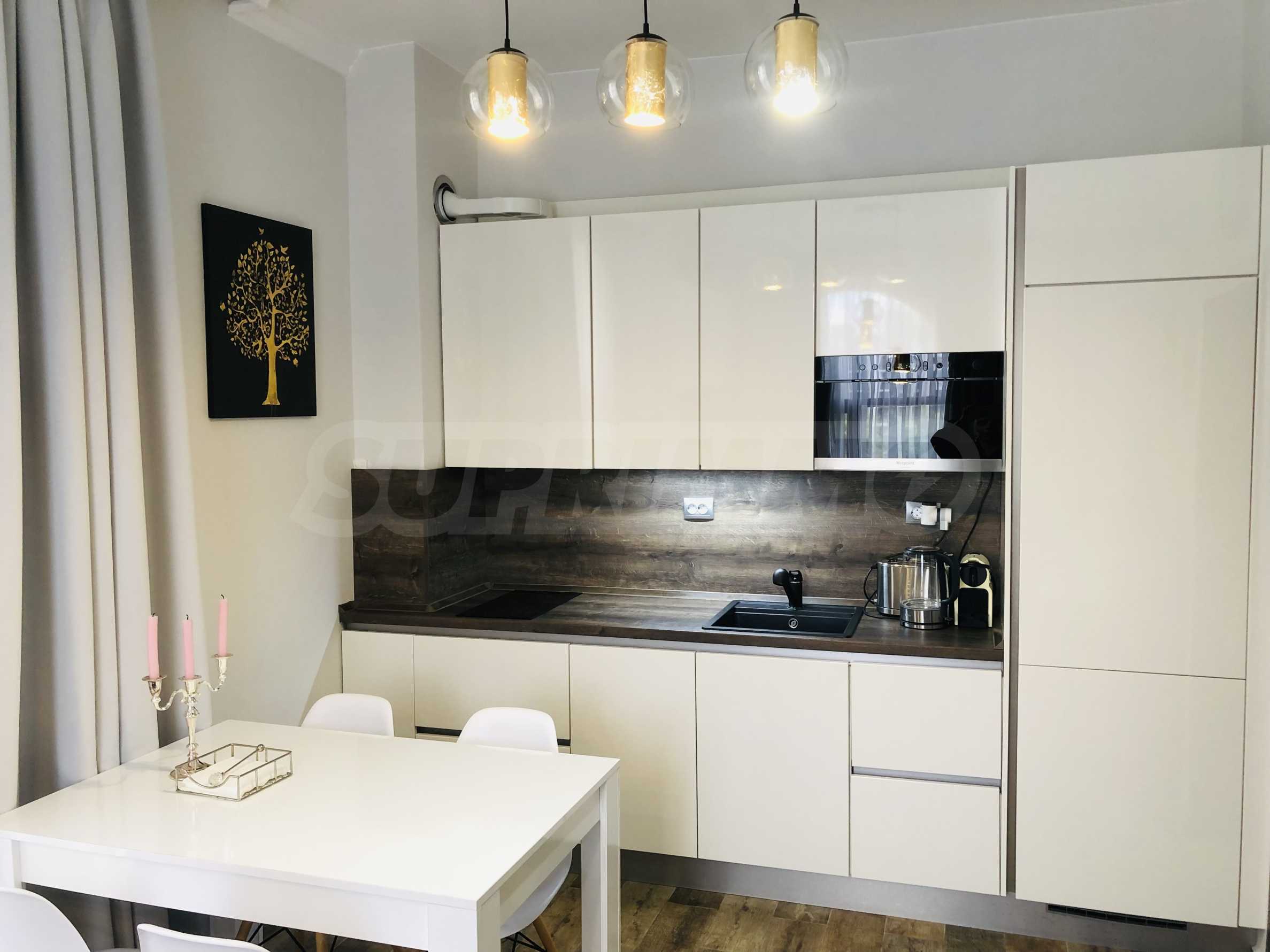 Апартаментът е 63 кв.м и се предлага напълно обзаведен с нови немски мебели, немски домакински уреди: хладилник, многофункционална микровълнова, съдомиялна. Осветлението и декора са от австрийска фирма, на прозорците има и тъмни завеси за пълен комфорт. Жилището е оборудвано с климатици и пералня, готово за нанасяне или за отдаване под наем.