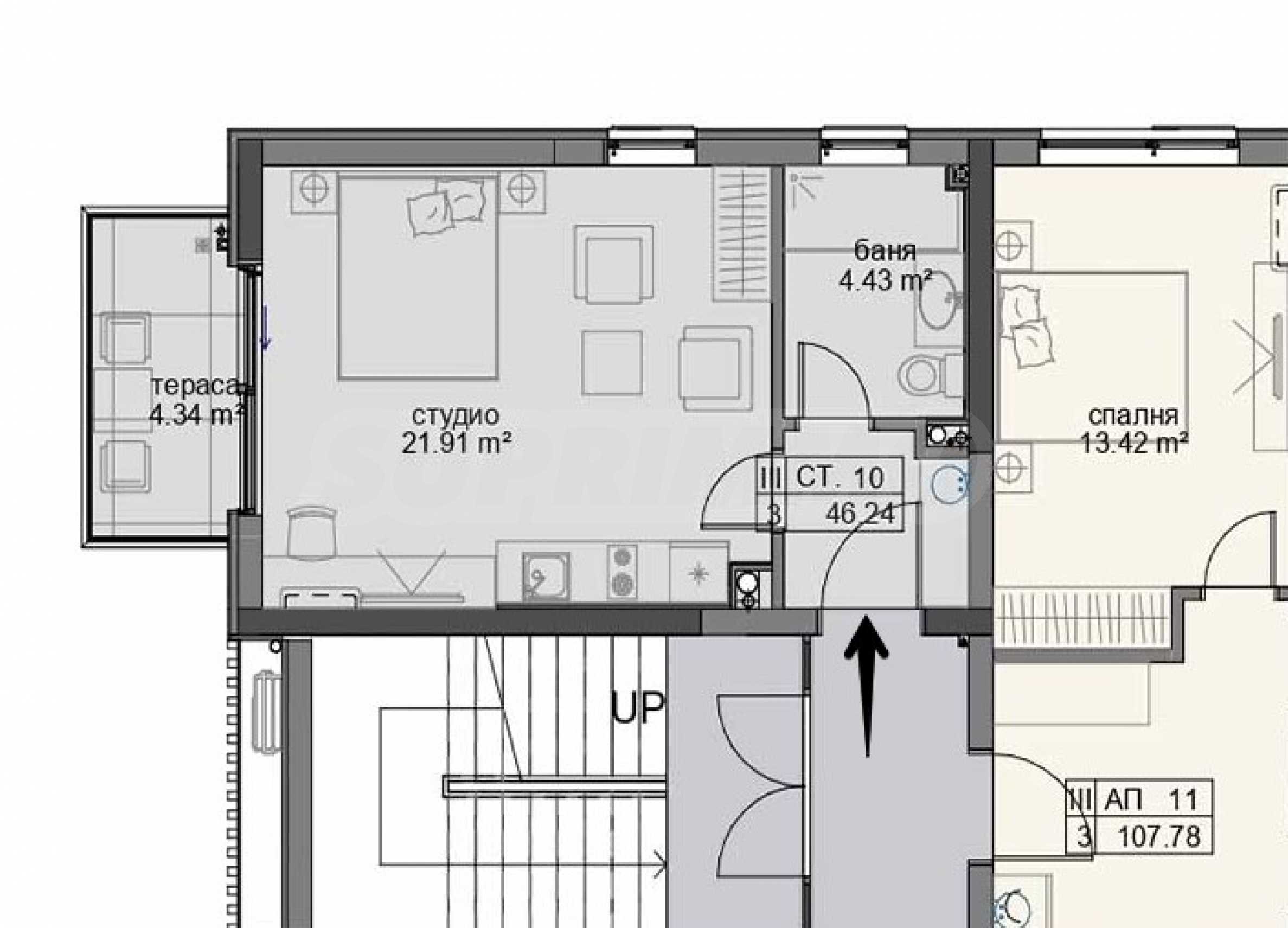 Апартаментът се намира на 4-ти етаж и има тераса от 4.34 кв.м.