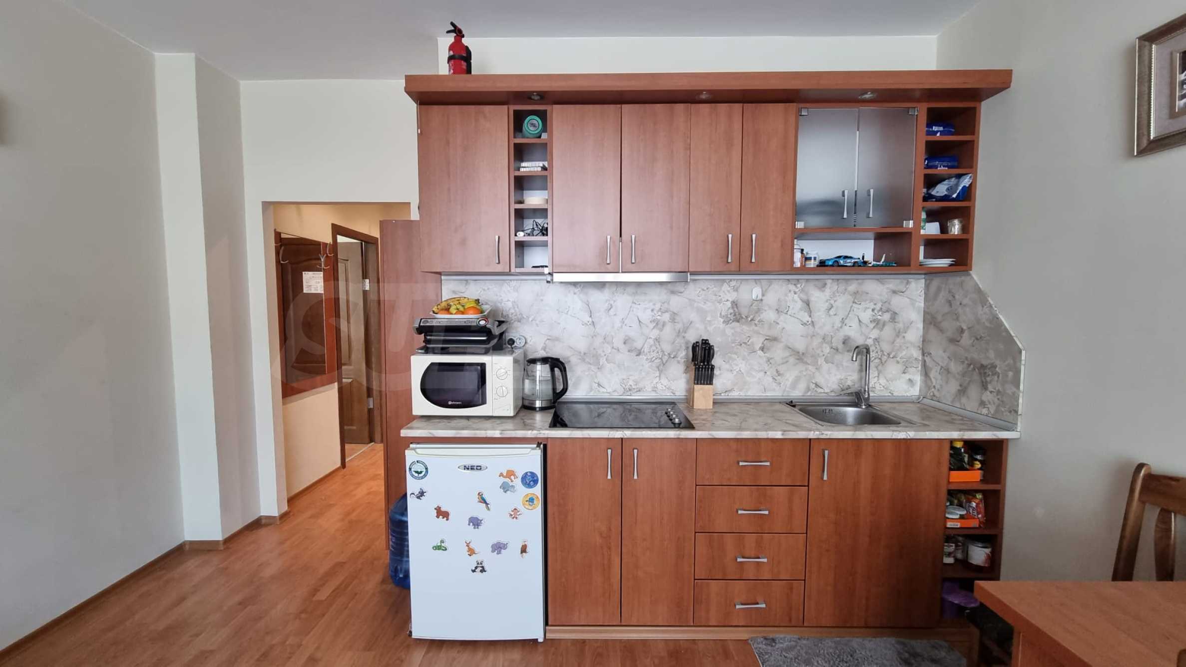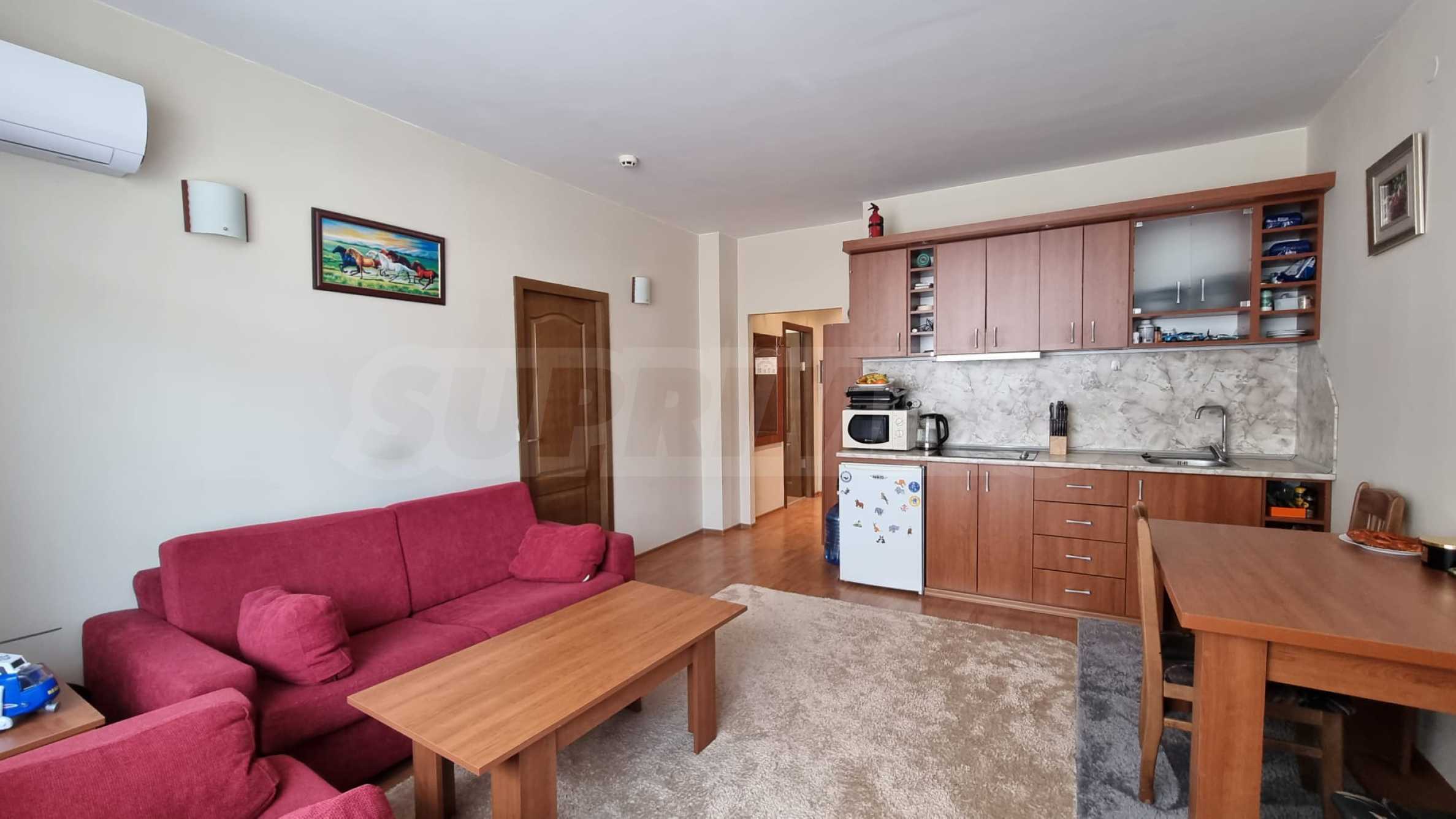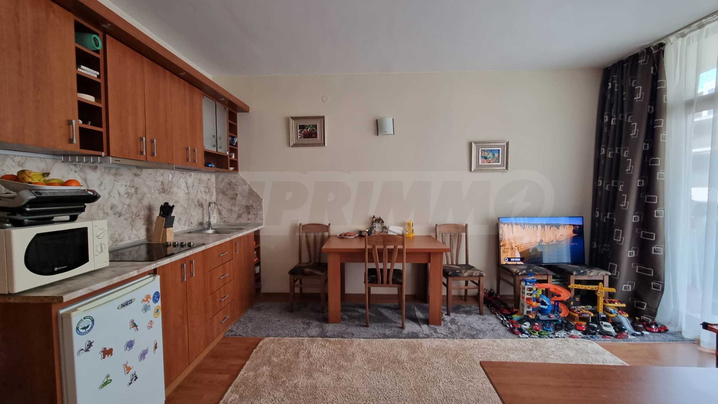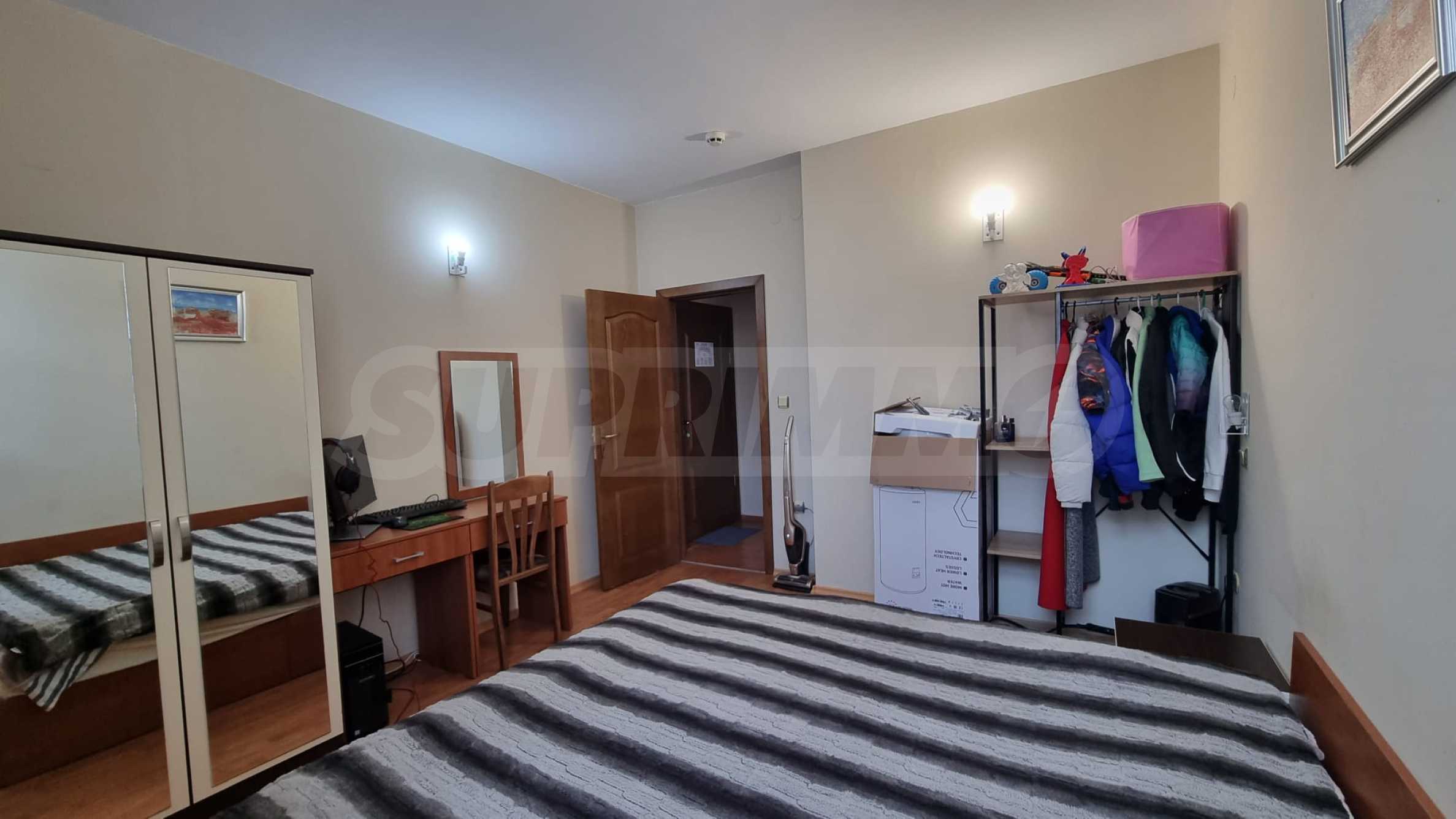 Жилището е напълно обзаведено и готово за нанасяне. Намира се в район е с много развита инфраструктура с магазини, заведения, аптеки, целогодишен супермаркет, спирка на градския транспорт и други.
