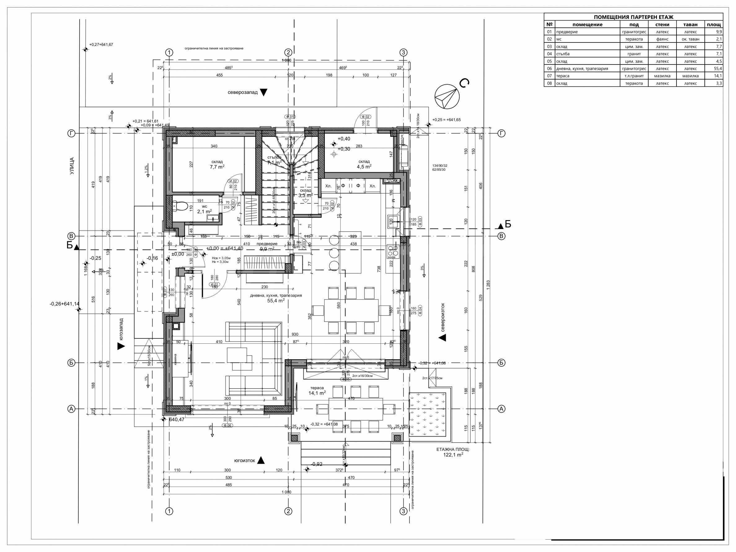 - Партерен етаж със светла височина 3.05 м - преддверие със стълбище, тоалетна, три складови помещения (едното с вход отвън), просторно отворено помещение с обособени зони за кухня, трапезария и дневна, излаз към покрита тераса и вътрешния двор;