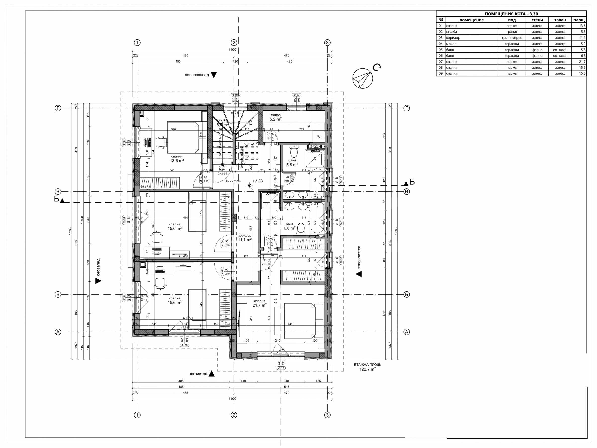 - Втори етаж със светла височина 2.77 м - 2 детски спални, родителска спалня с дрешник и собствена баня, спалня за гости, една обща баня с достъп от коридора и мокро помещение;