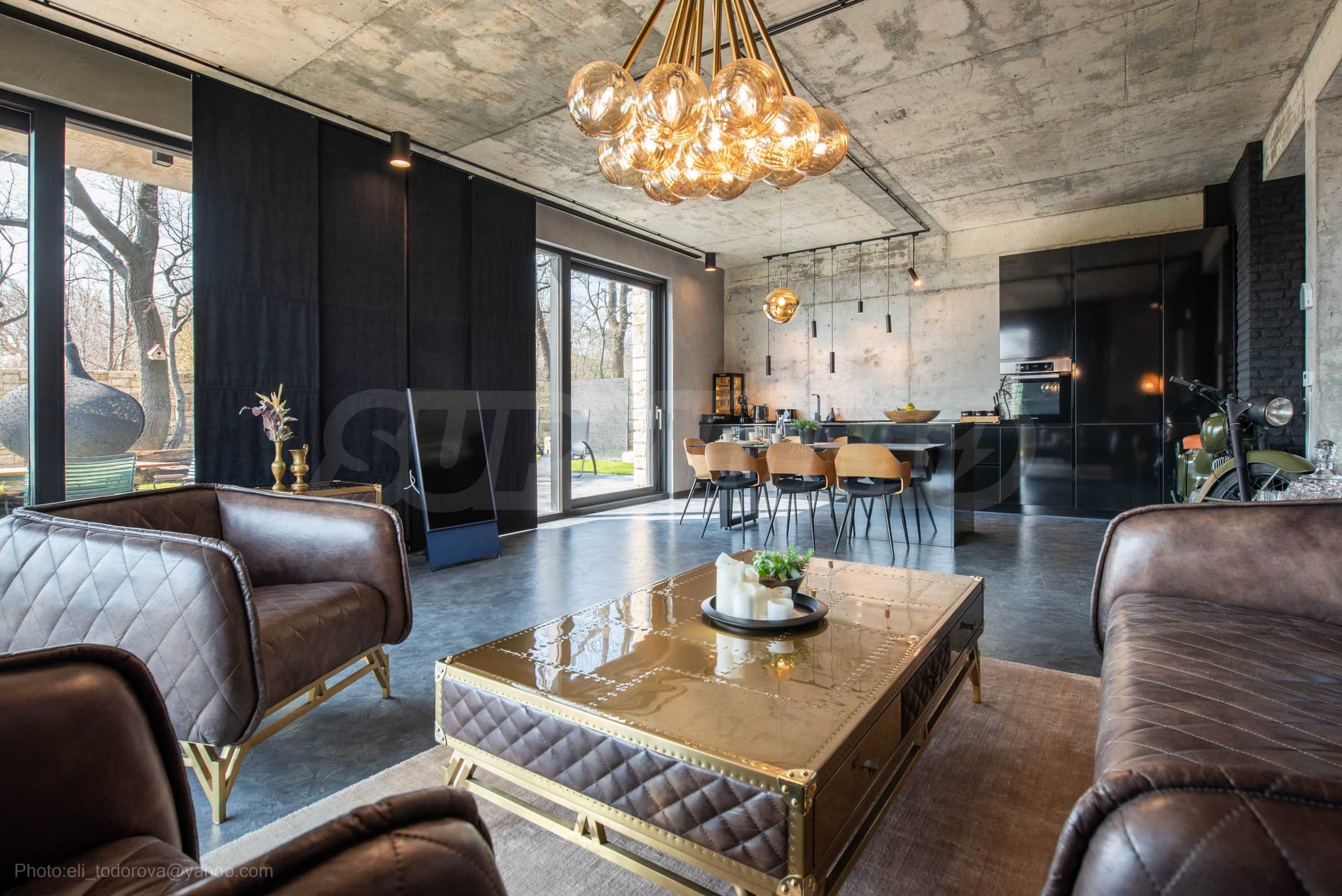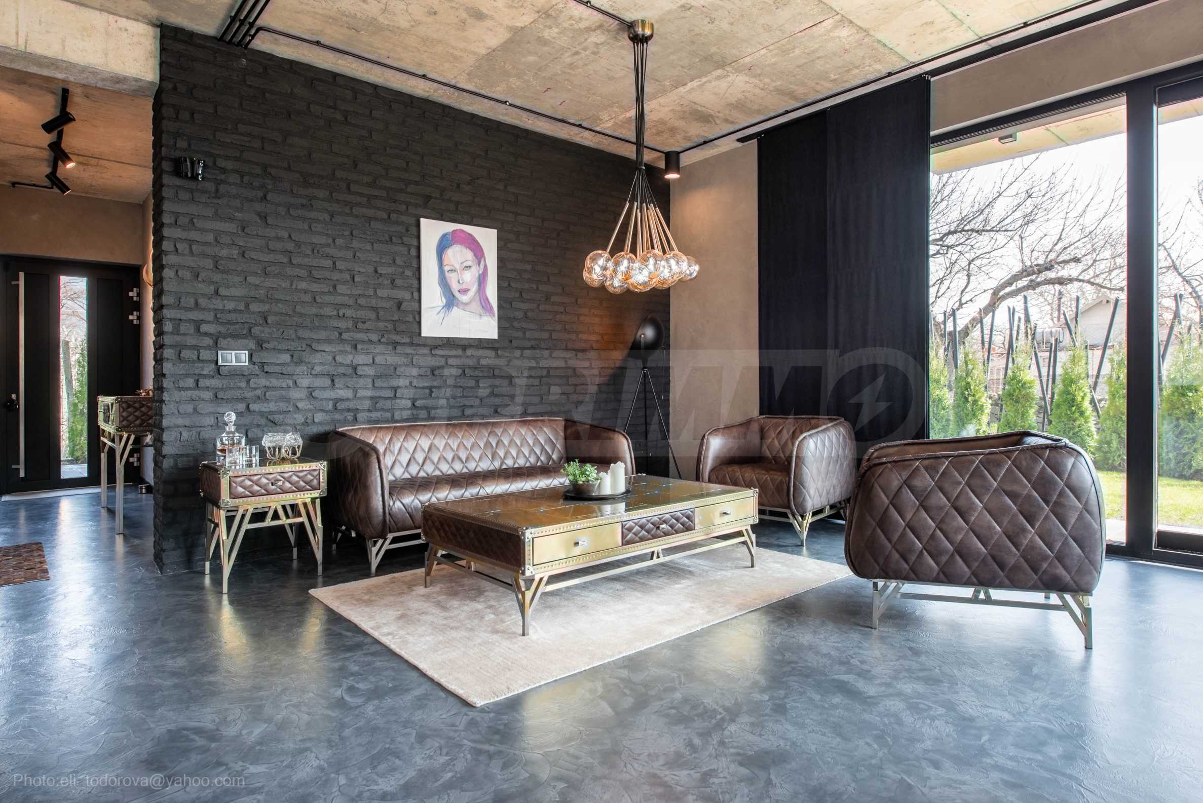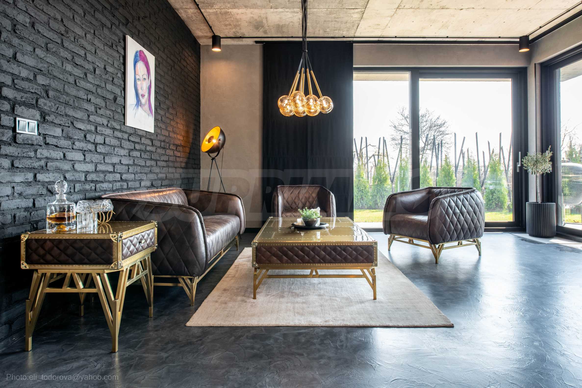 Имотът разполага с голям хол с мека мебел и гледка към басейна.