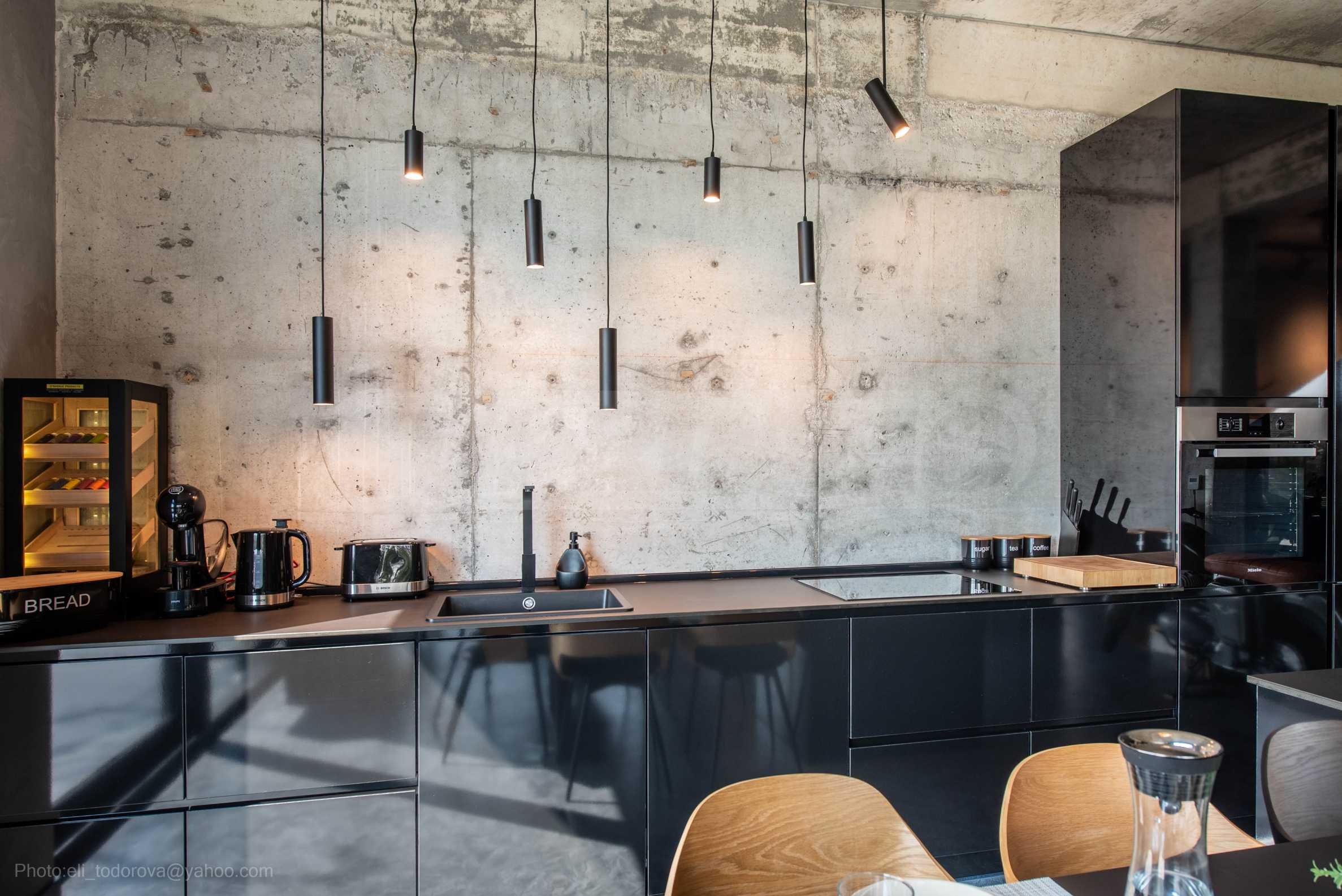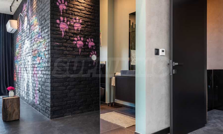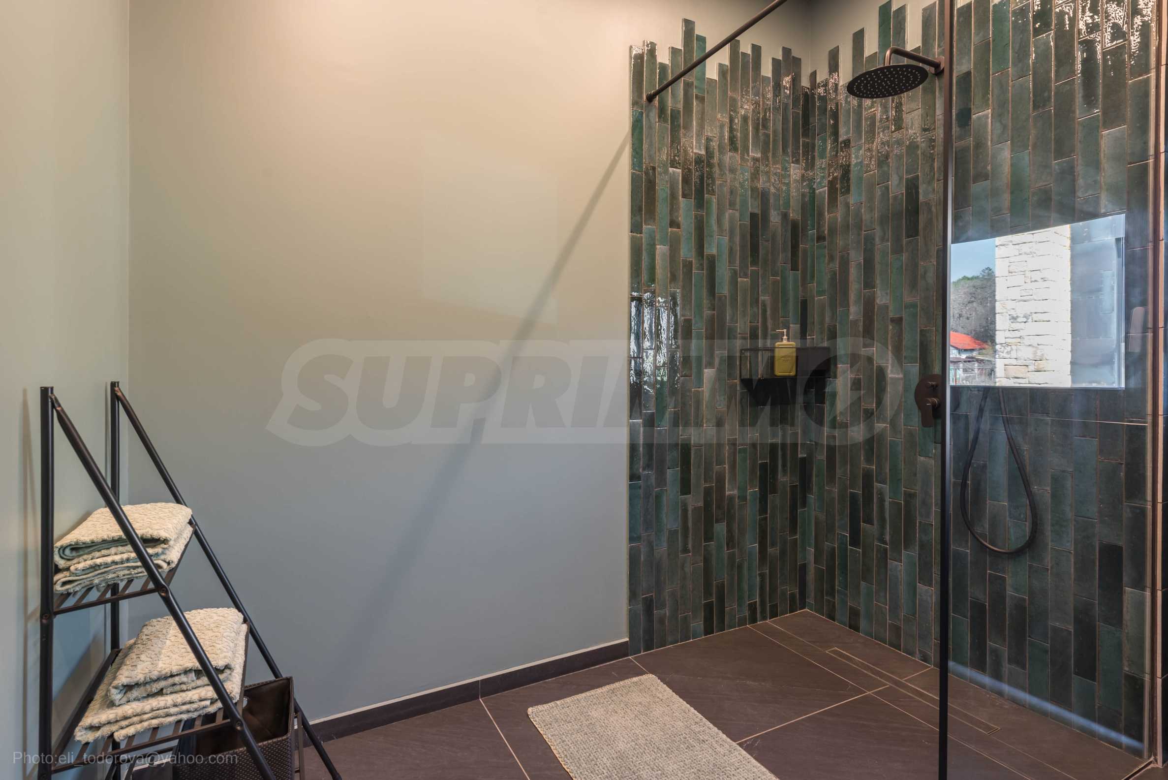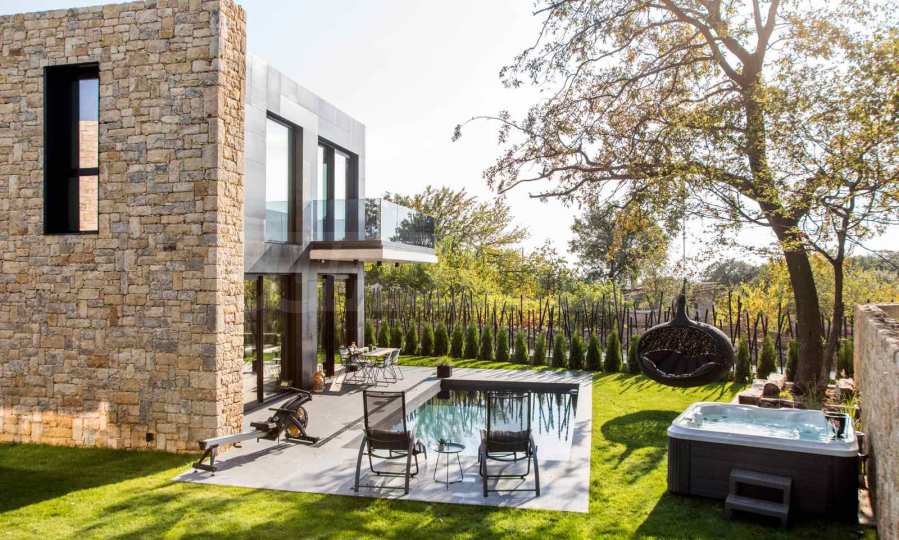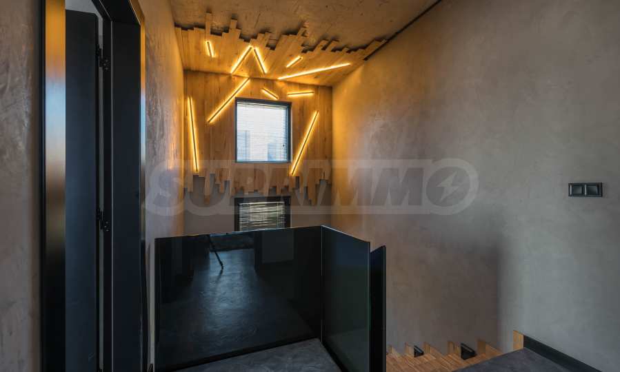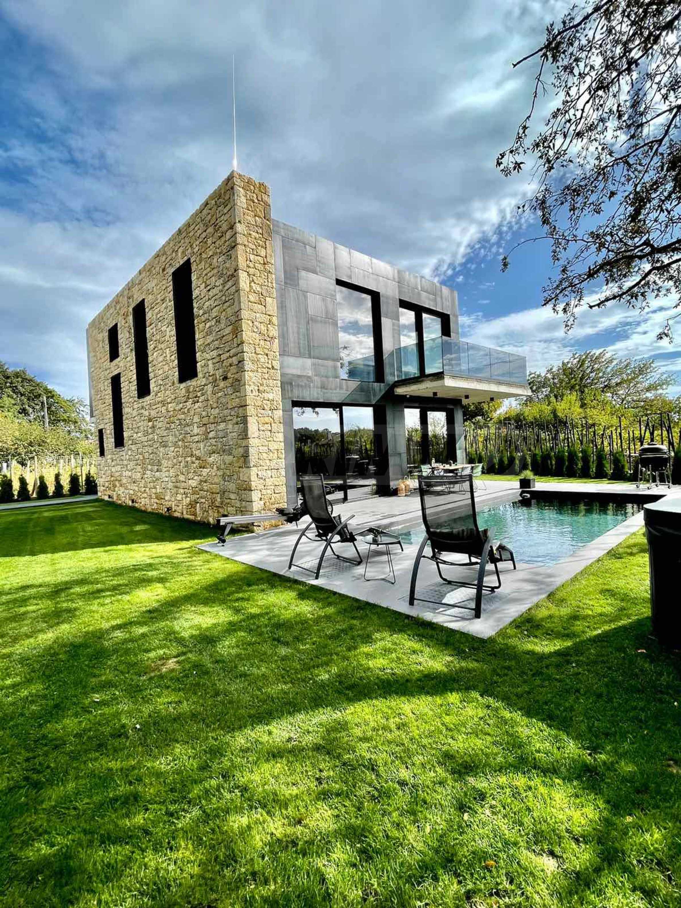 Фасадата е модерна, от метални елементи и суха каменна зидария.