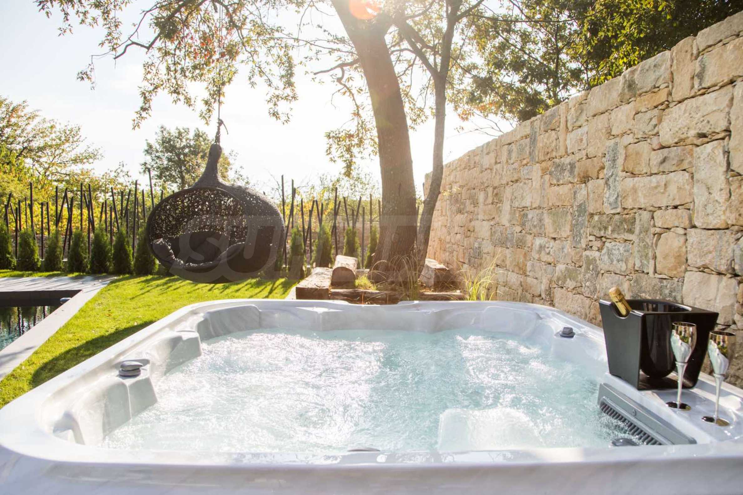 Насладете се на джакузи и прохладен басейн в прекрасно озеленен двор, романтично място със стар дъб с люлка от лава на него.