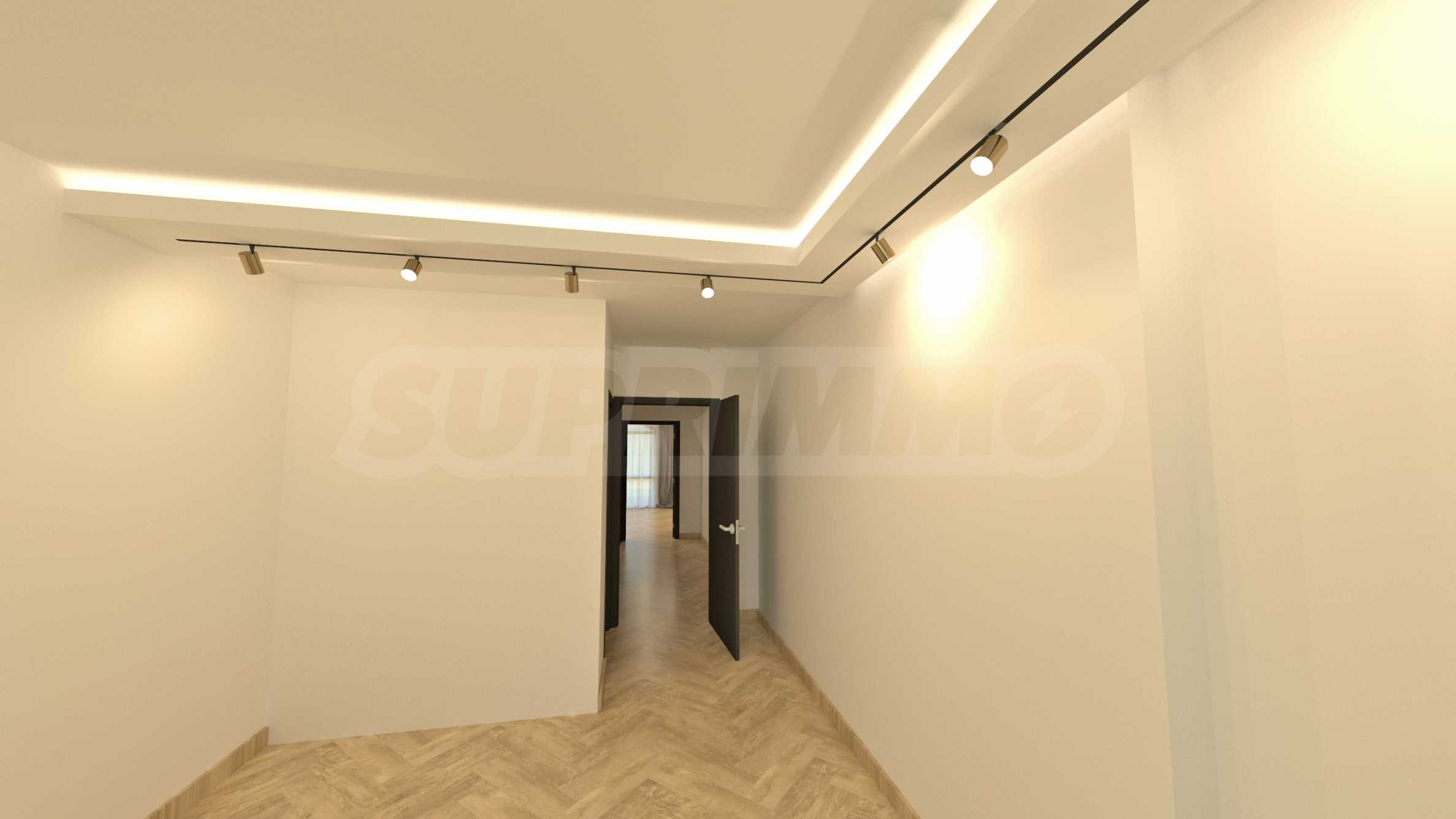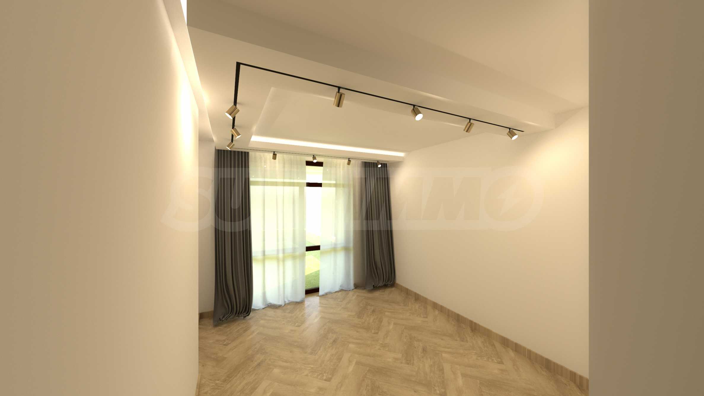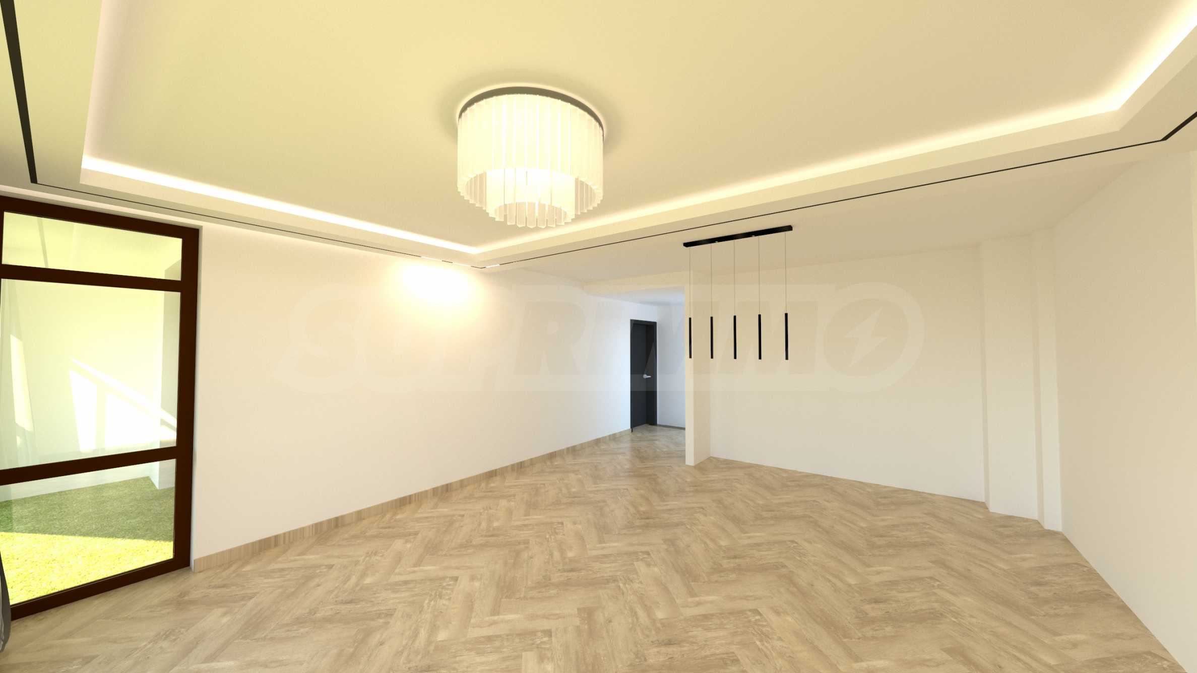 Апартаментът е разположен на ниво партер от общо 5, предлага 98.36 кв.м обща площ и се състои от антре, всекидневна с излаз към двор с площ 166.30 кв.м, две спални, баня с тоалетна, тоалетна и мокро помещение.