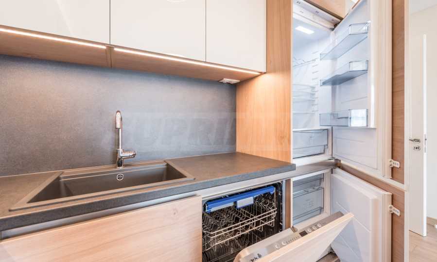 Апартаментът се намира на 5-и етаж и има обща площ 88 кв.м. Състои се от обширно антре, дневна с отлично оборудвана кухня, комфортна спалня, баня с душ-зона, тераса с градска гледка.