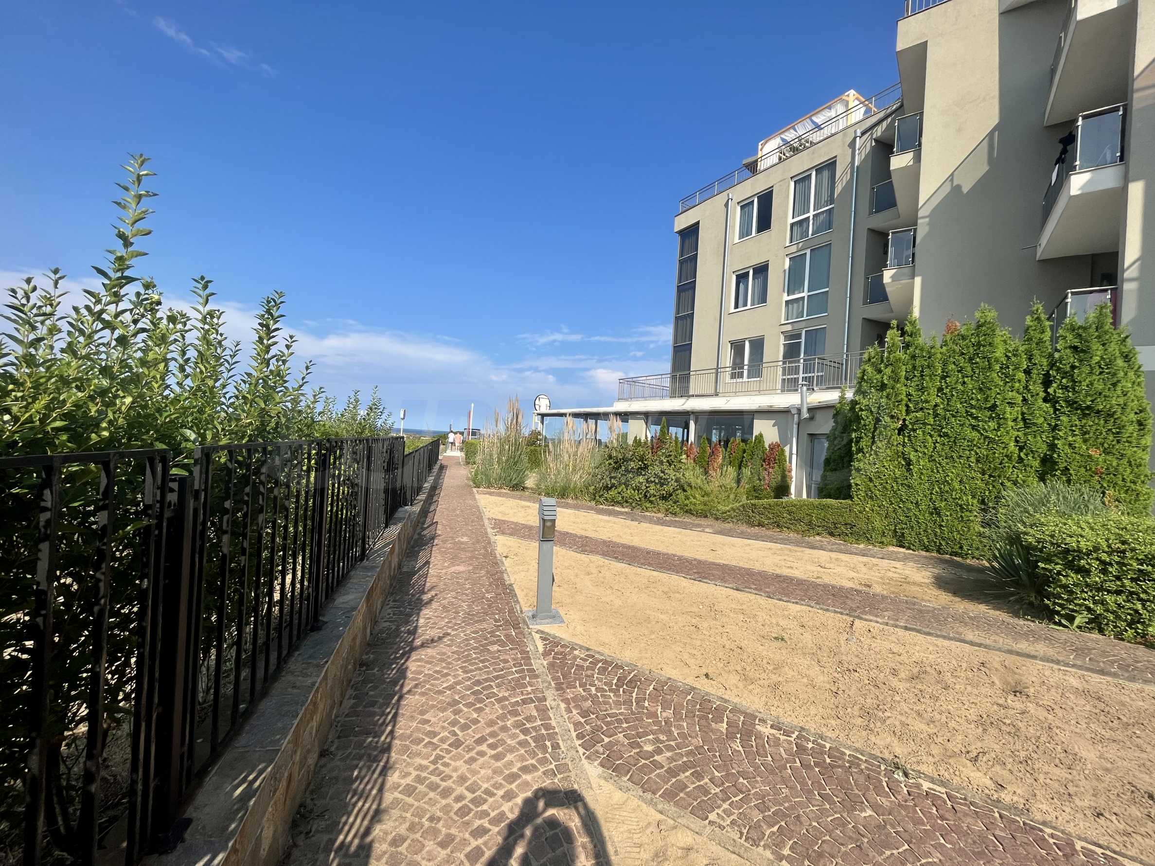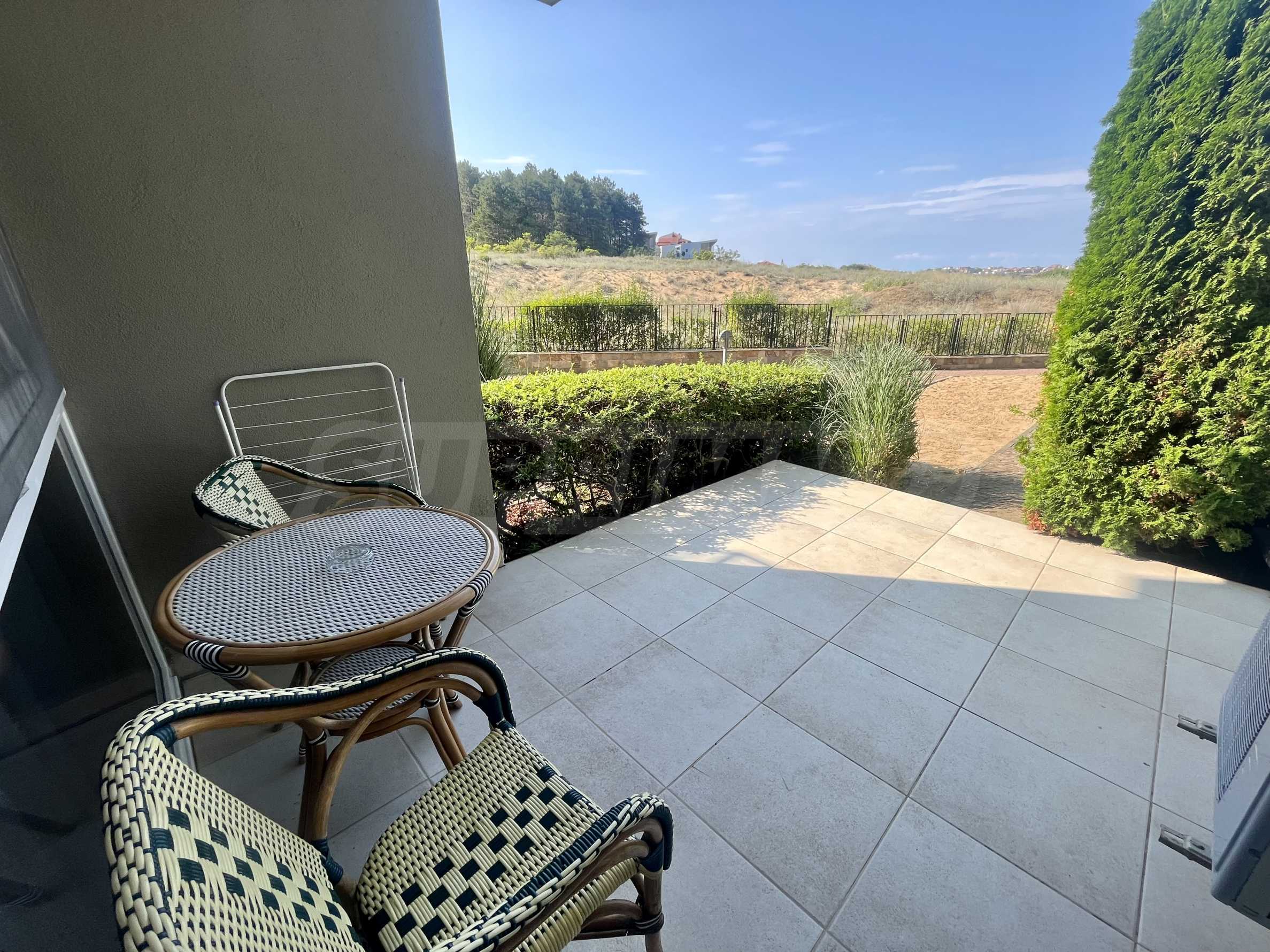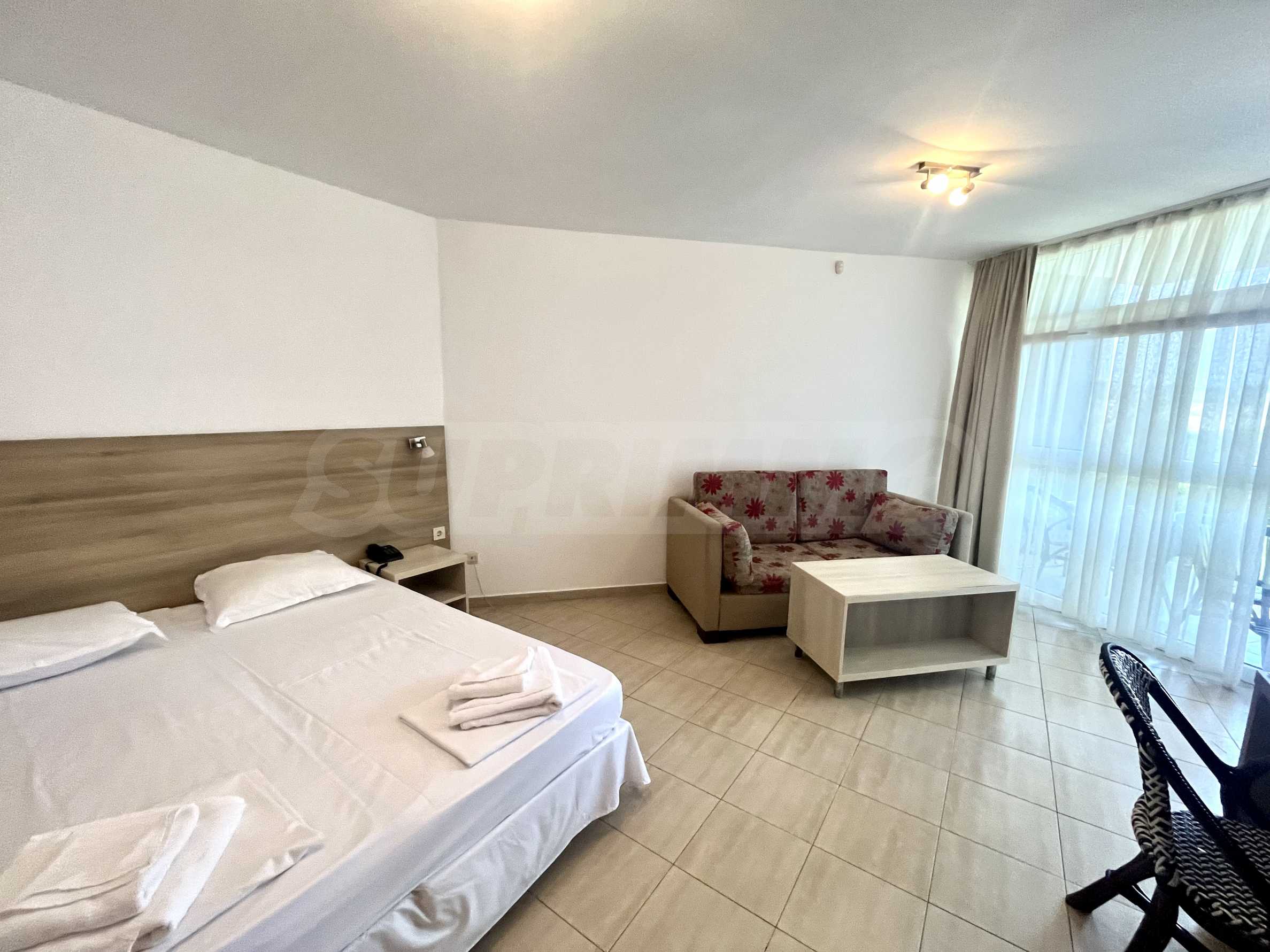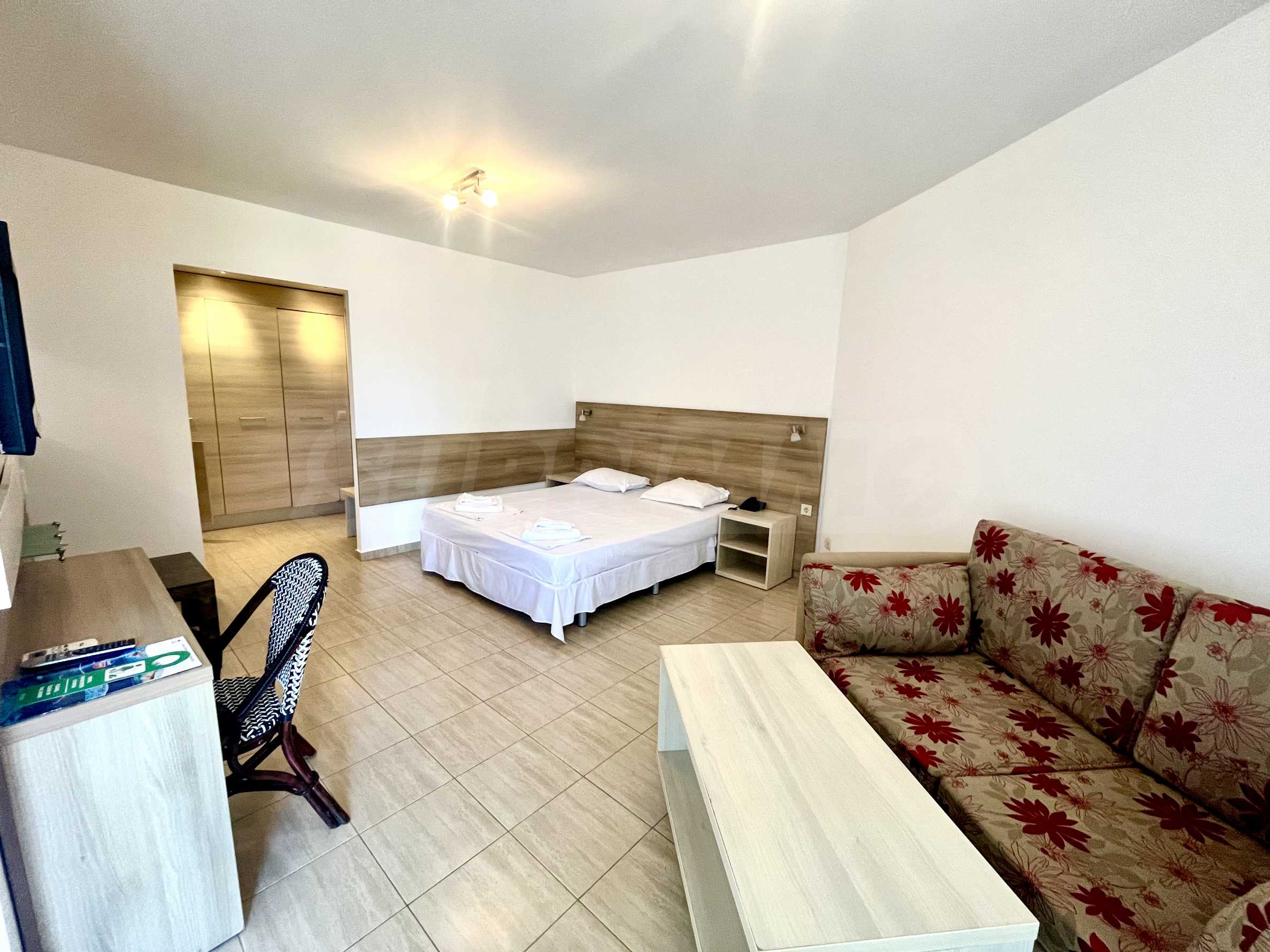 Имотът има обширна веранда с панорама море и гледка към зеленината на местността. Състои се от удобен коридор, оборудвана кухня, уютна светла стая с голямо двойно легло, баня с душ кабина и тоалет. Предлага се с мебели и техника, с пълно оборудване и всичко необходимо за живеенето или отдаването под наем.
