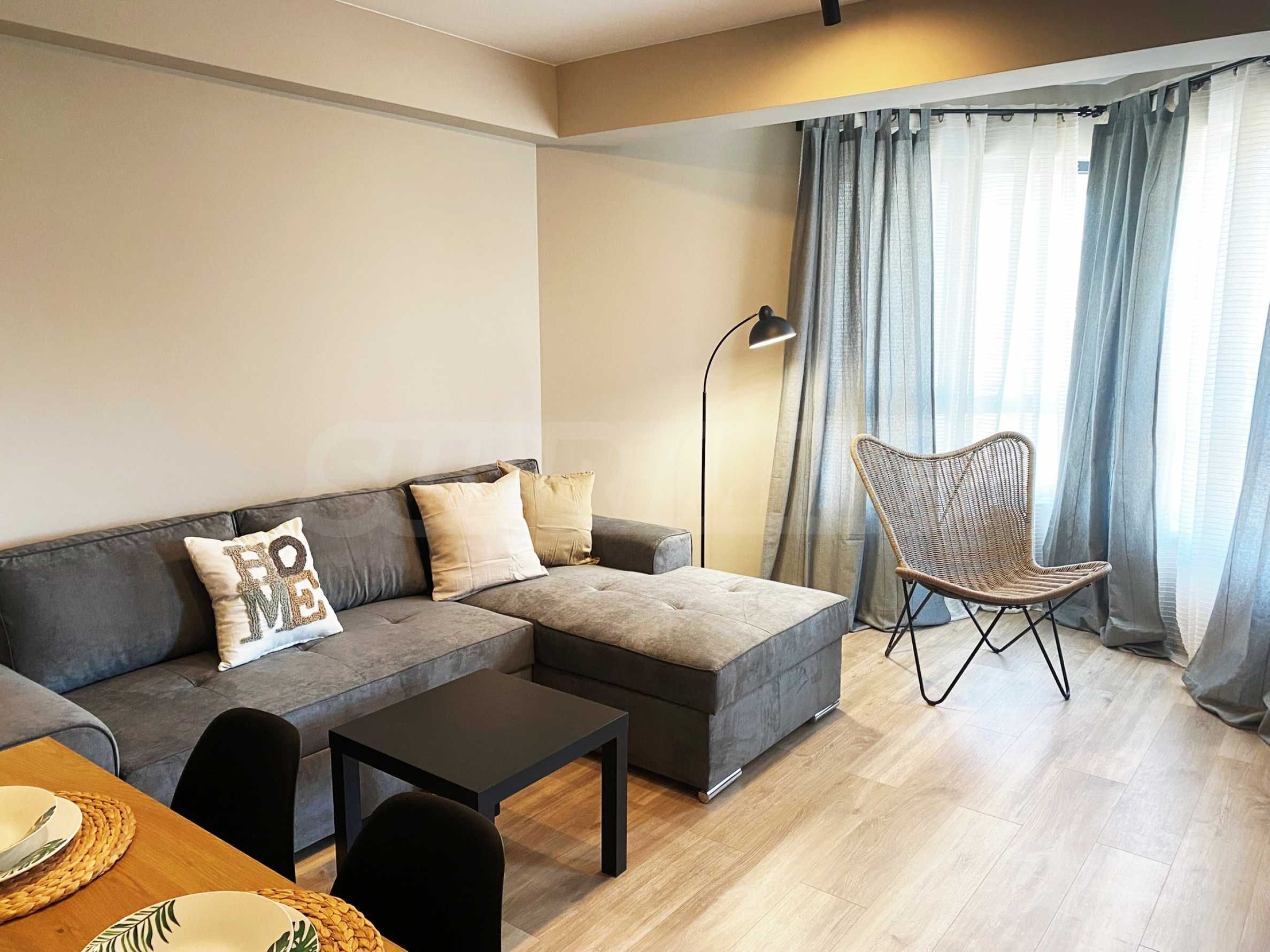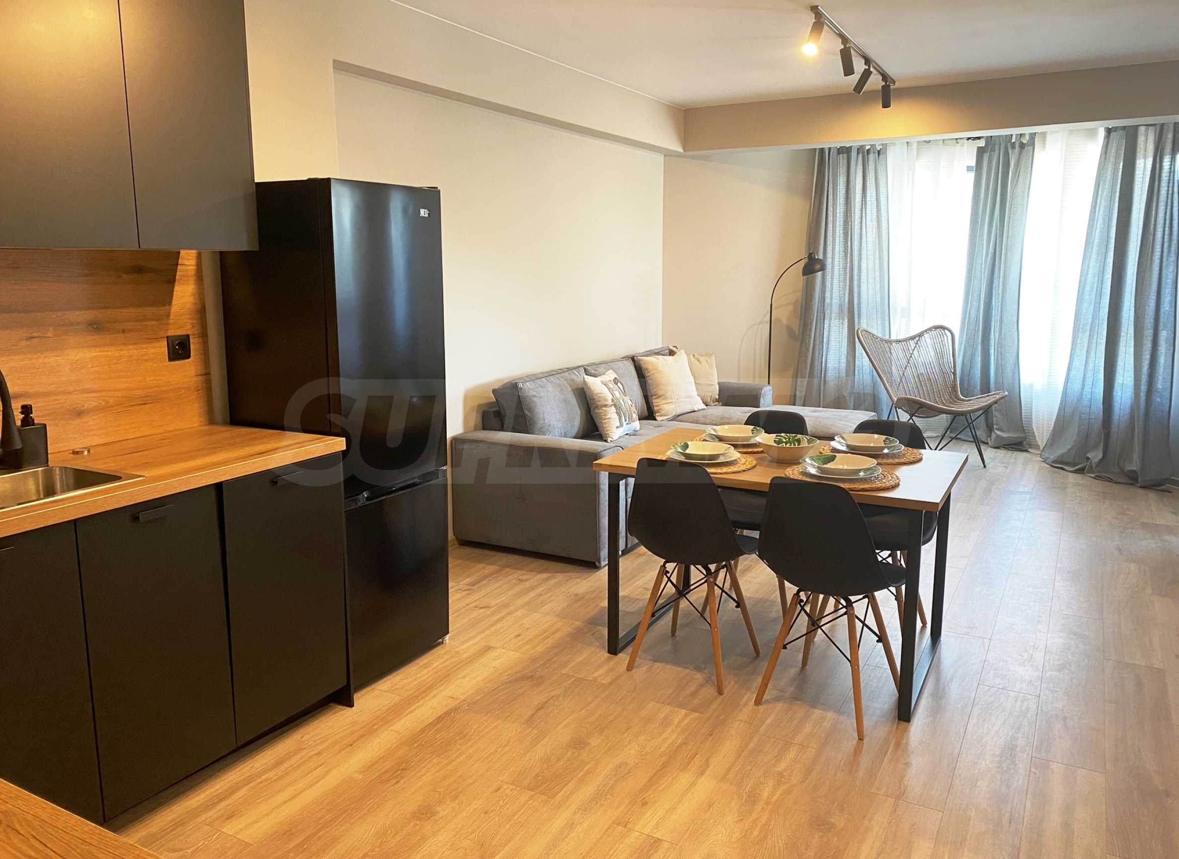 Жилището е уютно обзаведено и оборудвано с всички необходими мебели и ел. уреди - съдомиялна, пералня, бойлер, аспиратор, телевизор, печка. Отоплението и охлаждането са решени с инверторни климатици във всяка стая.