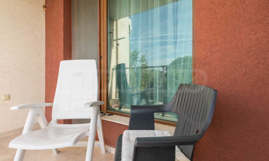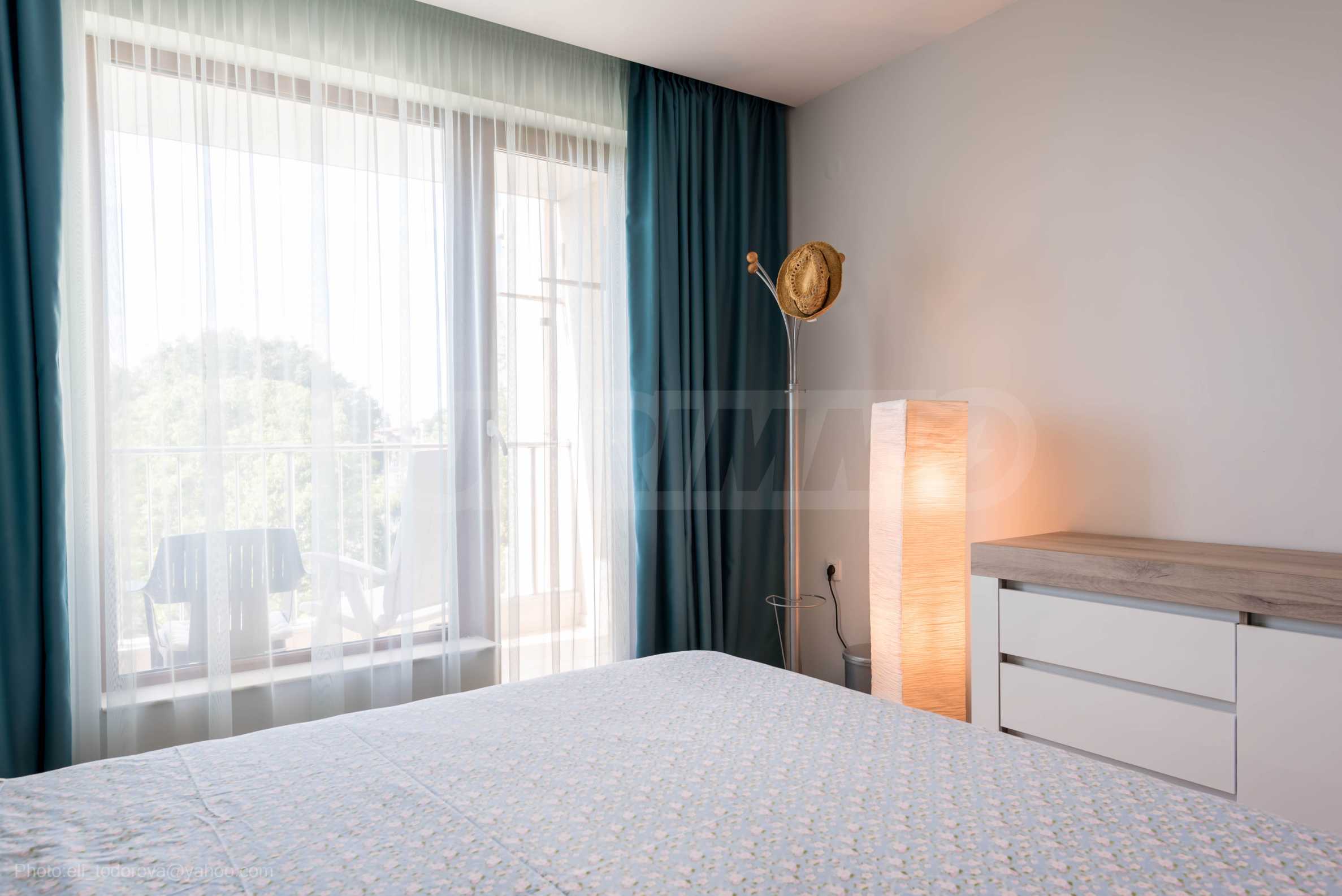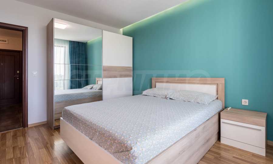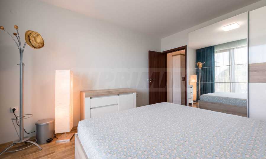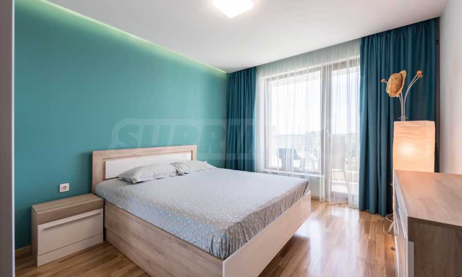 Апартаментът е нов, предлага гледка море от всекидневната и спалнята.
