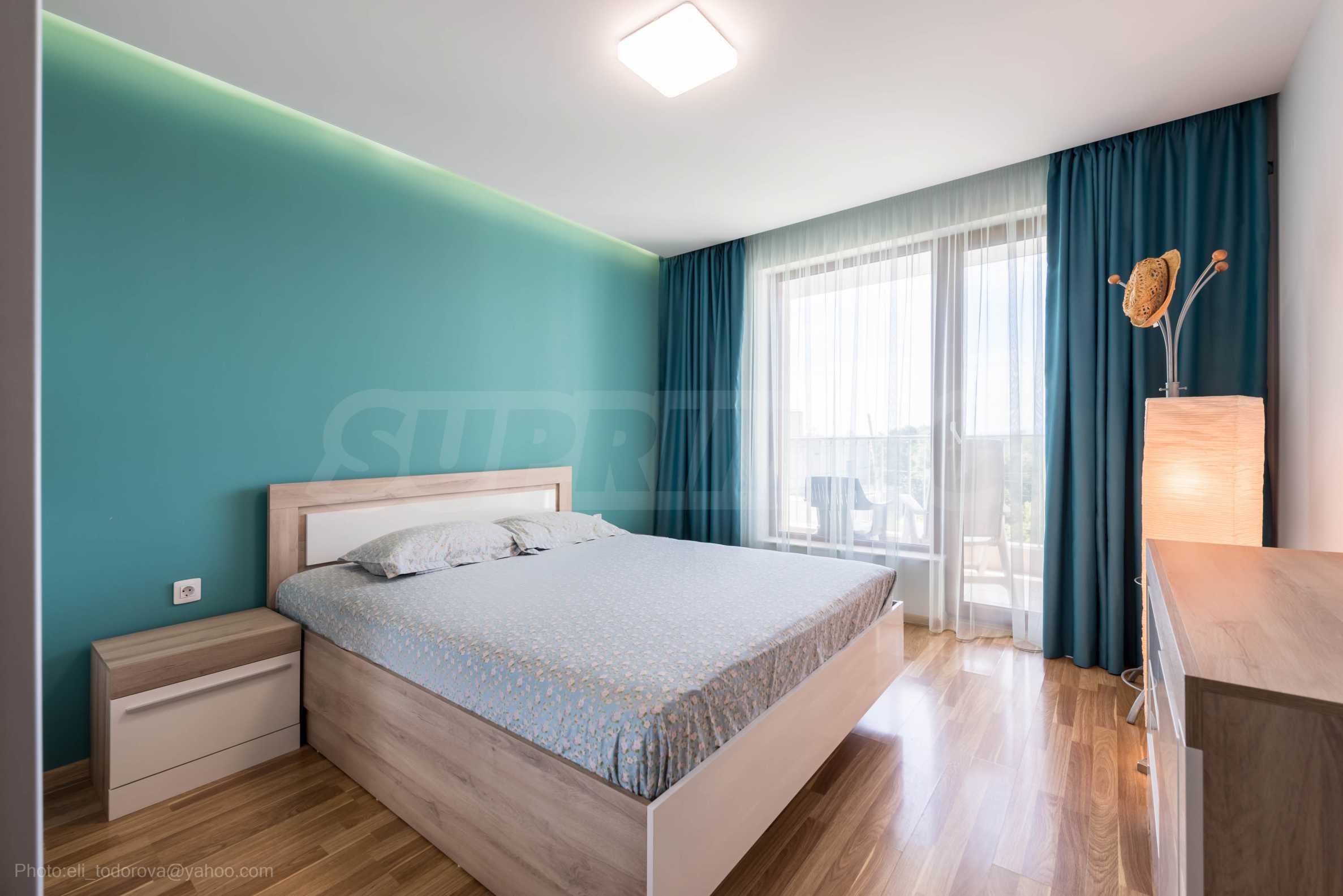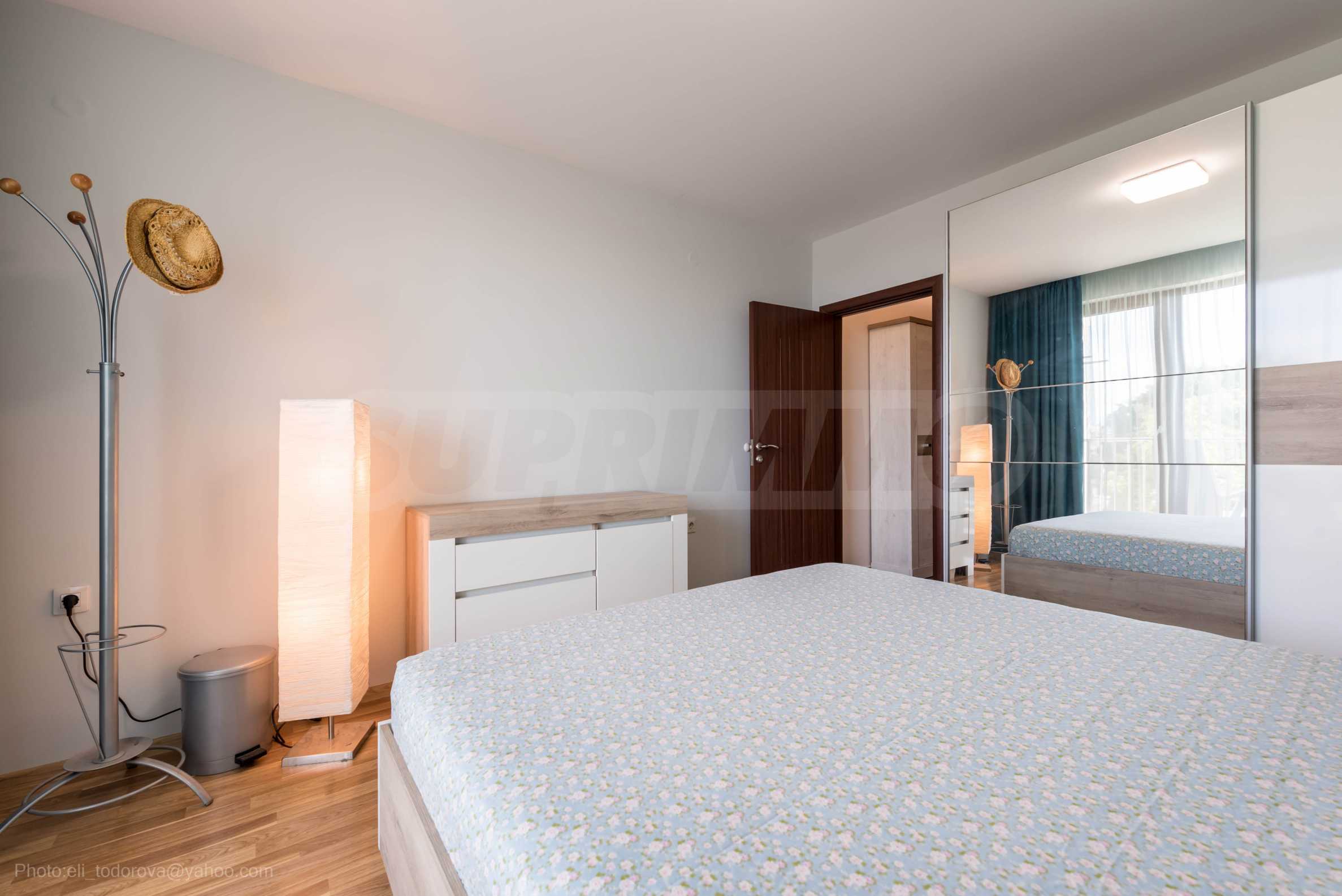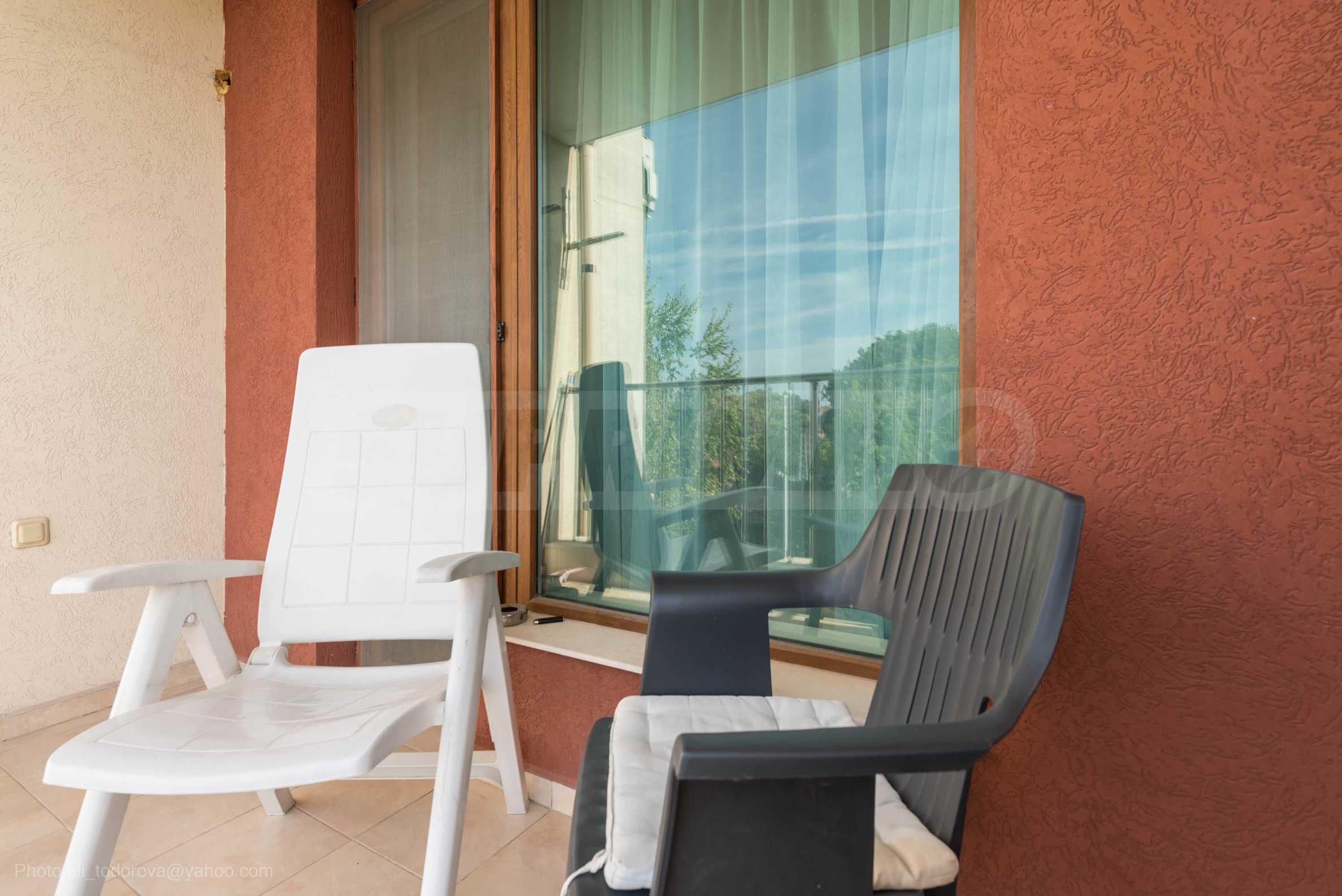 Апартаментът е нов, предлага гледка море от всекидневната и спалнята.