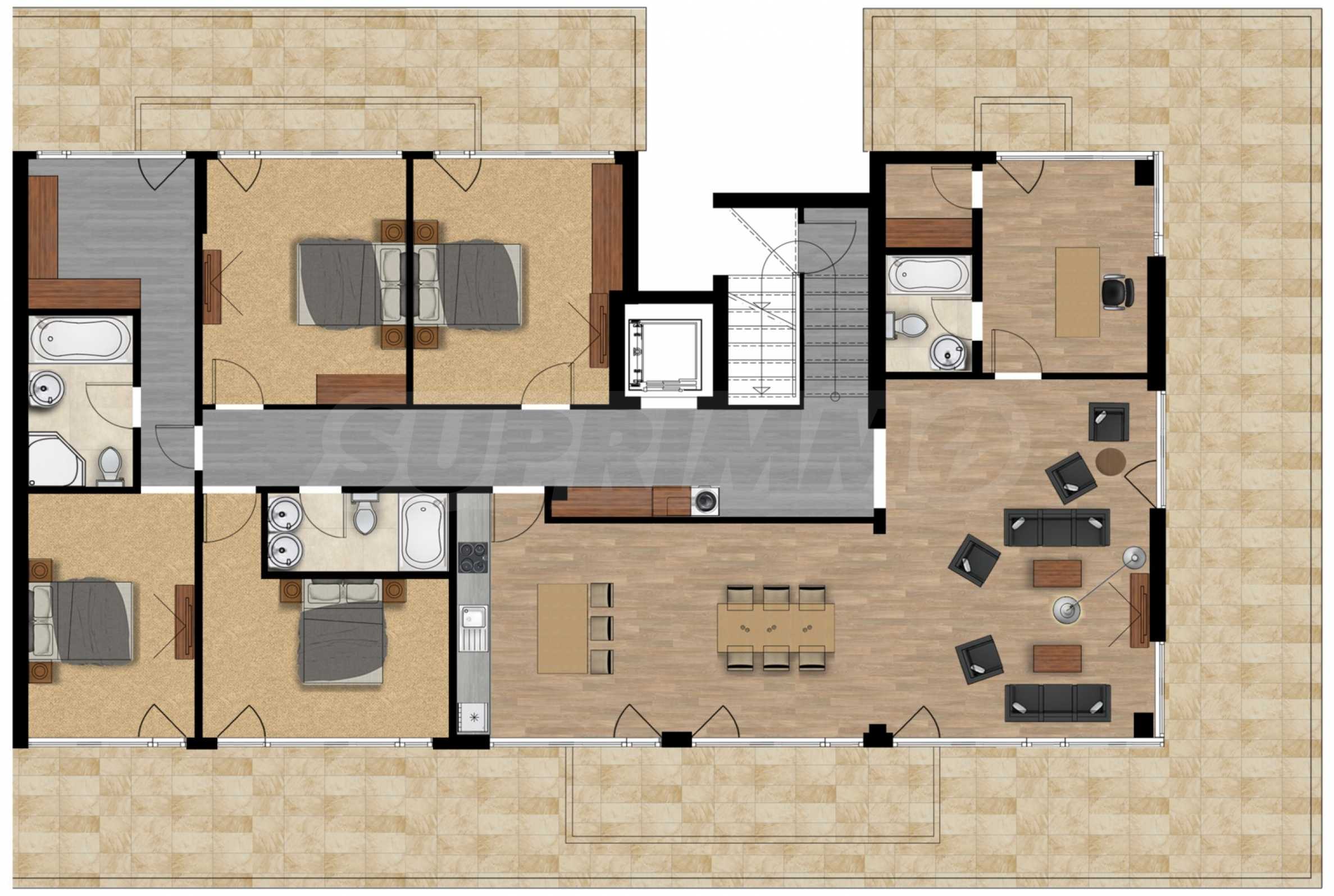 - Четири спални спални, включително и основна спалня с просторна баня и гардеробна към нея, за максимален комфорт;