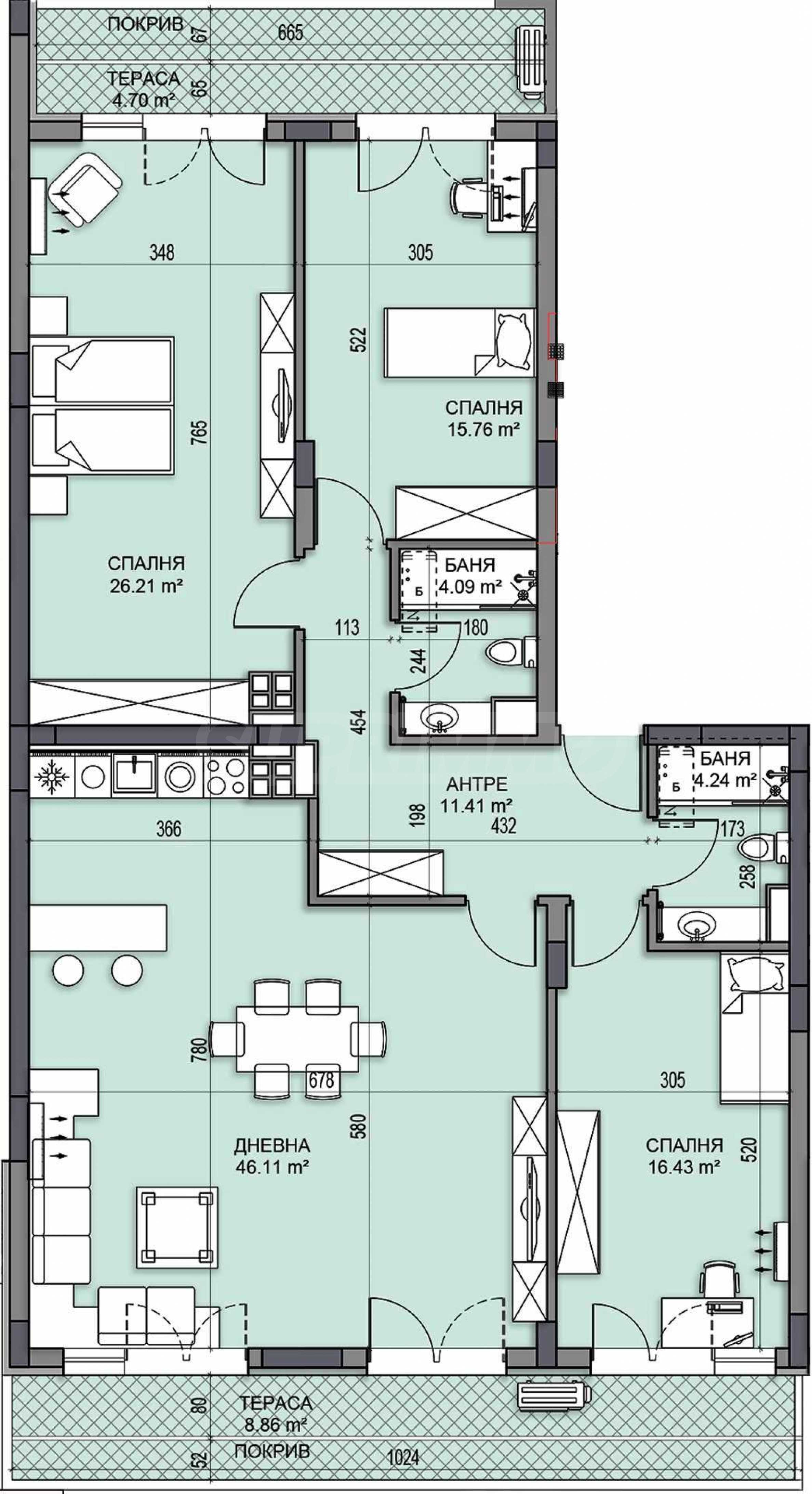 • дневна с кухненски кът и трапезария - 46.11 кв.м;