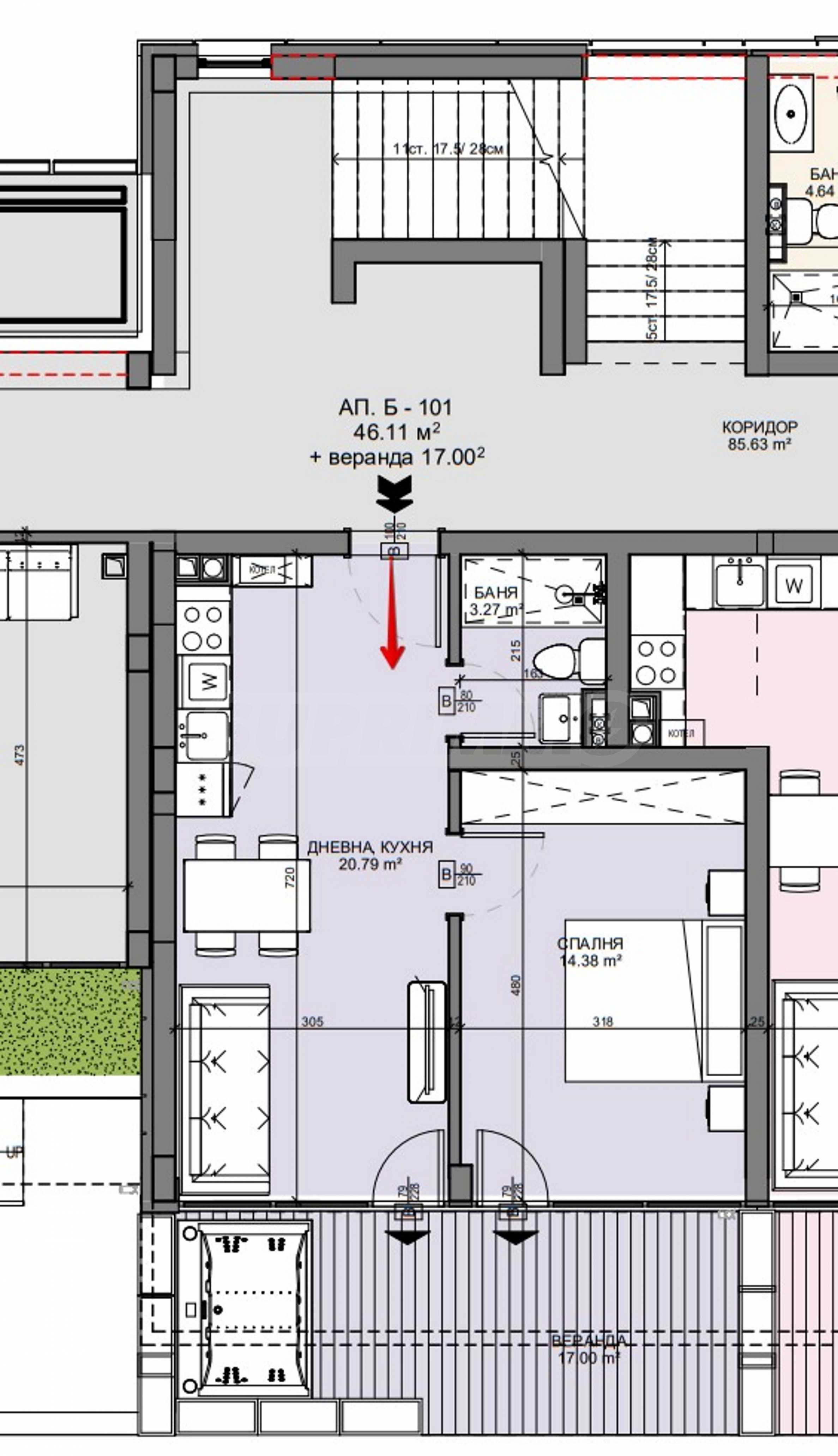 Разпределение: 1 спалня, кухненски бокс, хол, градинска тераса, баня/тоалетна, обща площ 73.28 кв.м. (нетна площ 46.08 кв.м. + общи части 10.20 кв.м.), плюс градина-тераса от 17.00 кв.м. - включена в общата площ и която е ценообразувана на половината цена от цената на жилищната площ.