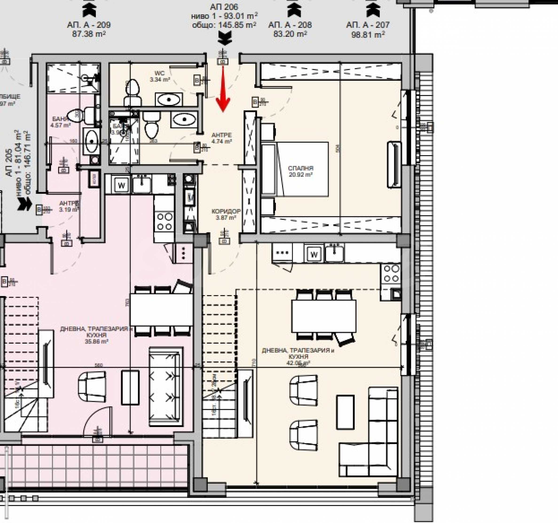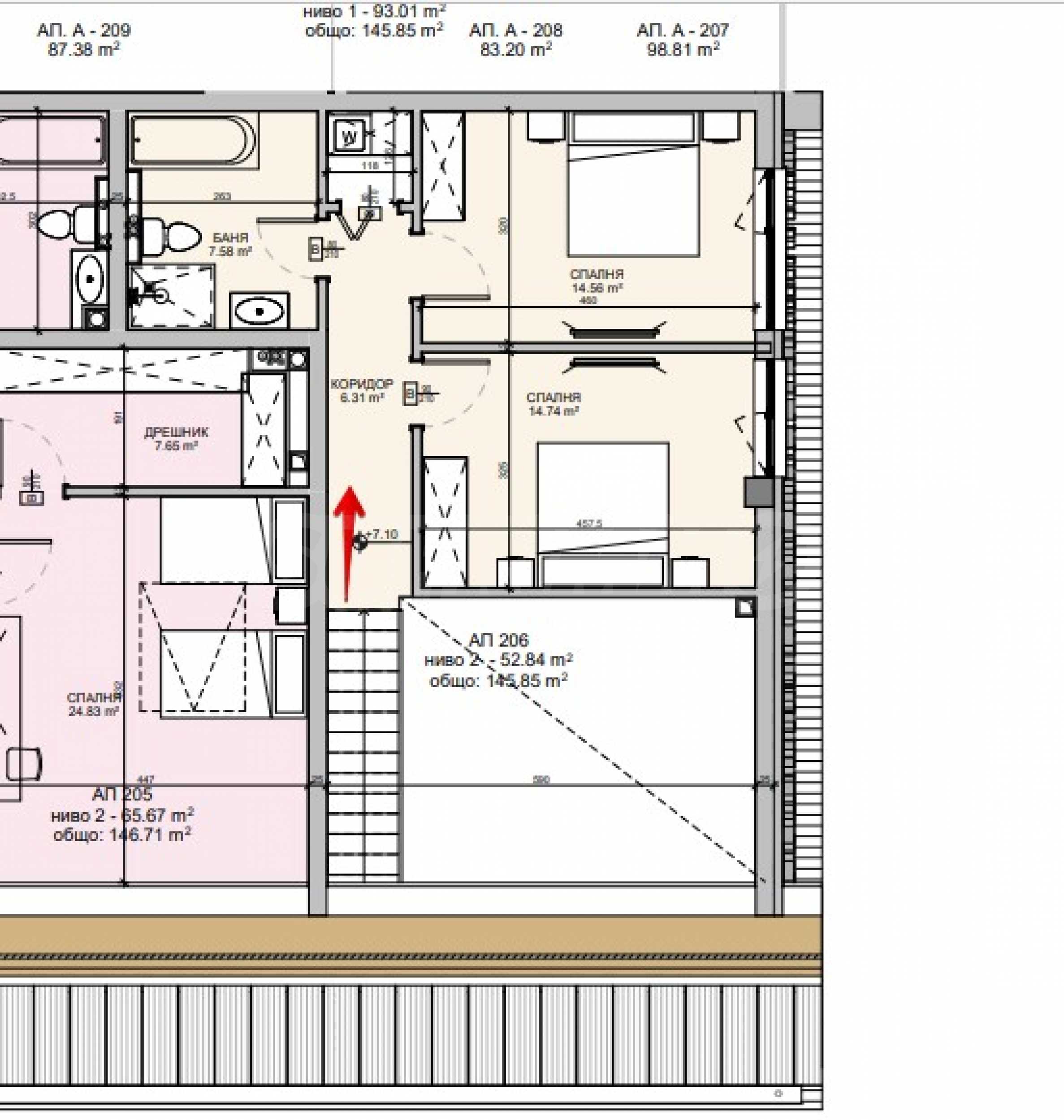 Имотът е ситуиран на 2-ри и 3-ти етаж и предлага 178.35 кв.м обща площ (нетна площ 145.59 кв.м + общи части 32.76 кв.м). Първият етаж се състои от антре, всекидневна с кухненски бокс, две спални, баня с тоалетна, отделна тоалетна, а ниво две разполага със спалня и баня с тоалетна.